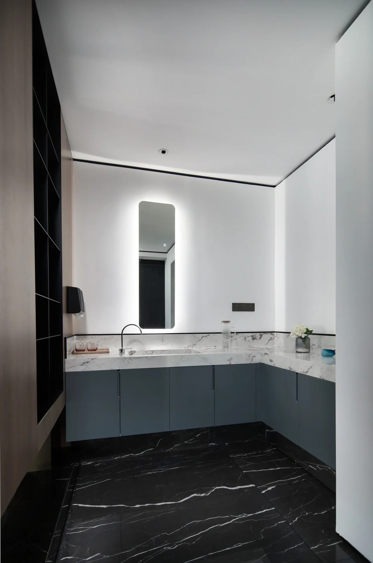 盥洗区空间灯光设计以光效为主,隐藏光源让空间更加深邃,让镜像更加清晰柔和。