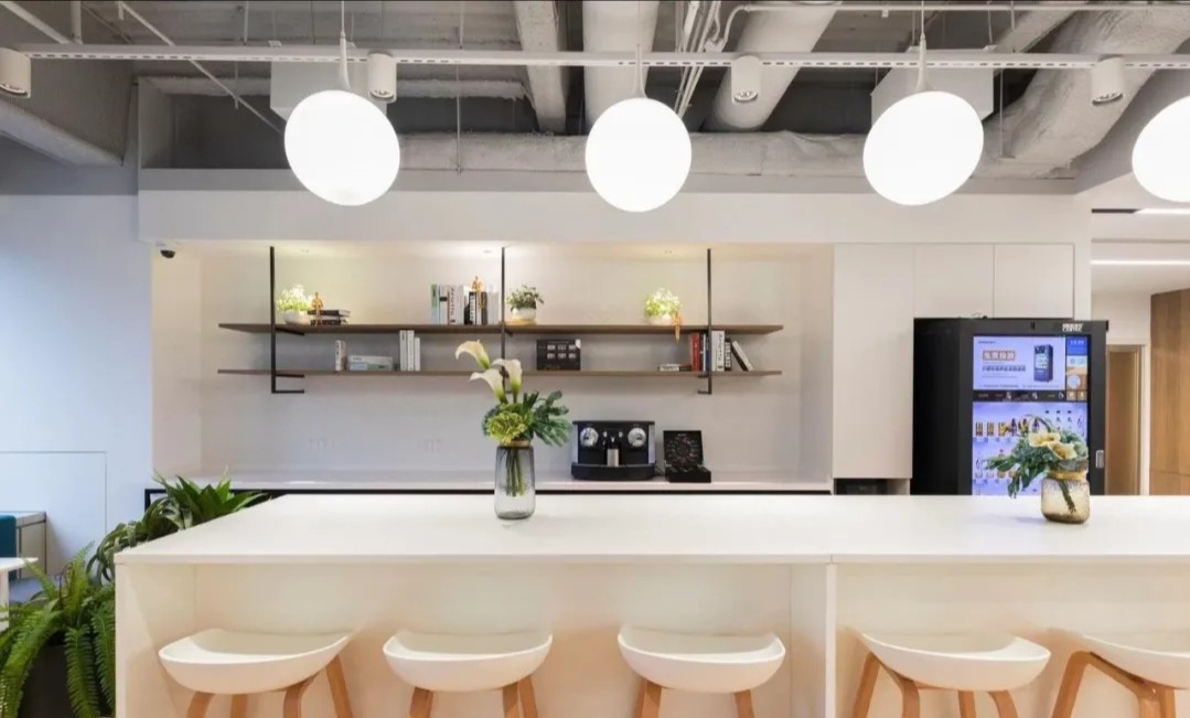 室内的布置尽入眼帘,解放盒子牢笼,打破传统隔间的办公环境,连接办公与休闲功能,构建一个会客、办公、选样、休闲的空间。中岛结合办公桌,这里是设计师头脑风暴的场所。餐厅,自然光线在空间肆意流淌,如卷轴横幅开展的大面窗景,拉长视觉尺度,柔和的光线及舒适的卡座,让人们从繁忙的工作状态中得到几许松弛。