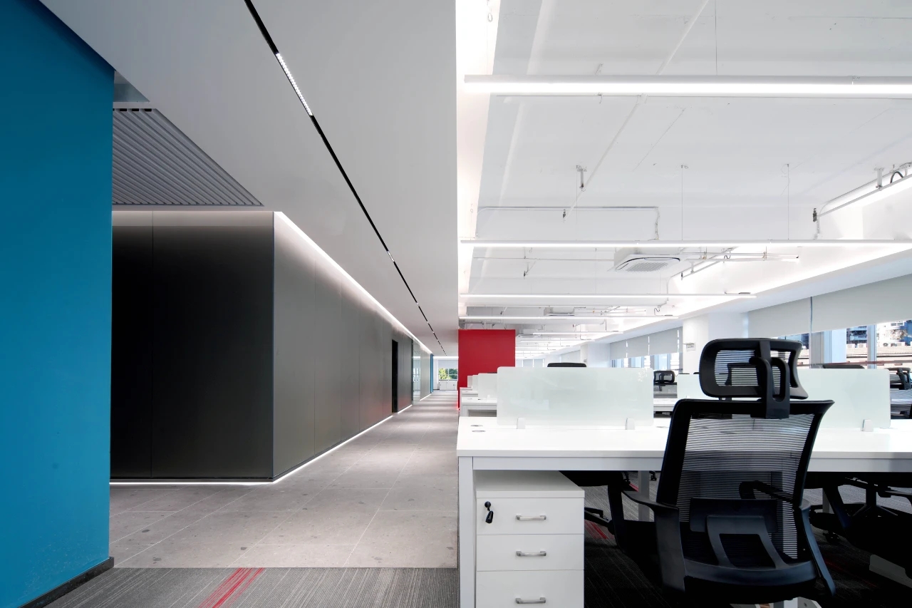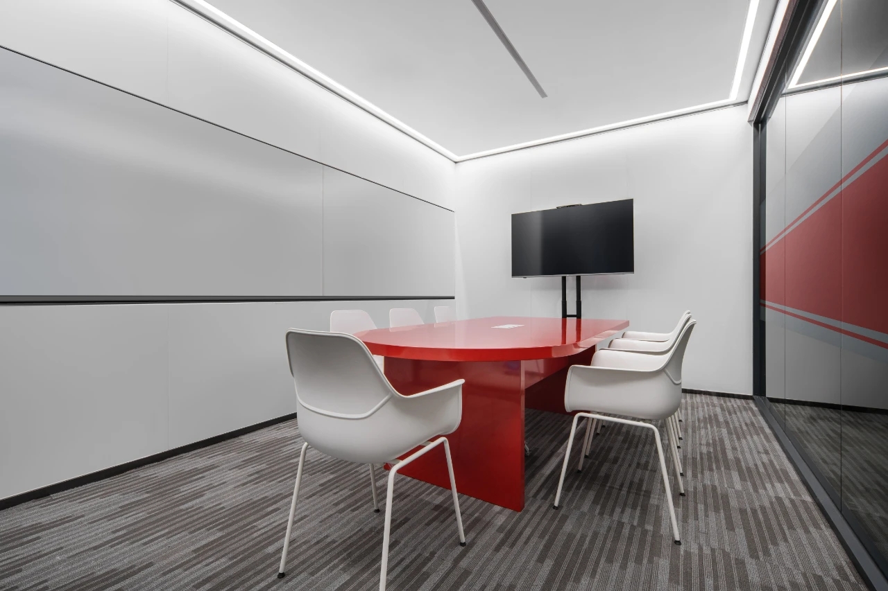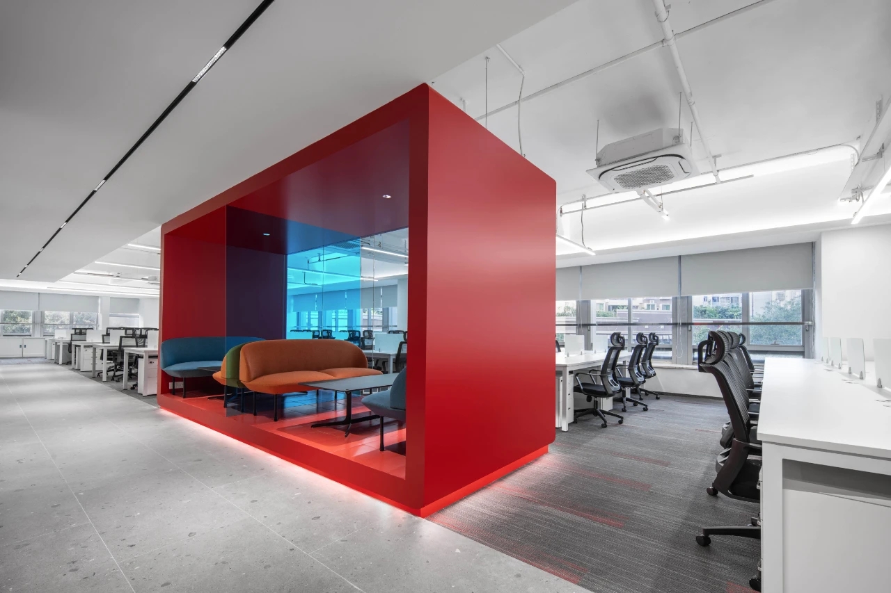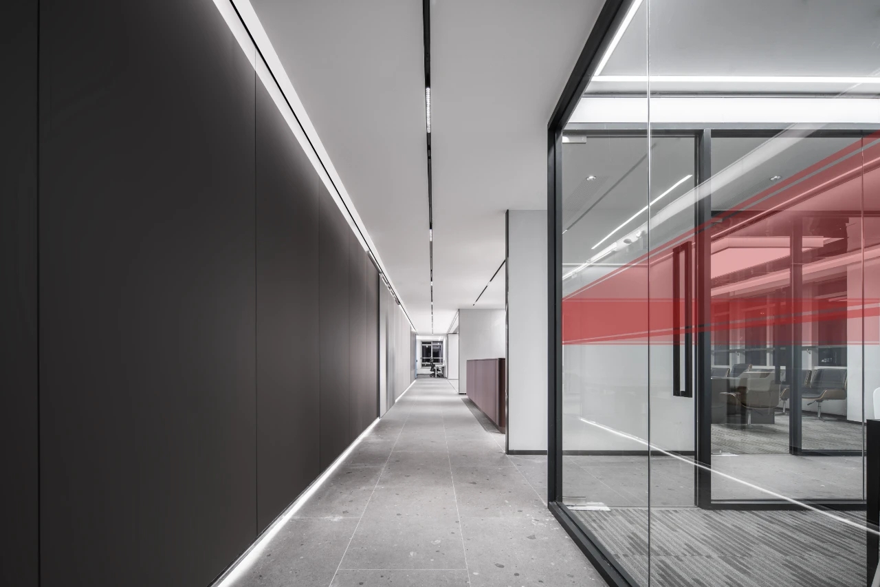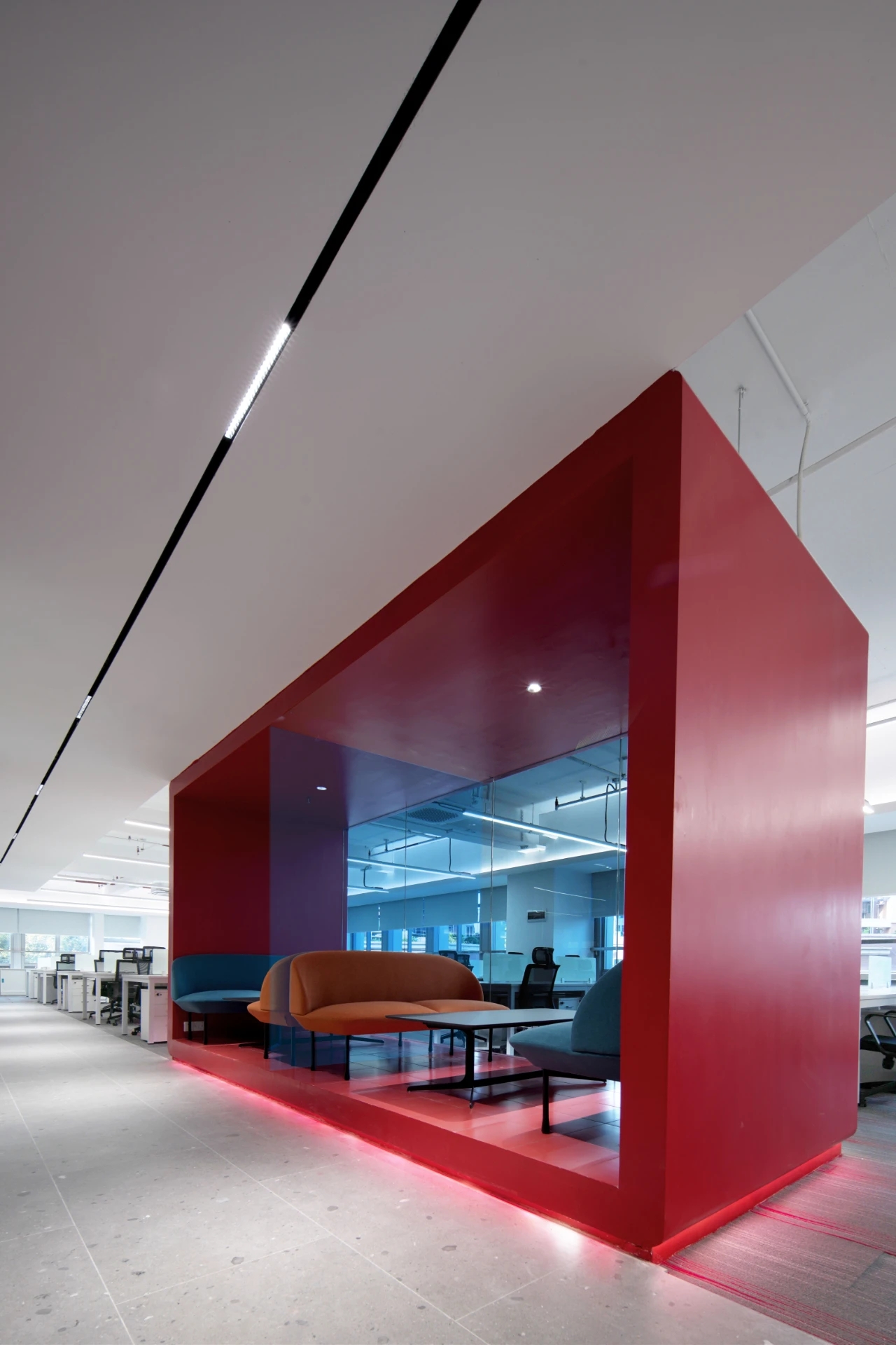 空间整体以低调的大片白色和局部灰色作为基调,穿插企业的形象色中国红、行业蓝色,形成鲜明的视觉冲击。白色,其在商业设计中,具有高级,科技的意象。将高纯度白色与空间的企业色通过中间调灰色调和,不仅提高企业色的纯净度,也弱化了纯度较高的企业色带给人的视觉压迫,表达无拘与率性、干练且利落的空间情绪