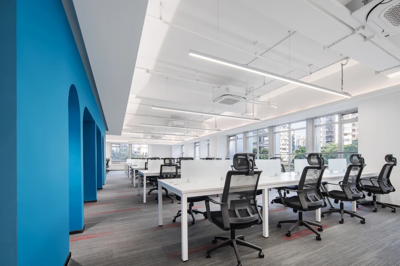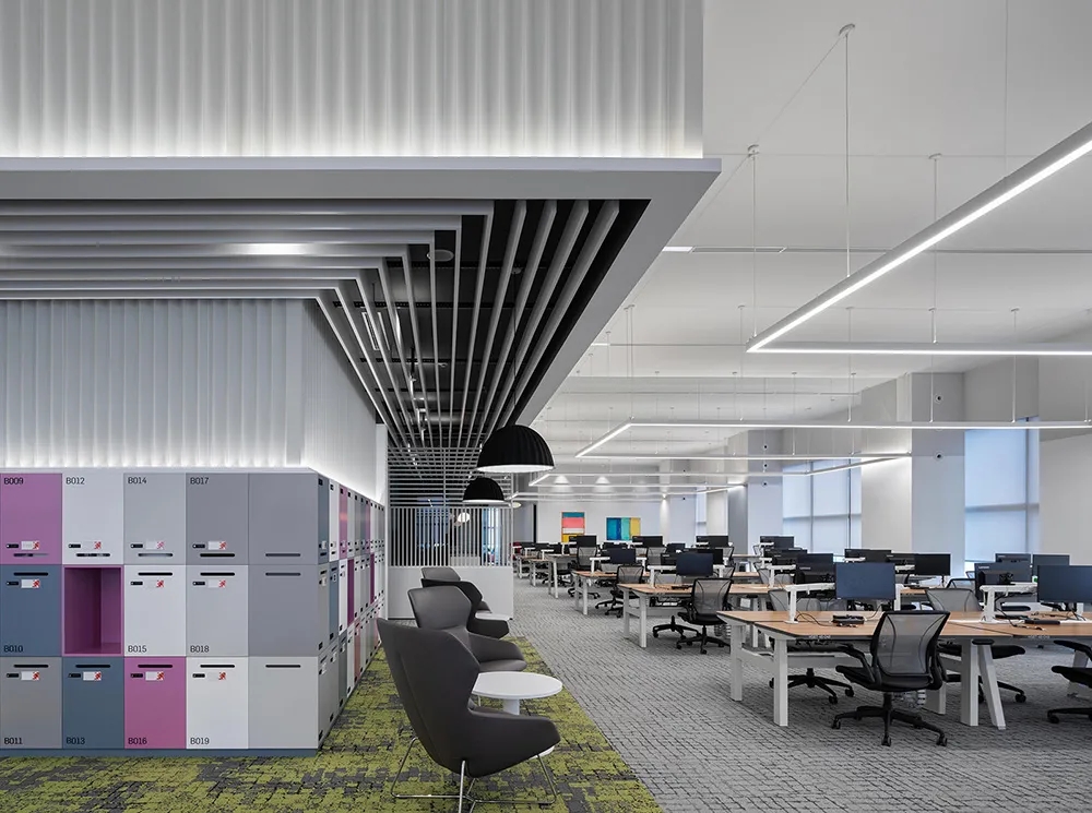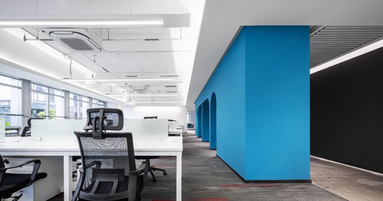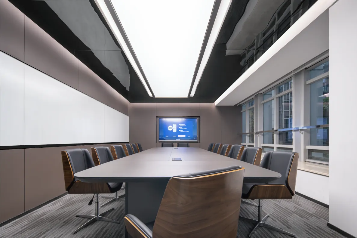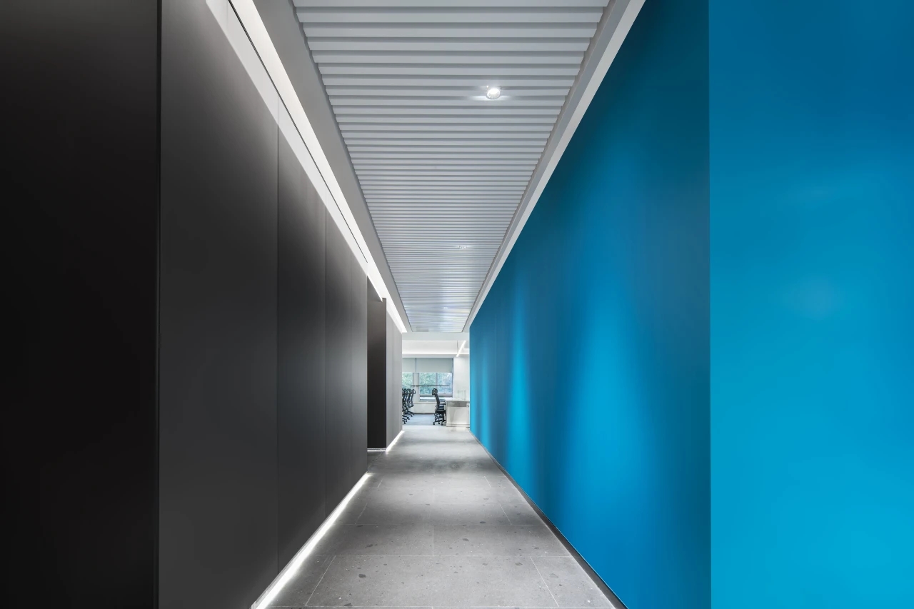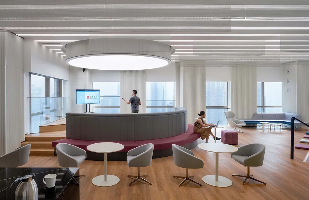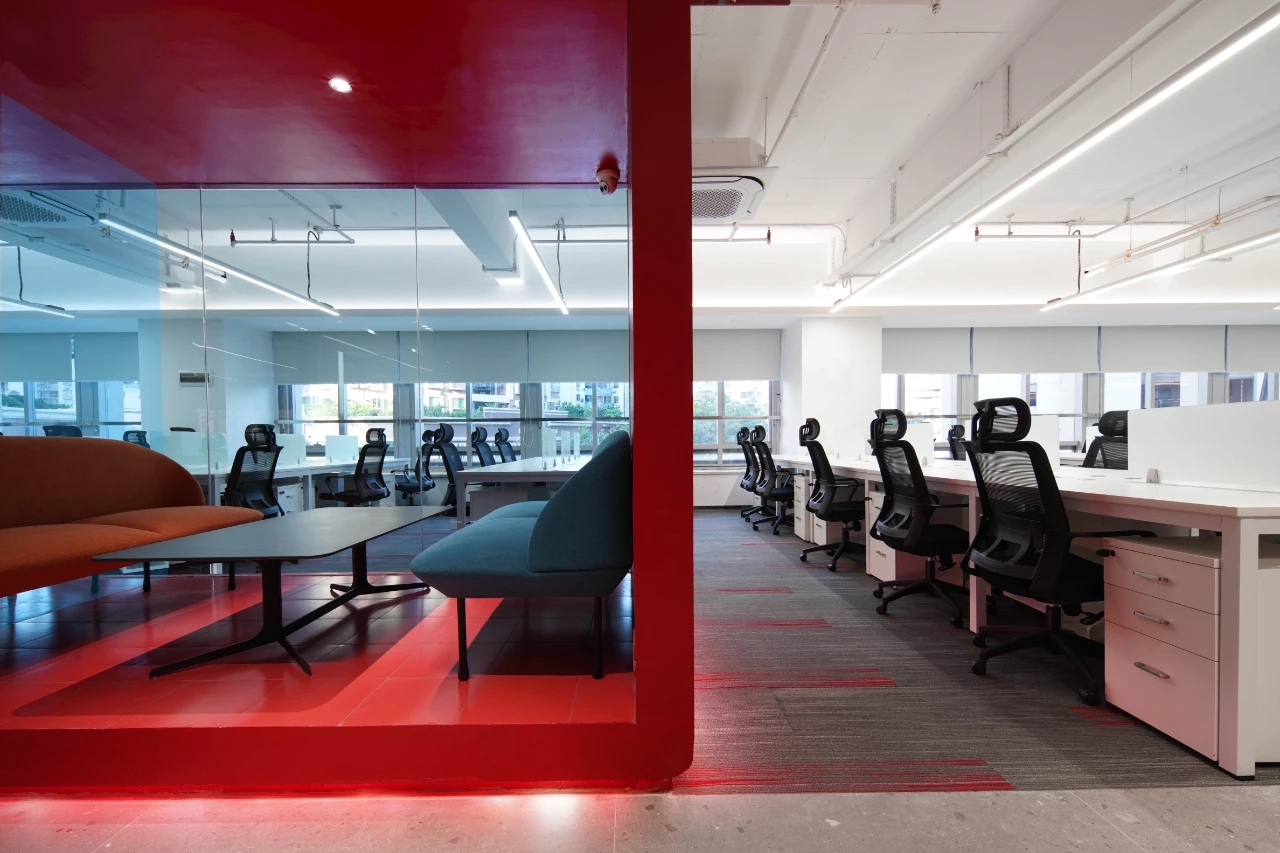 空间整体以低调的大片白色和局部灰色作为基调,穿插企业的形象色中国红、行业蓝色,形成鲜明的视觉冲击。白色,其在商业设计中,具有高级,科技的意象。将高纯度白色与空间的企业色通过中间调灰色调和,不仅提高企业色的纯净度,也弱化了纯度较高的企业色带给人的视觉压迫,表达无拘与率性、干练且利落的空间情绪