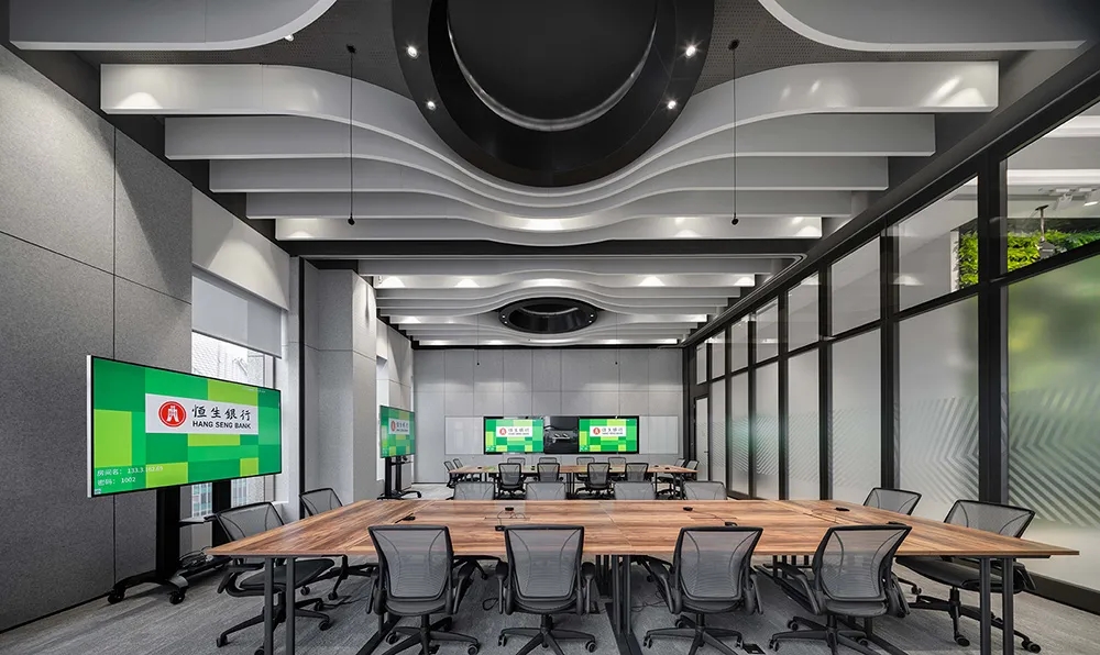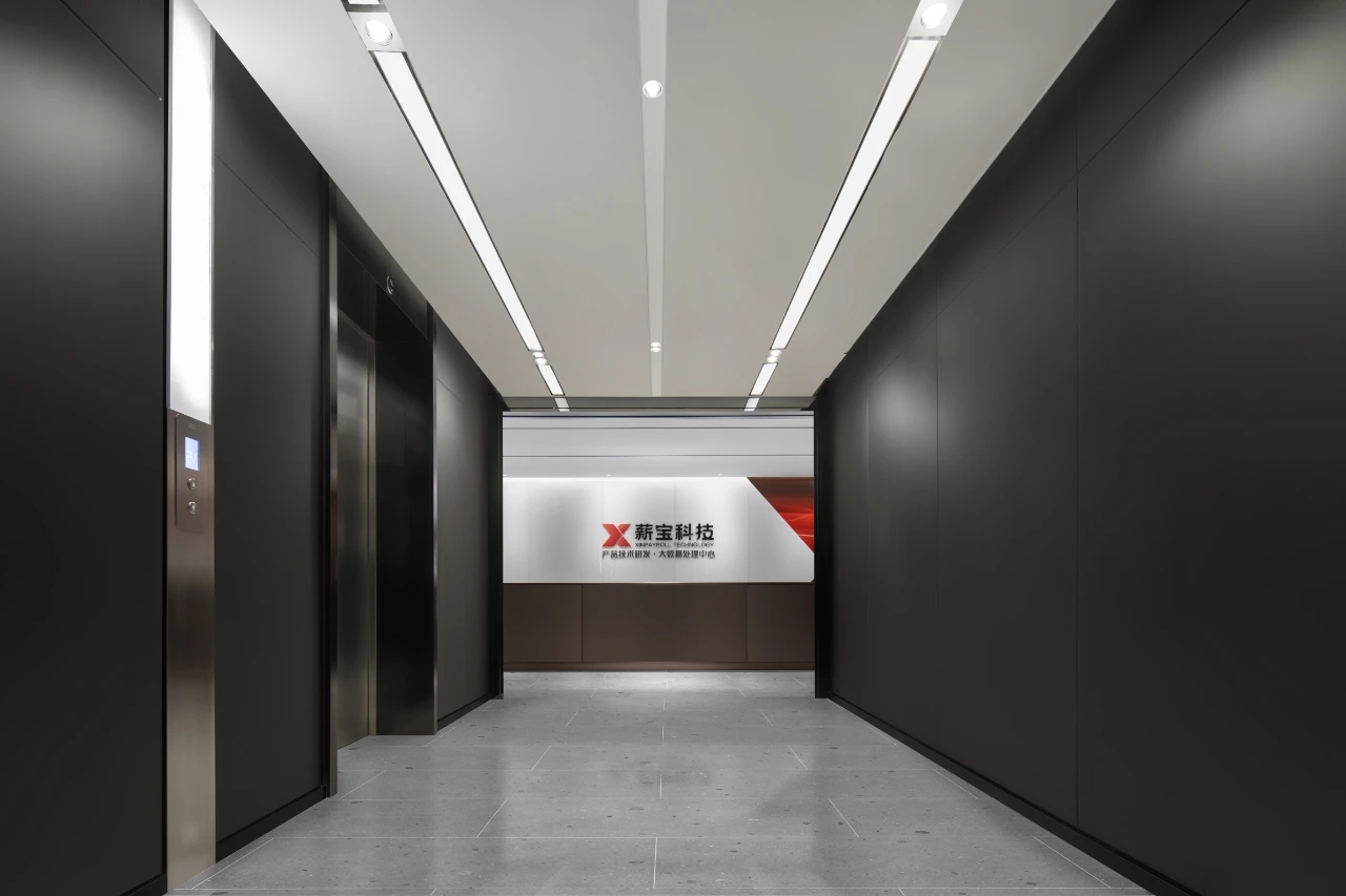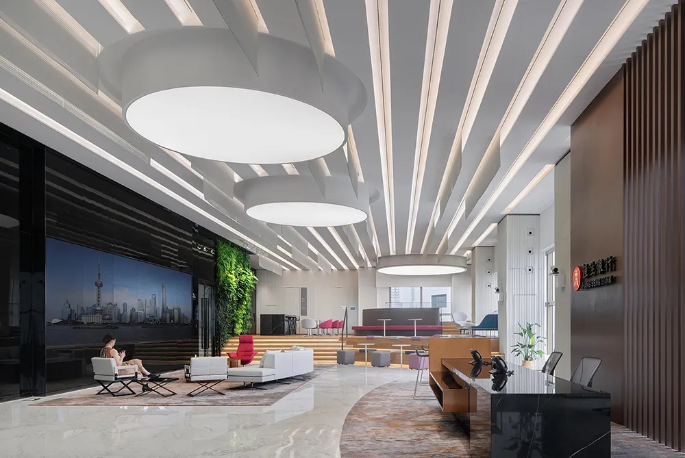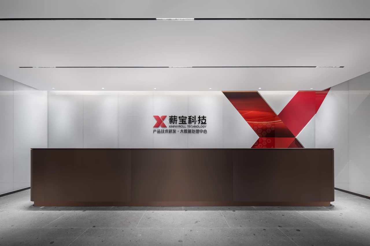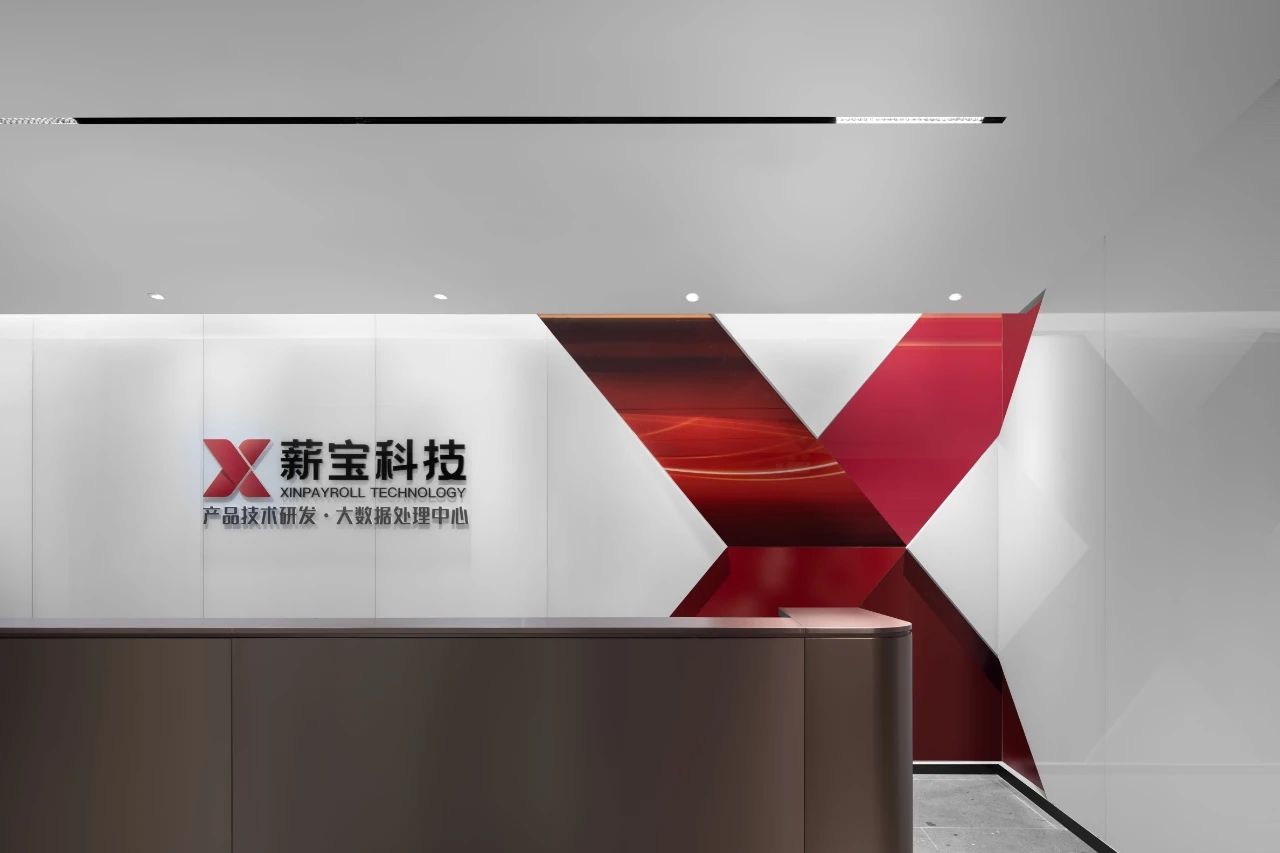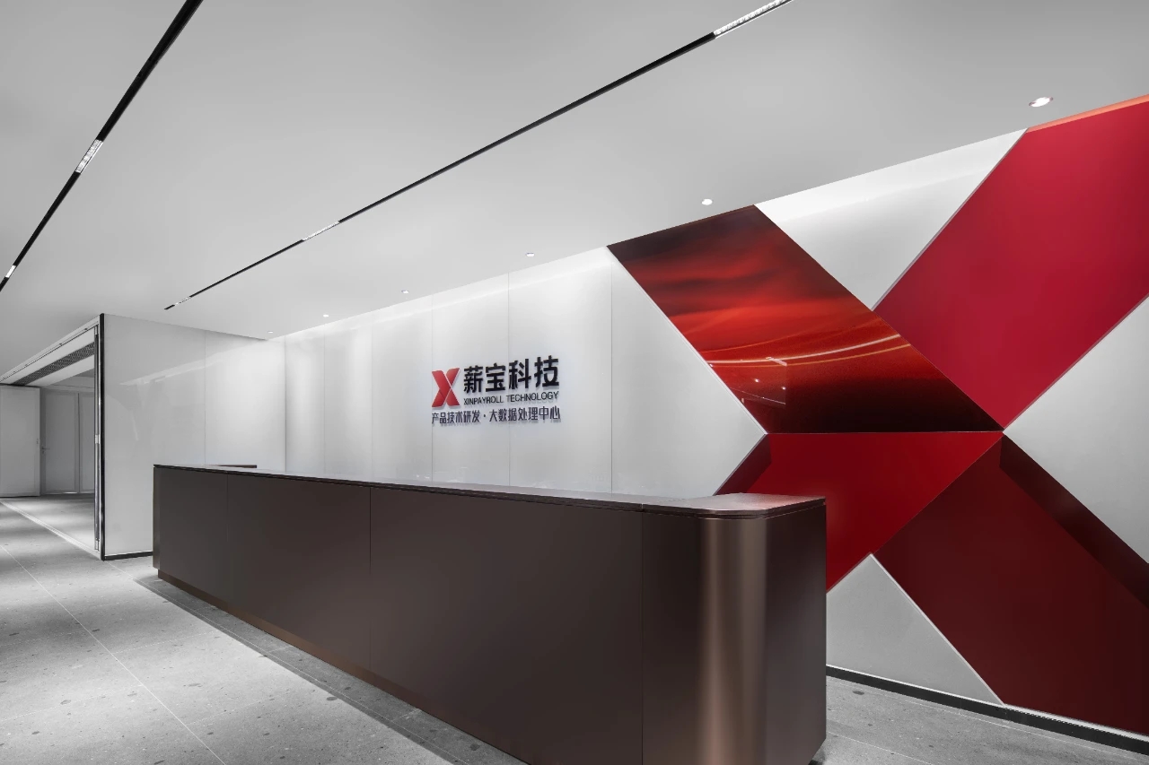 一进入前厅接待区,就会被耀眼的红色标志吸引,在白色的基底上立入巨型标志,与横向的空间流线形成对立的空间形态 ,在破立之间呈现企业创新精神。