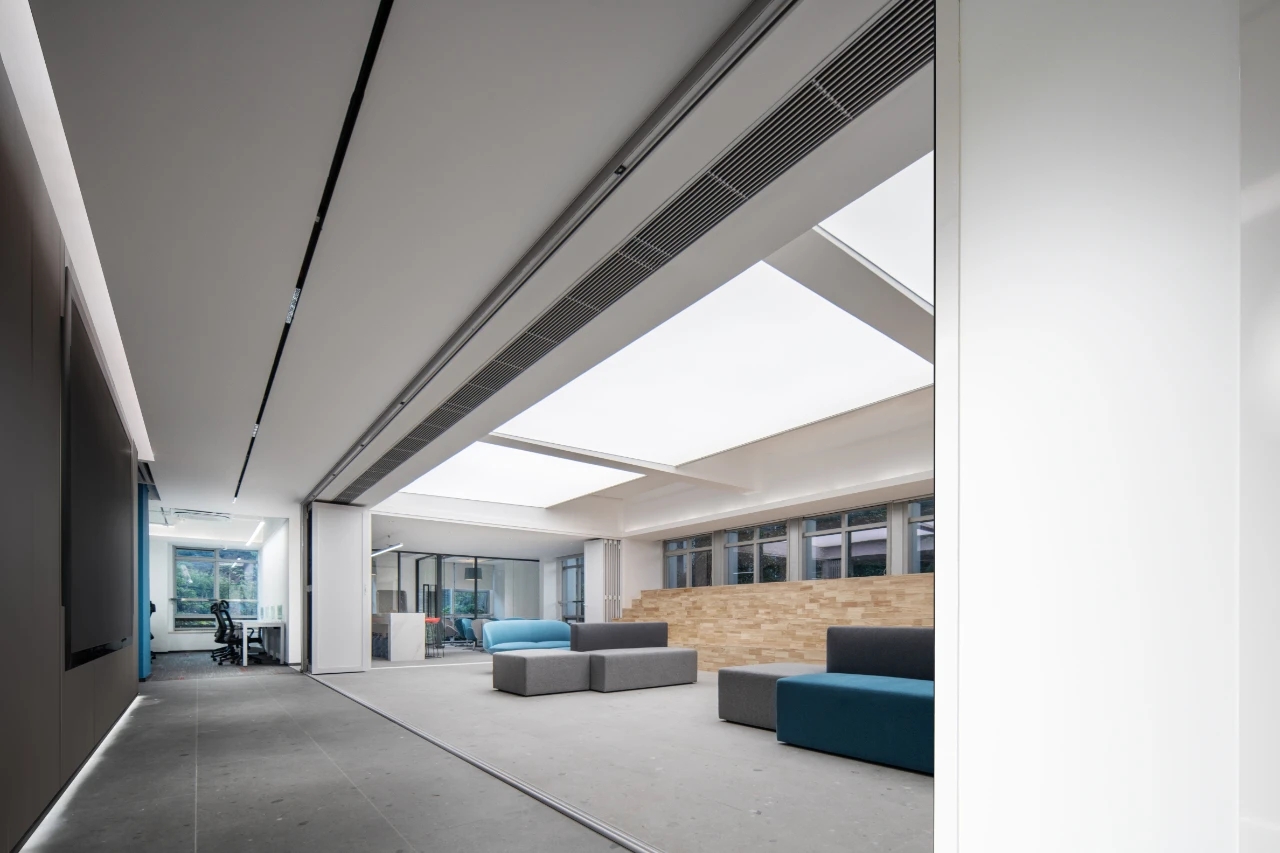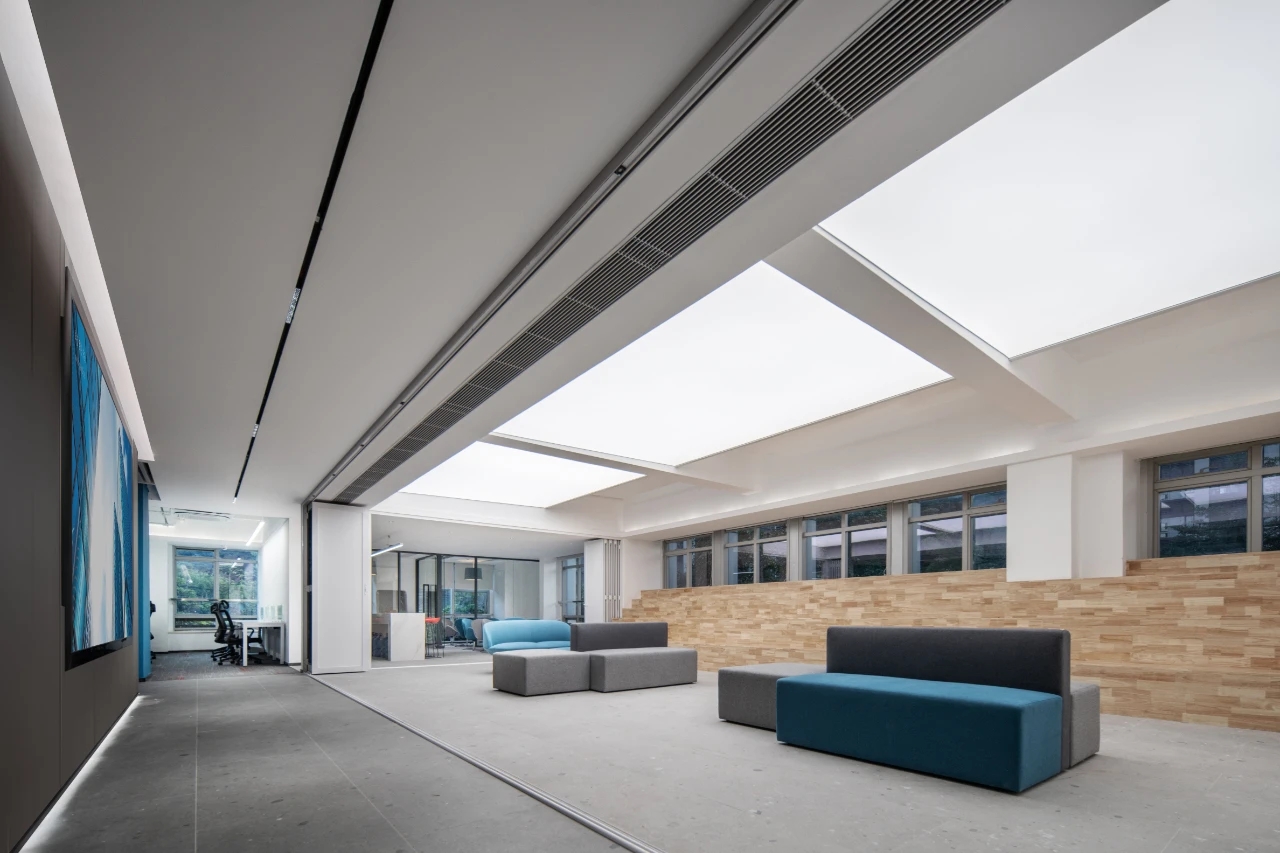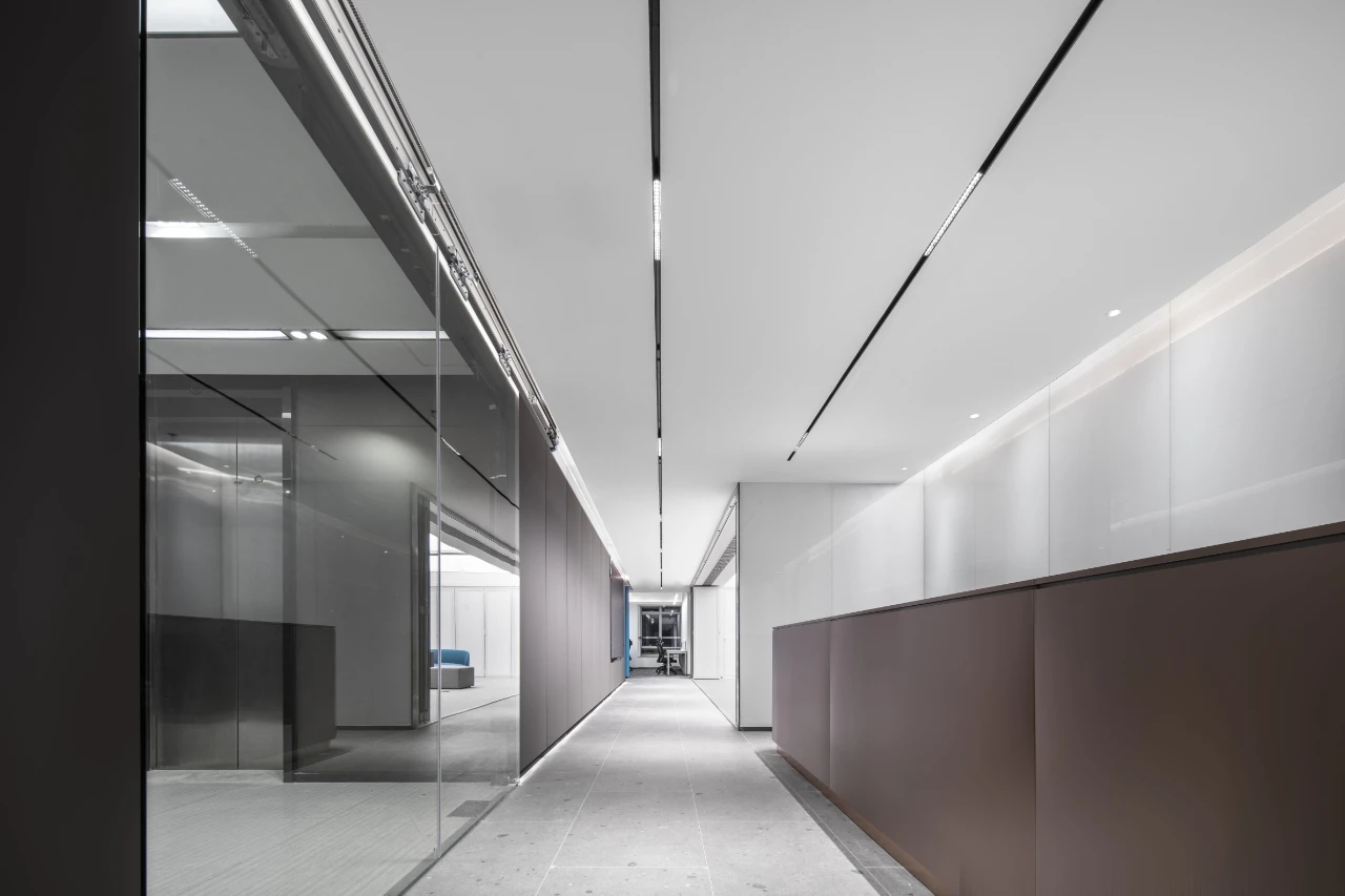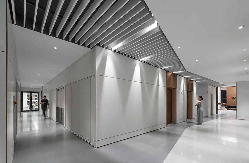 入口处成洄游动线,使办公室保持一种更为私密的环境与神秘感。大片的光引导着方向,往里走,空间便慢慢地呈现,直至豁然开朗,如同《桃花源记》开篇中所描述的那样:初极狭,才通人。复行数十步,豁然开朗。