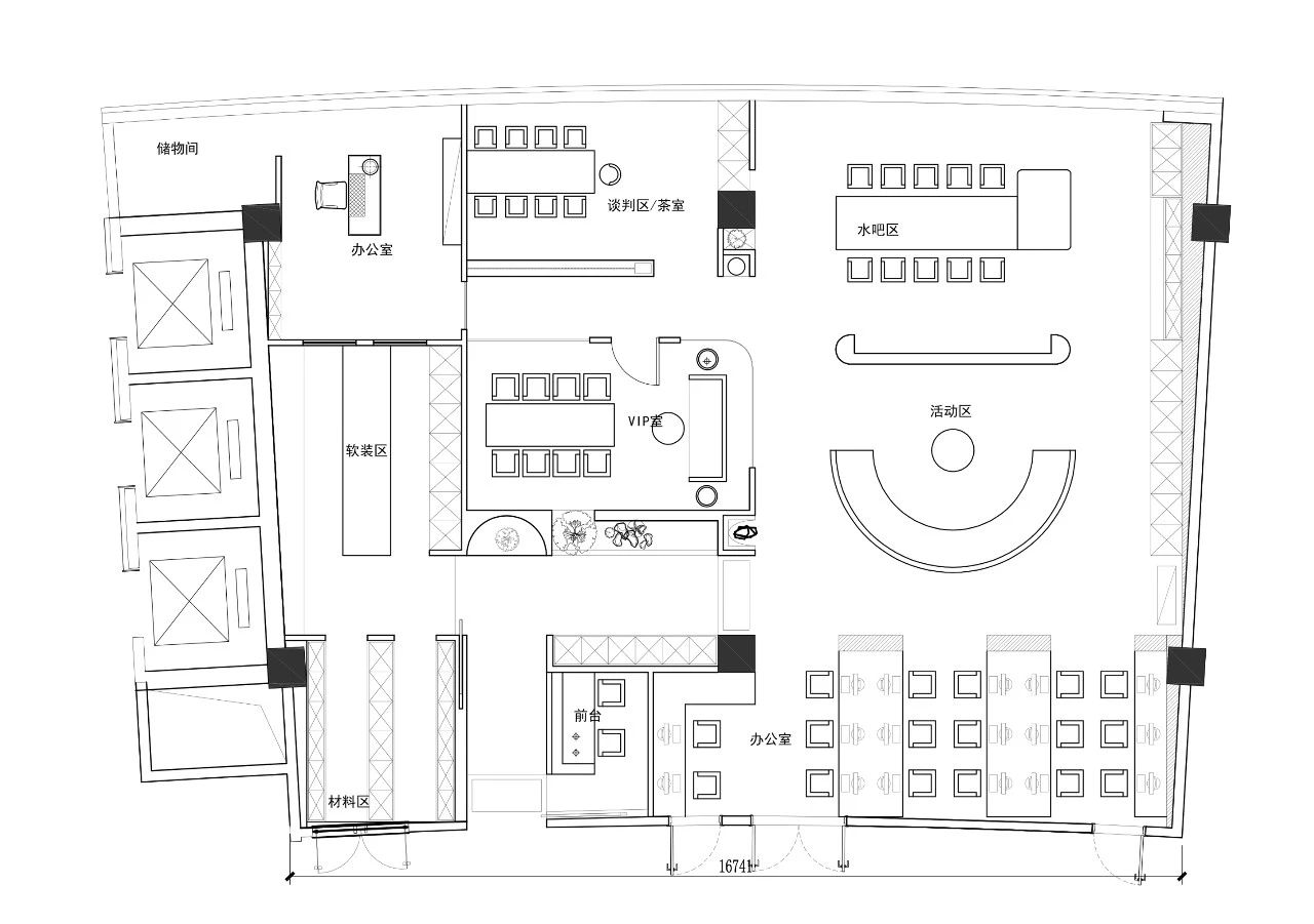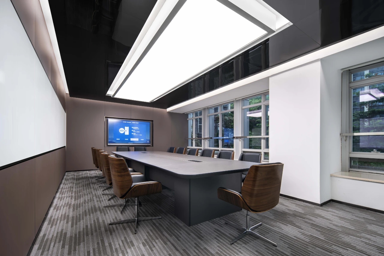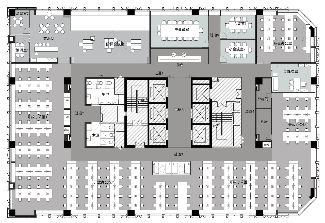 空间整体规划依附于建筑的核心筒往四周延展,在核心筒的“盒子”周边植入四个独立的盒子,让原有的柱子消隐在空间中,几个“盒子”围合成相对独立的环形通道,并将空间的分割成四个区域:接待区、沙龙活动区、会议区、办公区。多元的空间满足企业的发展需求,以核心筒的“盒子”为中心点,设计师采用“环形”的动线设计,将空间分化成不同的工作区域向其四周进行分流,各个空间围绕电梯间进行依次分布。每个空间都可以自由贯穿,增强空间的共享性和互动性。打造秩序清晰、协同、独立而又能自由扩展的流动性办公空间。