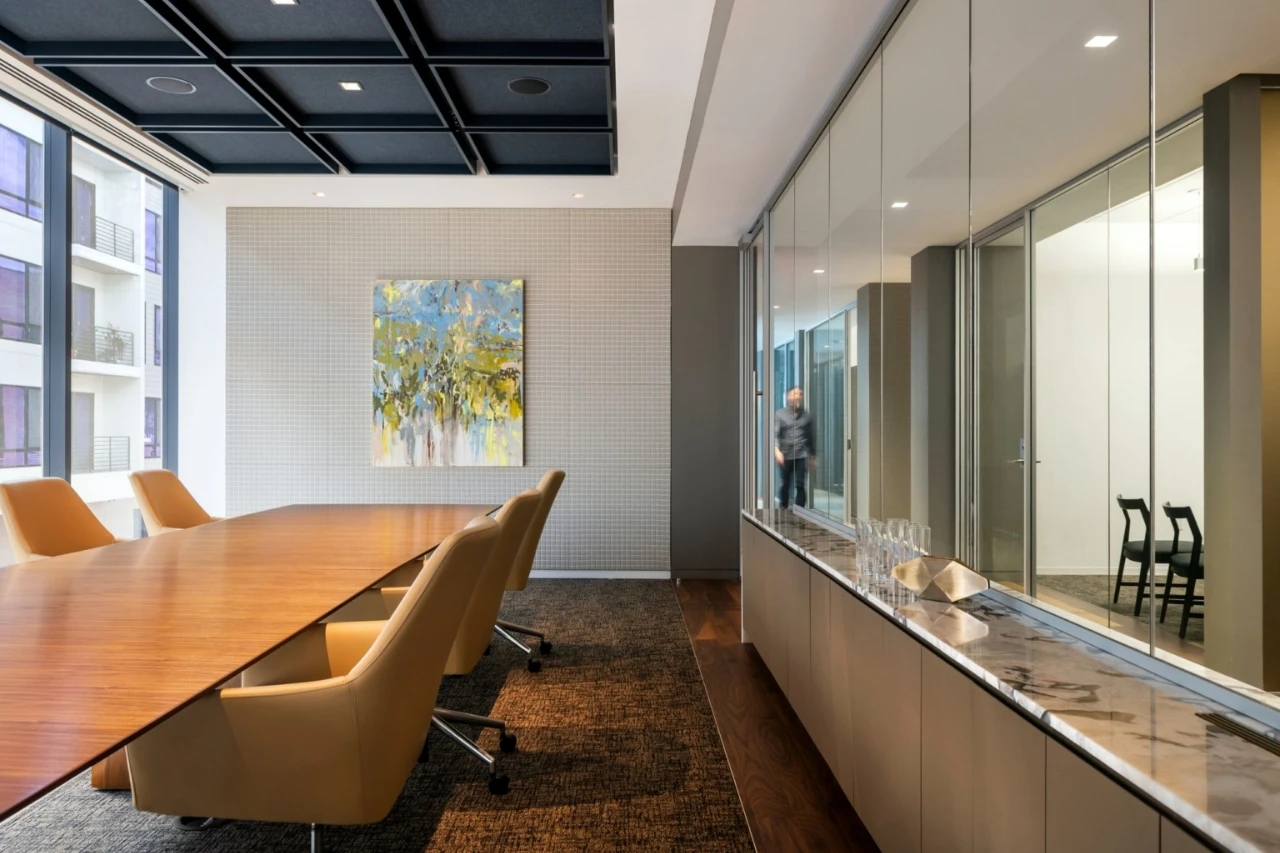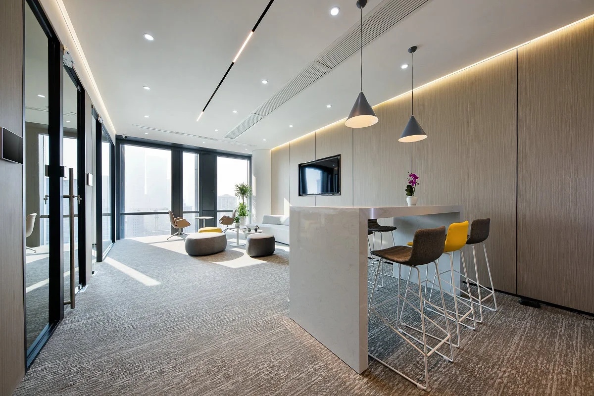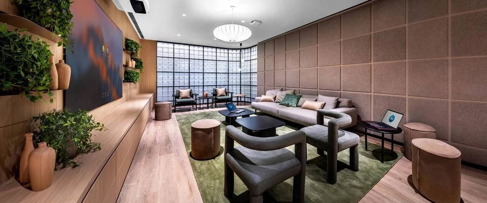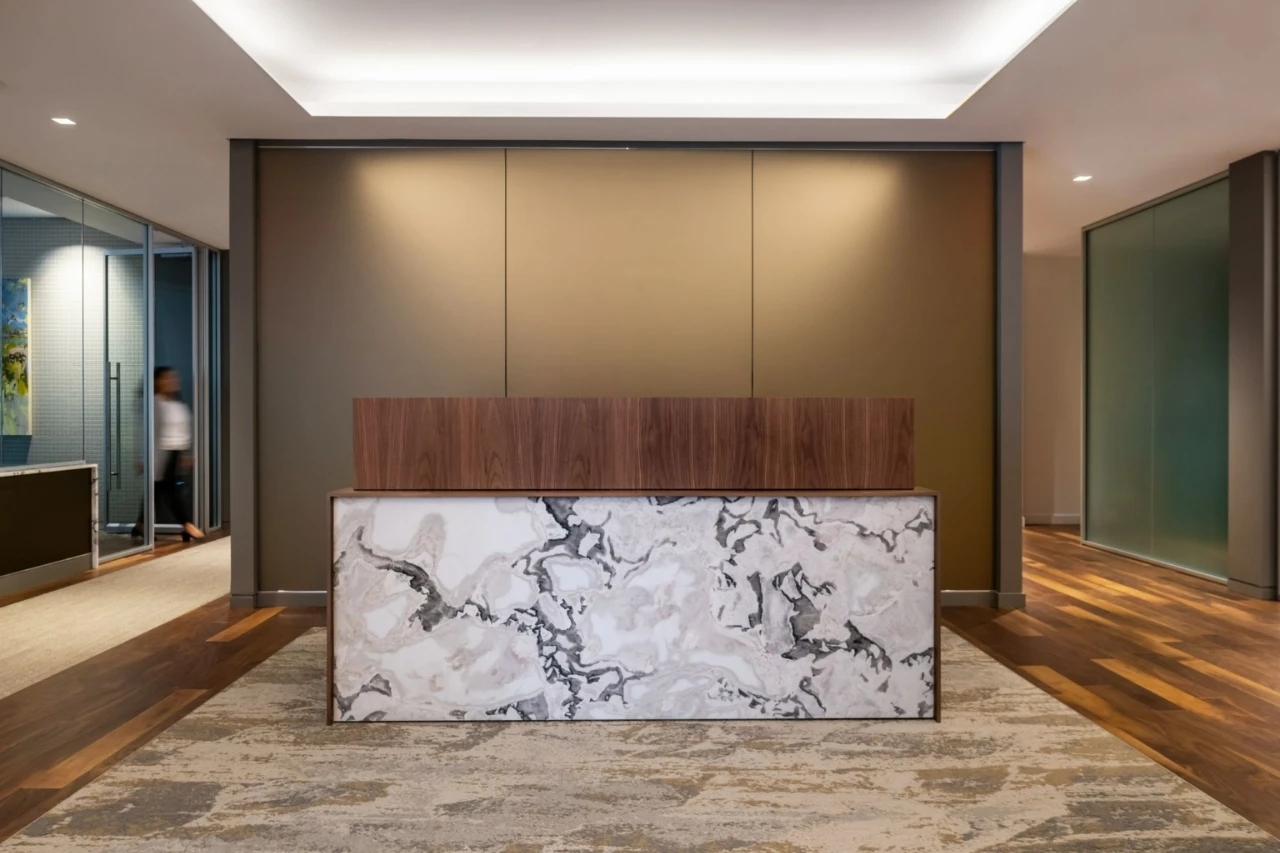半私人套房设有开放式工作站,可容纳人力资源和会计部门。除了两间董事会议室和行政酒廊空间外,员工还可以使用带健身器材和淋浴的健康套房。楼下有无数的餐饮场所,两个小茶水间主要作为员工的饮料中心。量身定制的优雅设计理念从现代西装中汲取灵感,利用纹理和分层材料来增加深度,传达品牌的客户体验和对细节的关注。