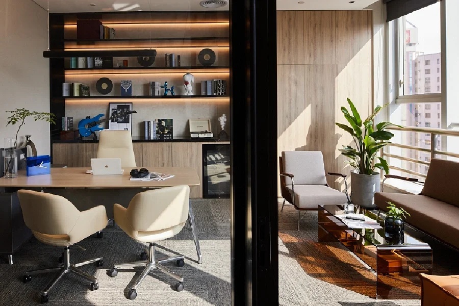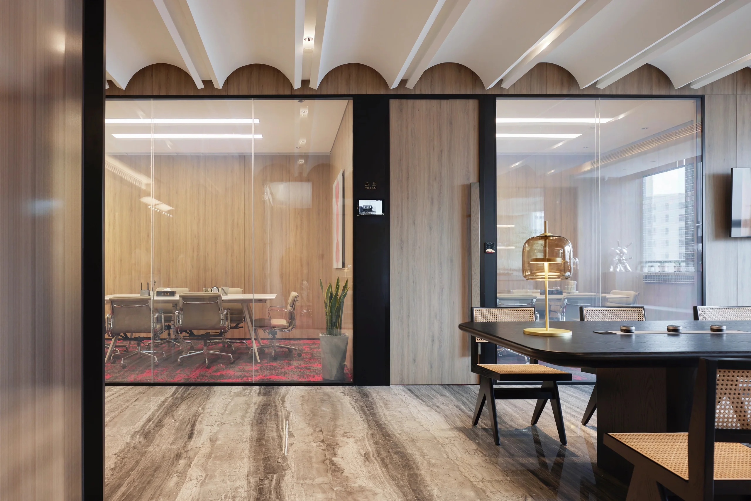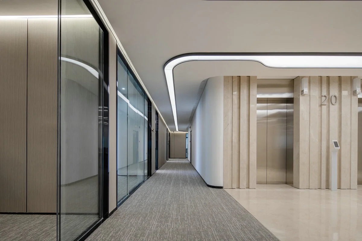 规划最大限度地增加了私人办公室的数量,以满足高管的需求 - 其大部分员工都是负责国家收购和管理的人员。落地窗为周边办公室提供充足的阳光,而室内办公室需要更多创造性的解决方案来扩大自然,包括在双层走廊中引入洗墙灯和玻璃墙。此外,地板和天花板饰面从走廊延伸到办公空间,营造出开放、通风的效果。