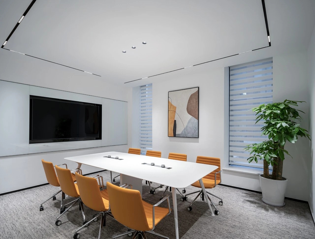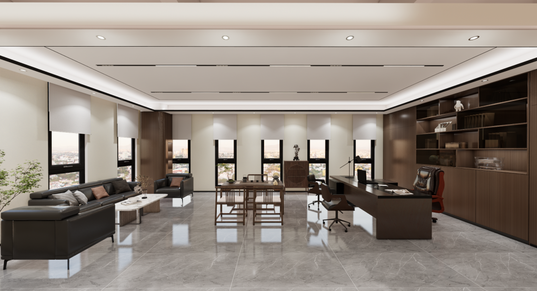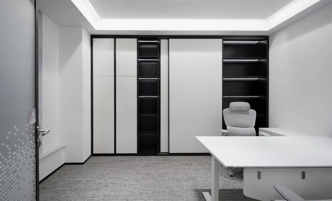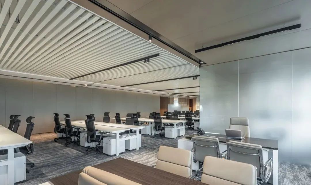 根据企业文化和空间特点进行设计思考,注重整体色调的协调性和美感,采用具有未来感的高级灰做为主色调,搭配深色石材和金属细节,赋予整个空间深邃感和稳重感。另外,为了营造舒适的环境,地面选用吸音材料增强空间隔音效果。