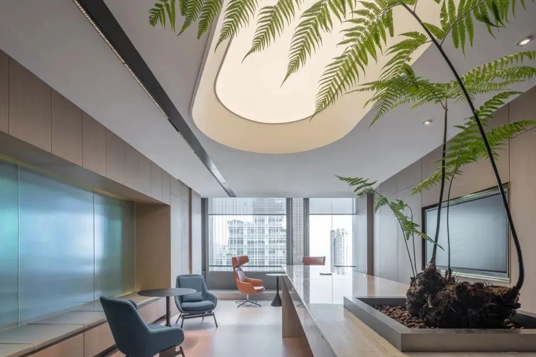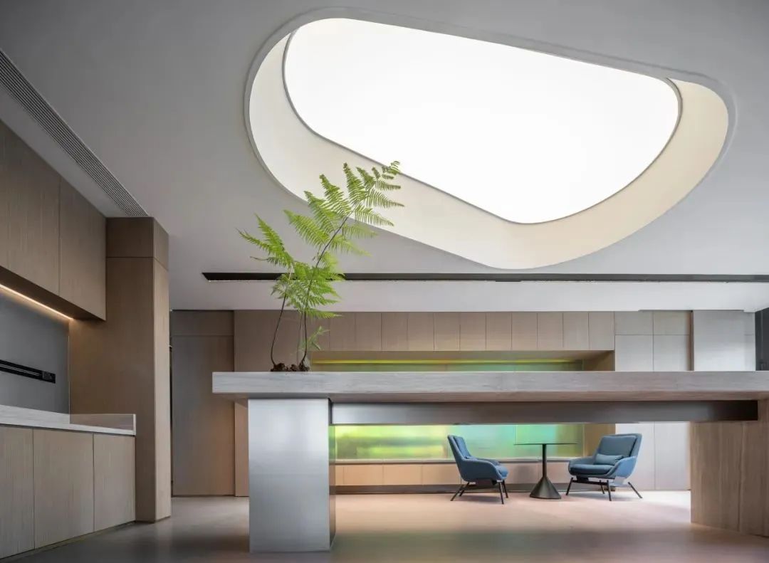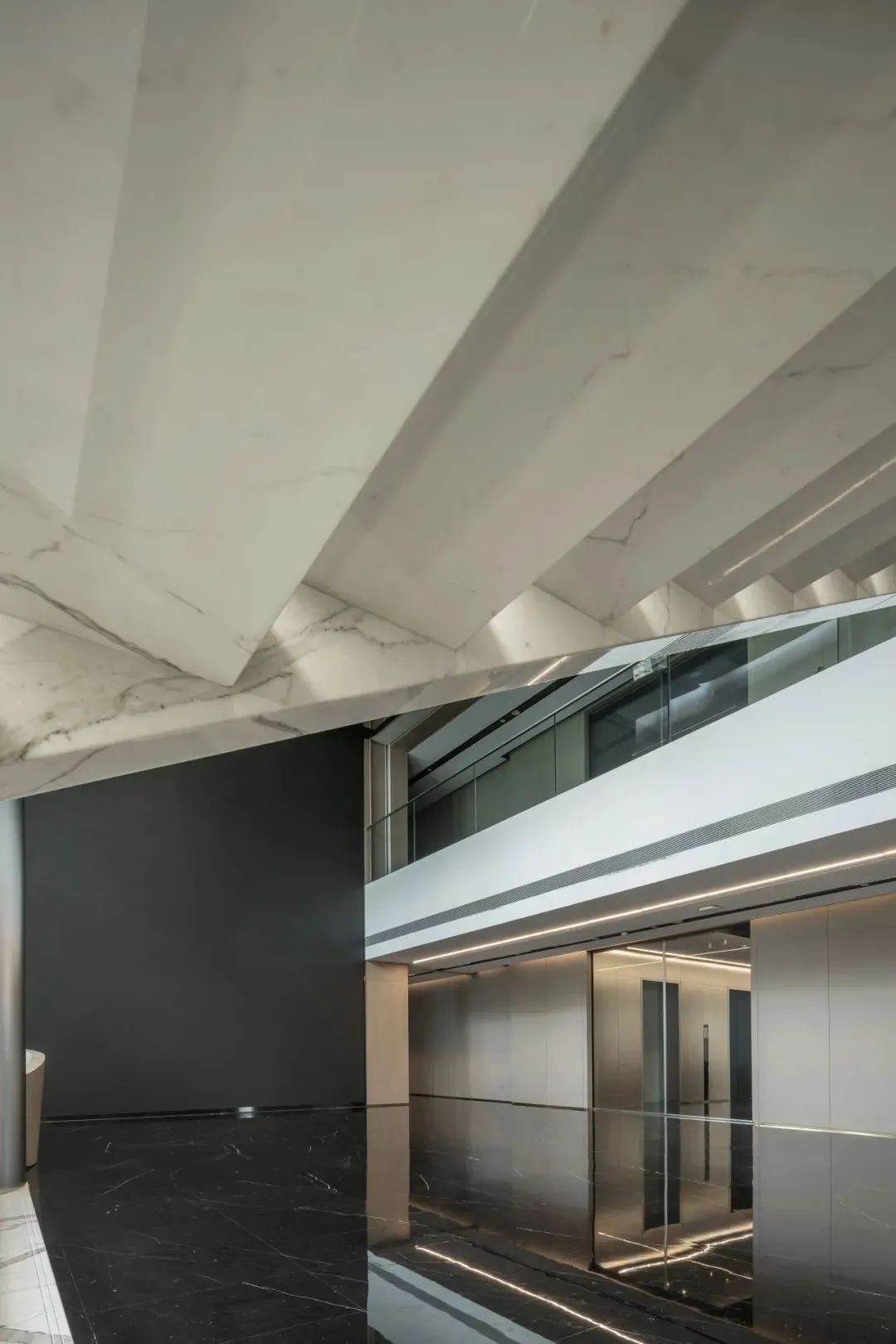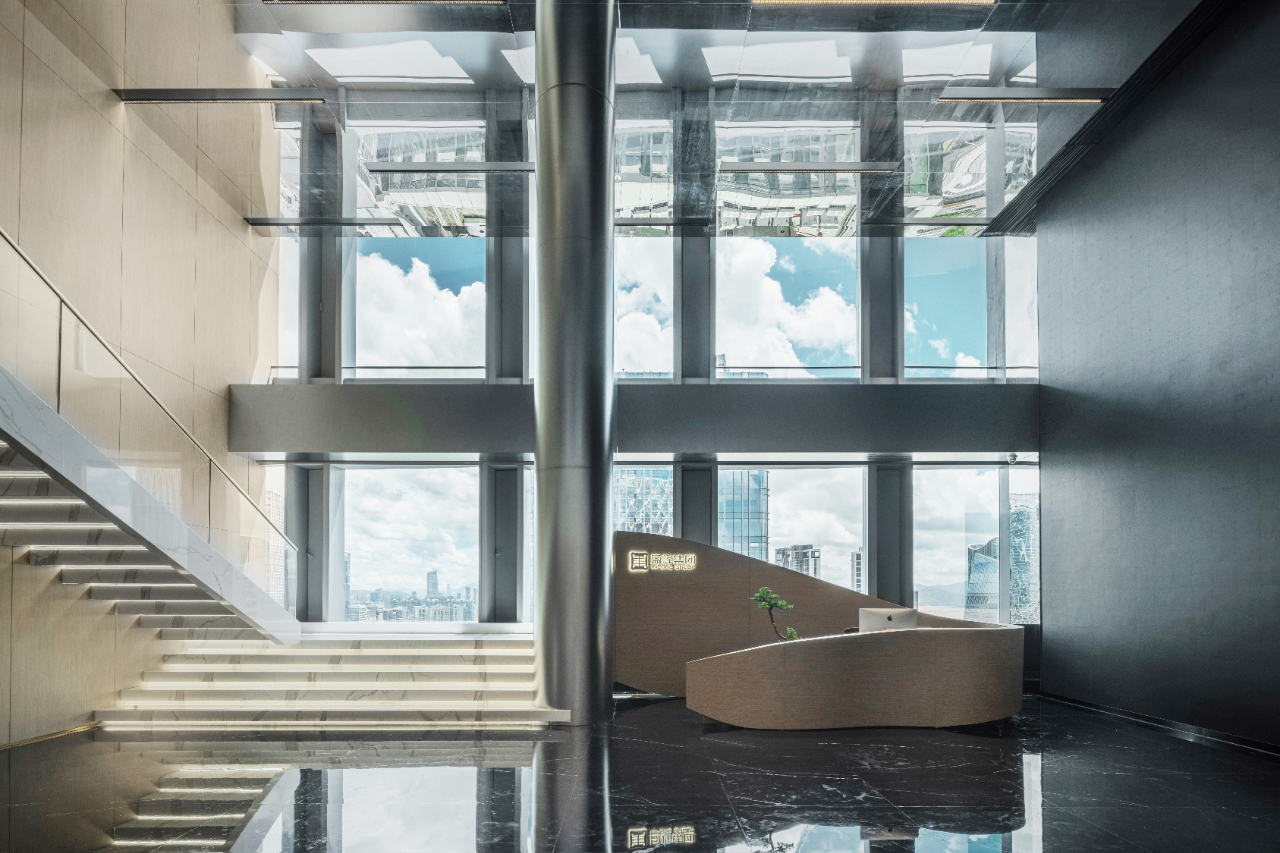 尊重场地特性,利用建筑结构特点,在横向尺度有限的条件下,尽可能实现空间的开放性和通透感,大胆尝试利用简化重构的设计手法,拓宽空间的纵向尺度,从而营造符合企业属性的简约、大气空间氛围。注重自然光和人工光结合,采用裙楼天窗及镜面天花,多角度引入自然光,搭配个性灯饰灯光,呈现独特光影效果。