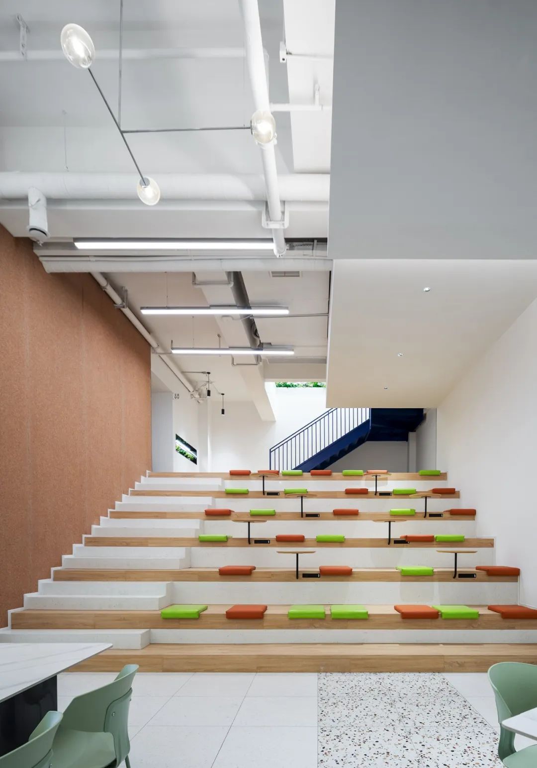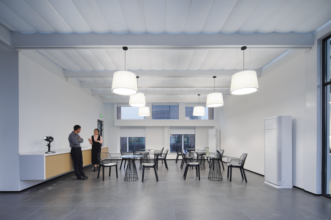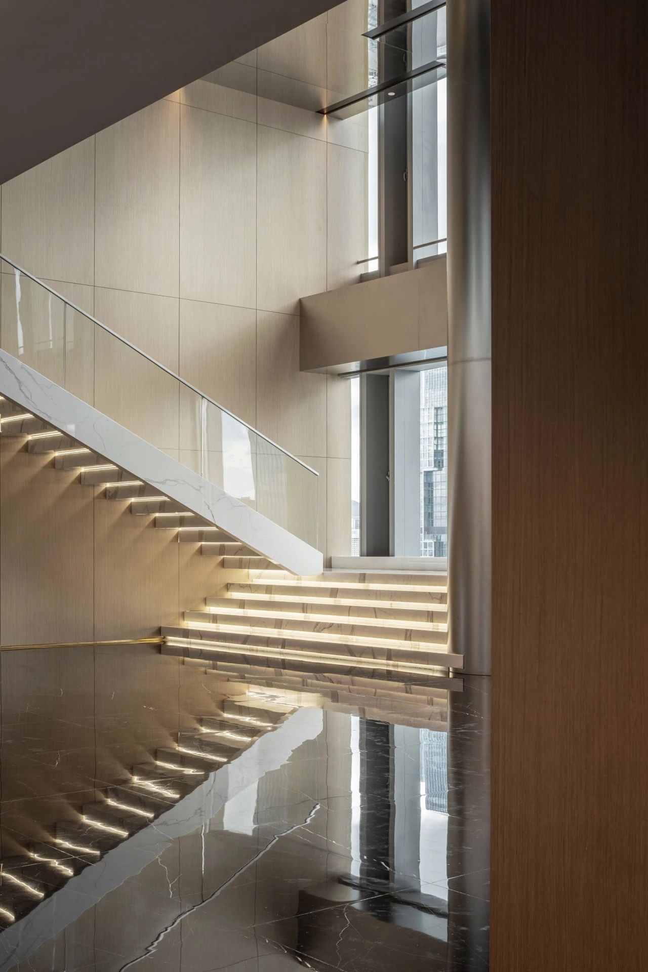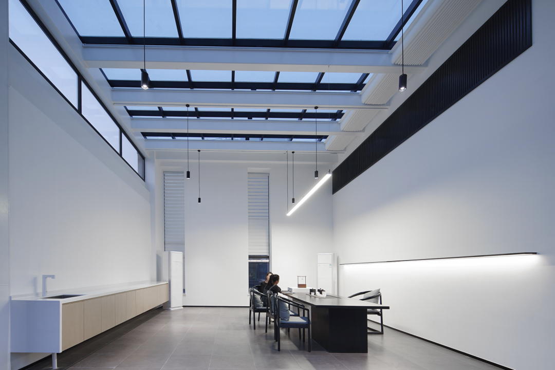 尊重场地特性,利用建筑结构特点,在横向尺度有限的条件下,尽可能实现空间的开放性和通透感,大胆尝试利用简化重构的设计手法,拓宽空间的纵向尺度,从而营造符合企业属性的简约、大气空间氛围。注重自然光和人工光结合,采用裙楼天窗及镜面天花,多角度引入自然光,搭配个性灯饰灯光,呈现独特光影效果。