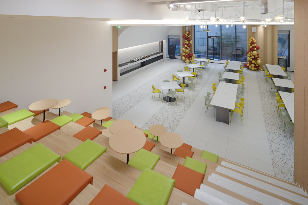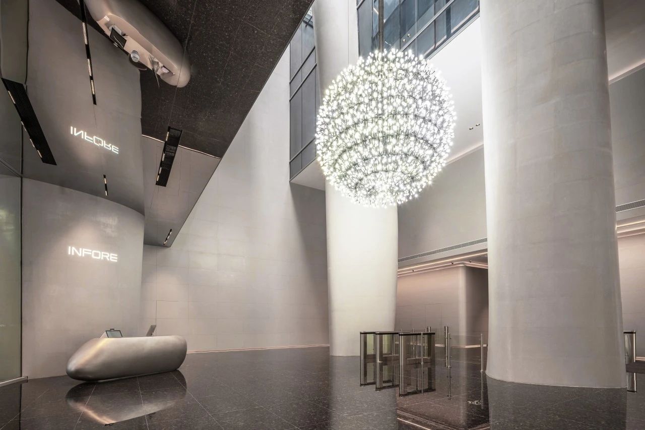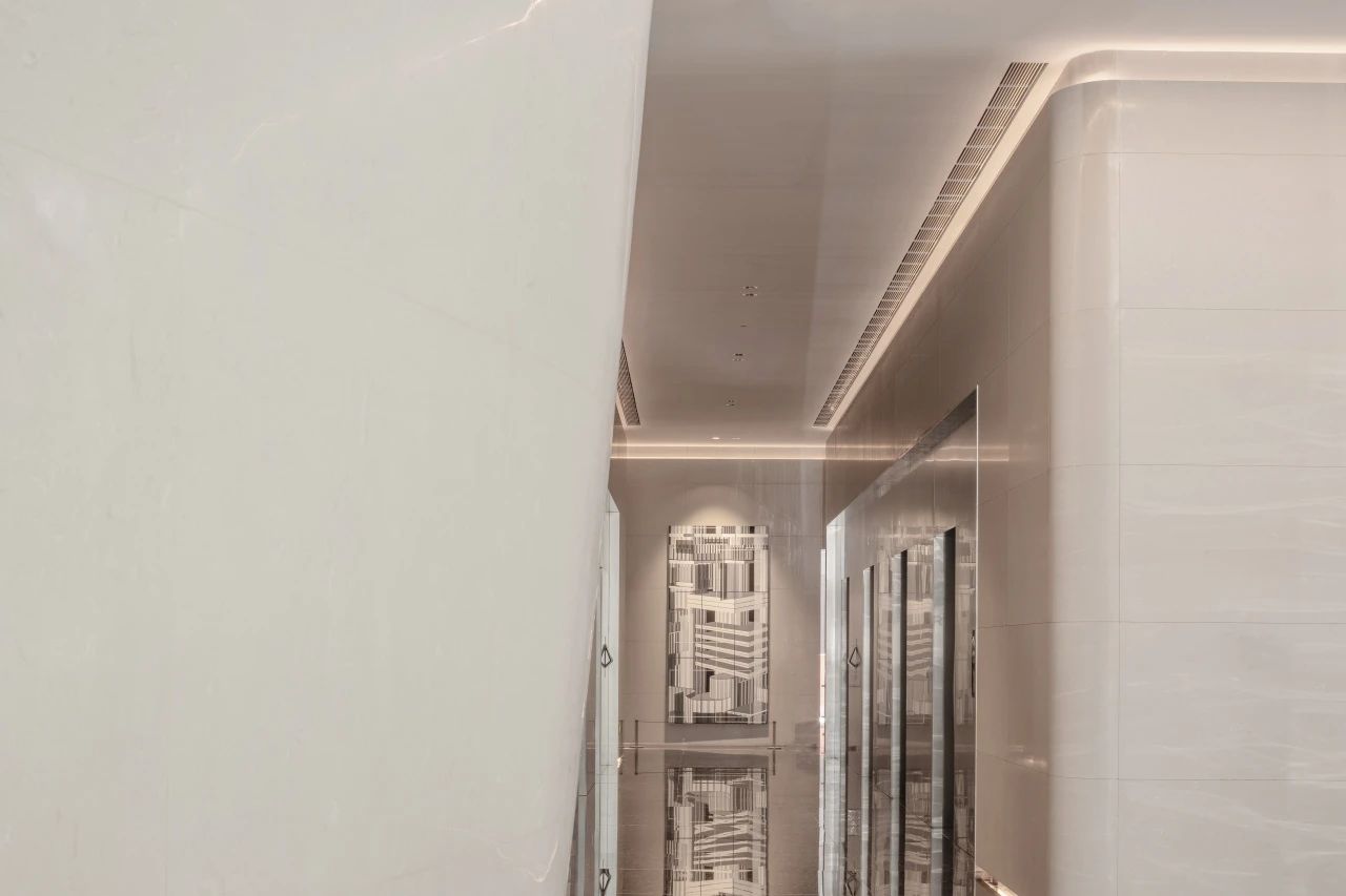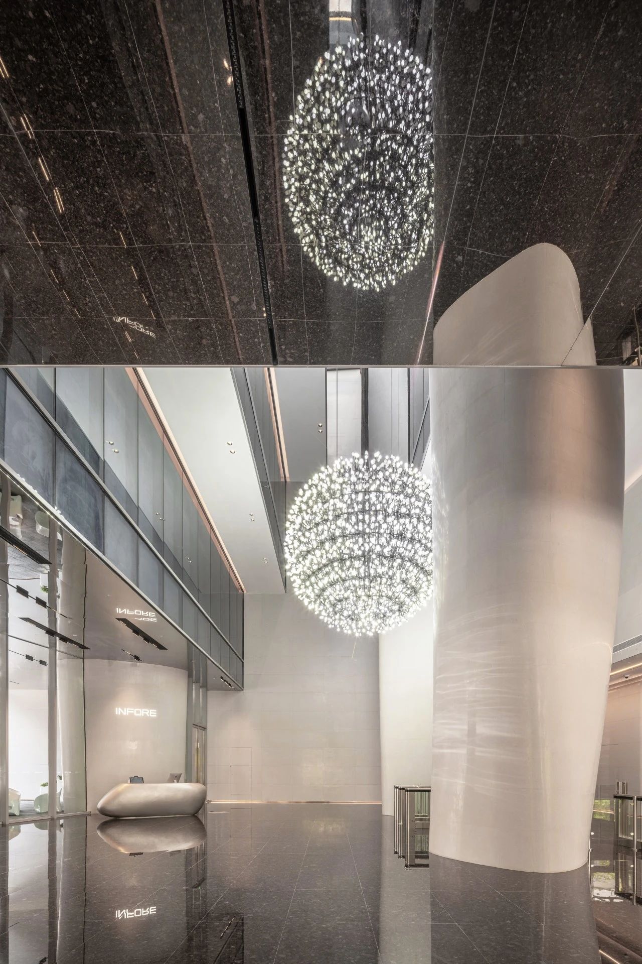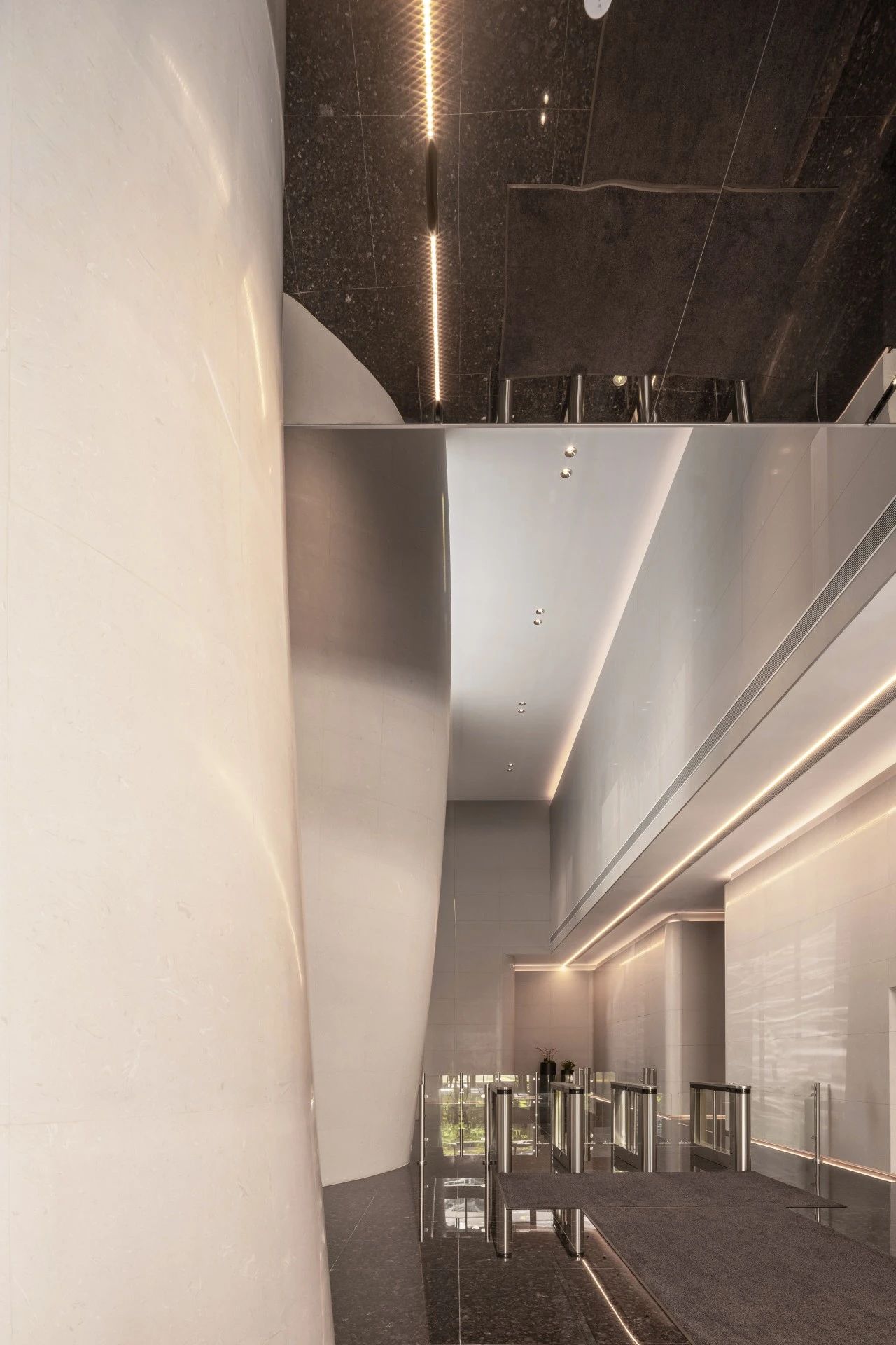 细节部分,利用多曲面石材包裹立柱的形态,将原有建筑柱网打造成具有艺术美感的雕塑整列。搭配契合空间品质和文化内涵的巨型当代装置艺术,营造具有独特艺术气息和未来感空间氛围。