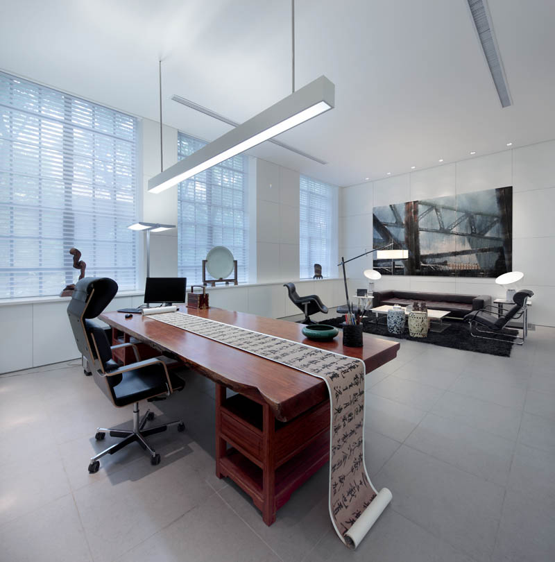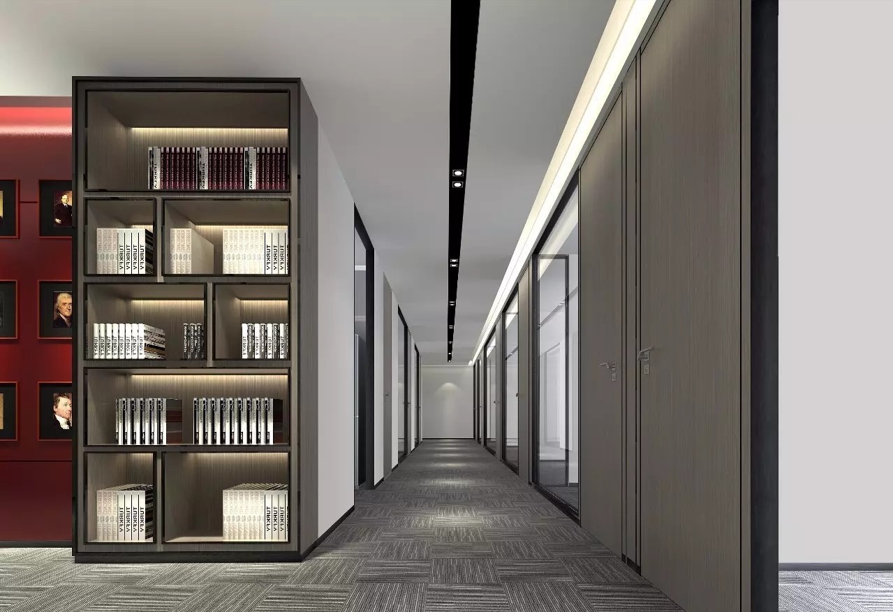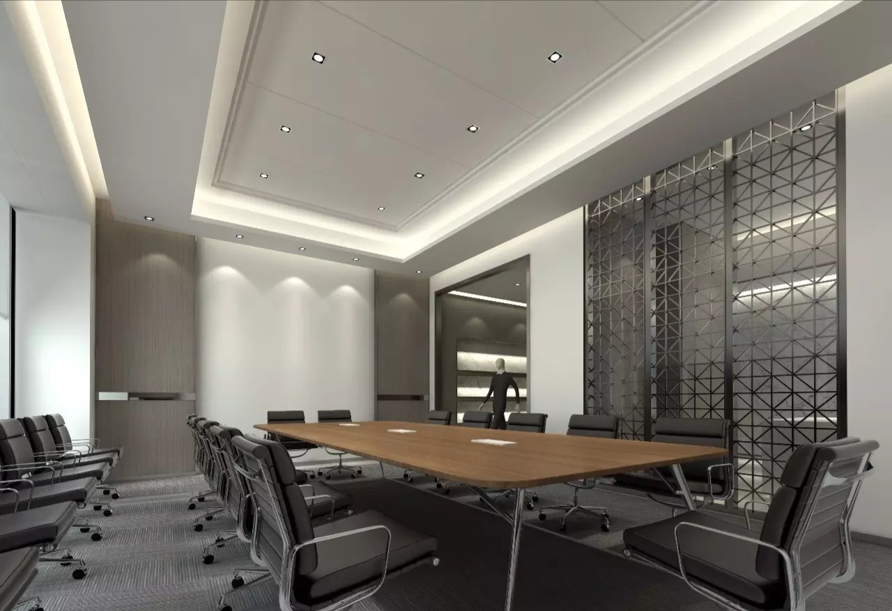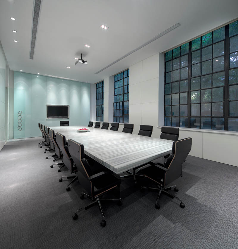 功能区采用玻璃隔断分隔,会议室隔断的透明度相对较高,隔断墙框架是由几何图形截面的铜钢制成。在外部可以隐约看到内被会议状况,同时又能保证足够隐私。