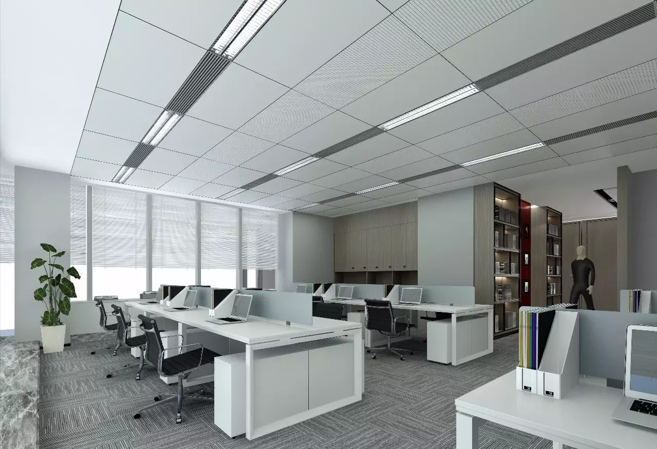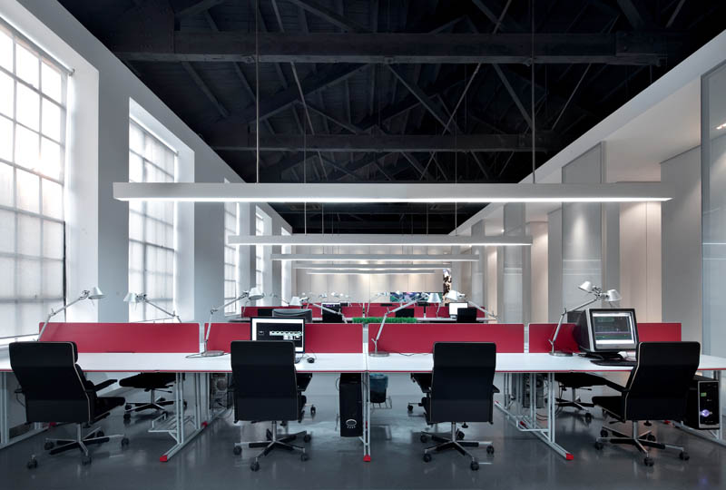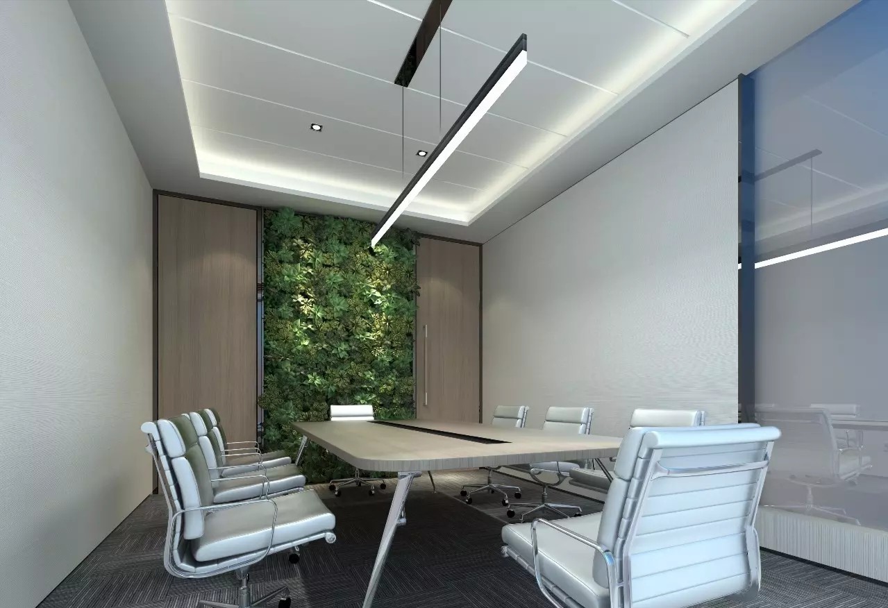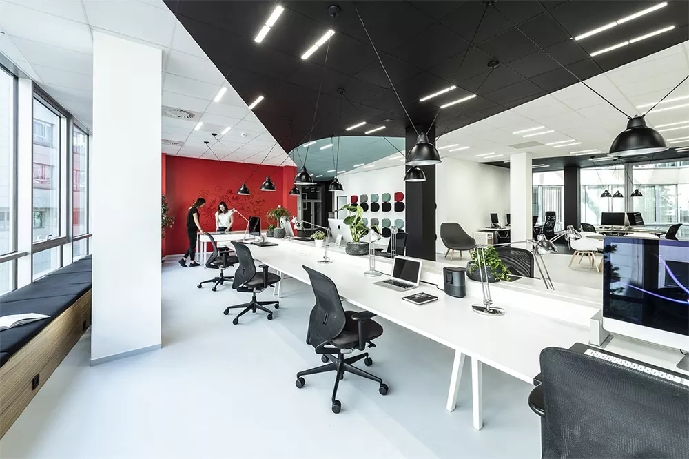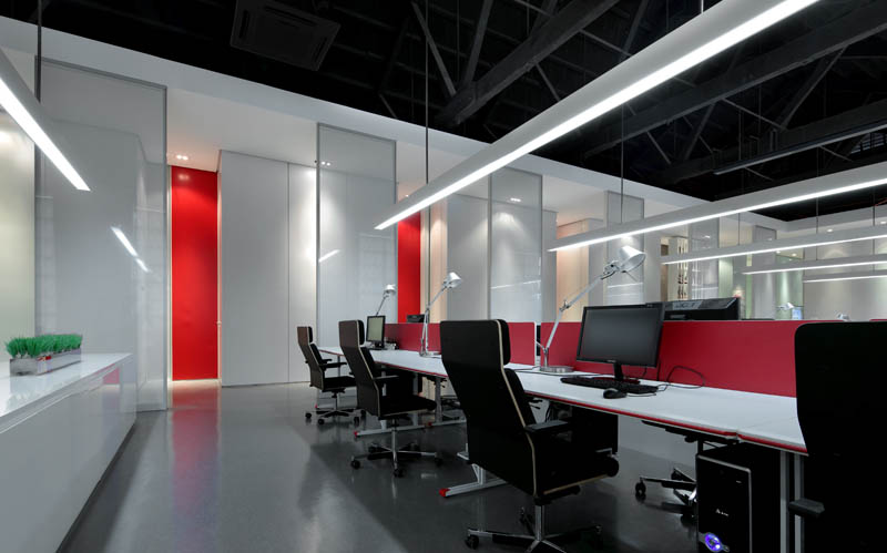 办公区长方形办公桌和相应的长条状灯相互平衡,营造出舒适氛围,一侧为休闲区,员工若是累了或临时需要讨论,便可到一边的休闲区休息、讨论。整个办公室的形象简约,易于管理。