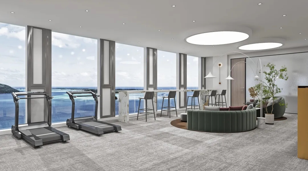 办公区色调打破刻板形象中的沉重感,以前色明快为主色调。前台形象墙世界地图的背景,寓意律所事业辉煌,遍及全球。办公区抬头看海的设计灵感,自由办公吧台区和健身区,尽显海景舒畅。