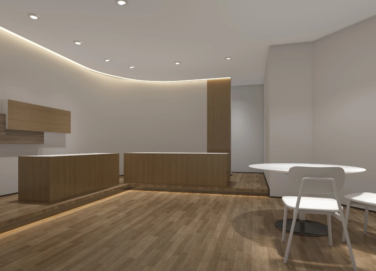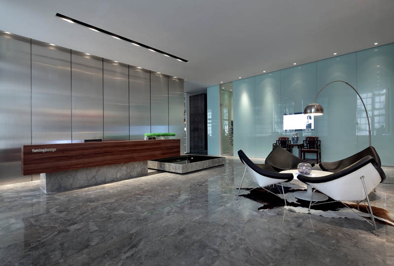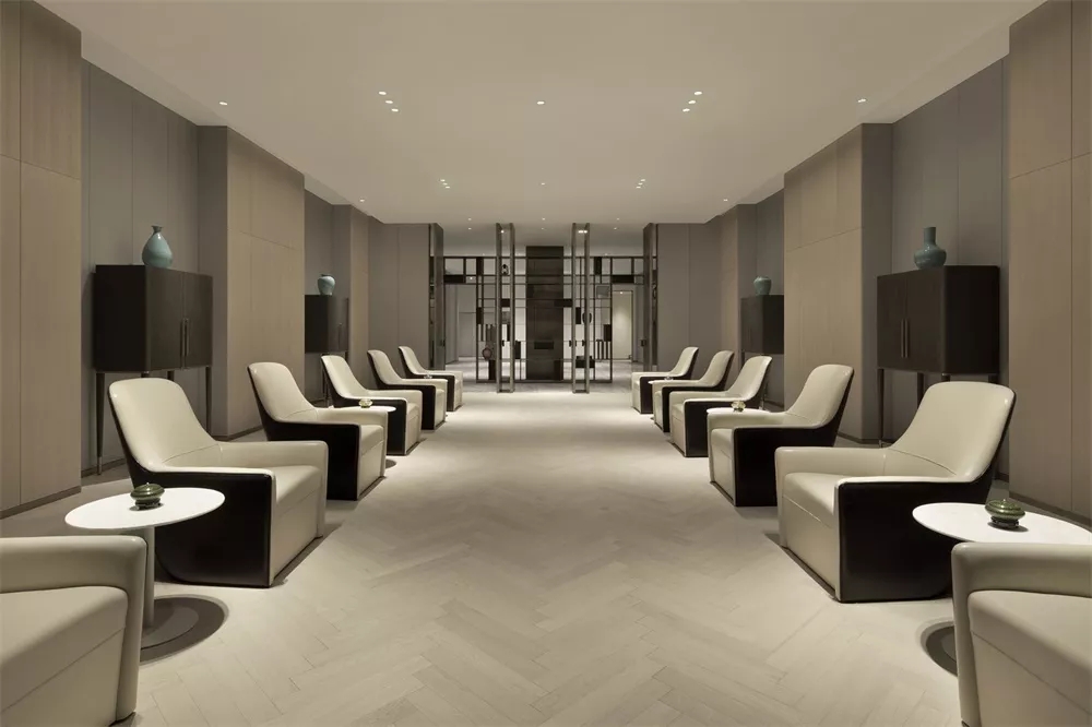 电梯厅,作为本案设计前序,简洁大方,利用材质延伸,减低空间的狭闭感,让空间紧密相连,引导通过玻璃门进入到具现代感的前台和接待区。雪花白大理石前台将空间色调调至安静清雅的状态,一边落地玻璃上的日光,穿过栅格,徐徐地将自己的身影投射到镜面般的地面上,光影曼妙,引人入境。