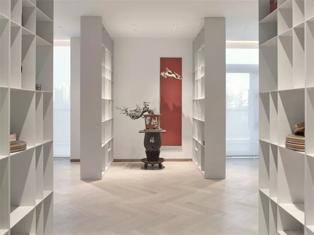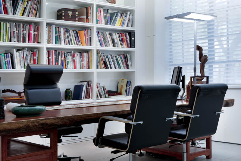 空间的形式做到了极简,没有任何多余装饰,乳胶漆墙、半透明玻璃门、平顶天花、橡木饰面的柜子及门扇概况了所有的造型。通过这些简单的形式,我们营造出通透流畅的空间,空间可以通过玻璃门的开放或密闭,从而满足不同的使用需求。走廊和办公区书架作为隔断,整齐叠放的书籍与办公桌上的植物使办公环境更加轻松舒适。