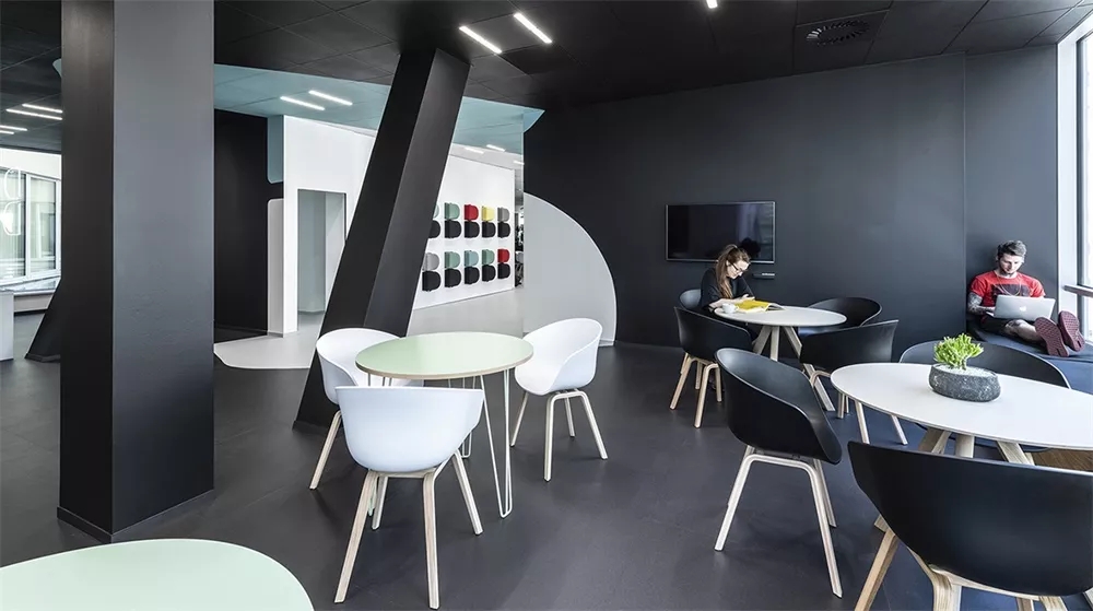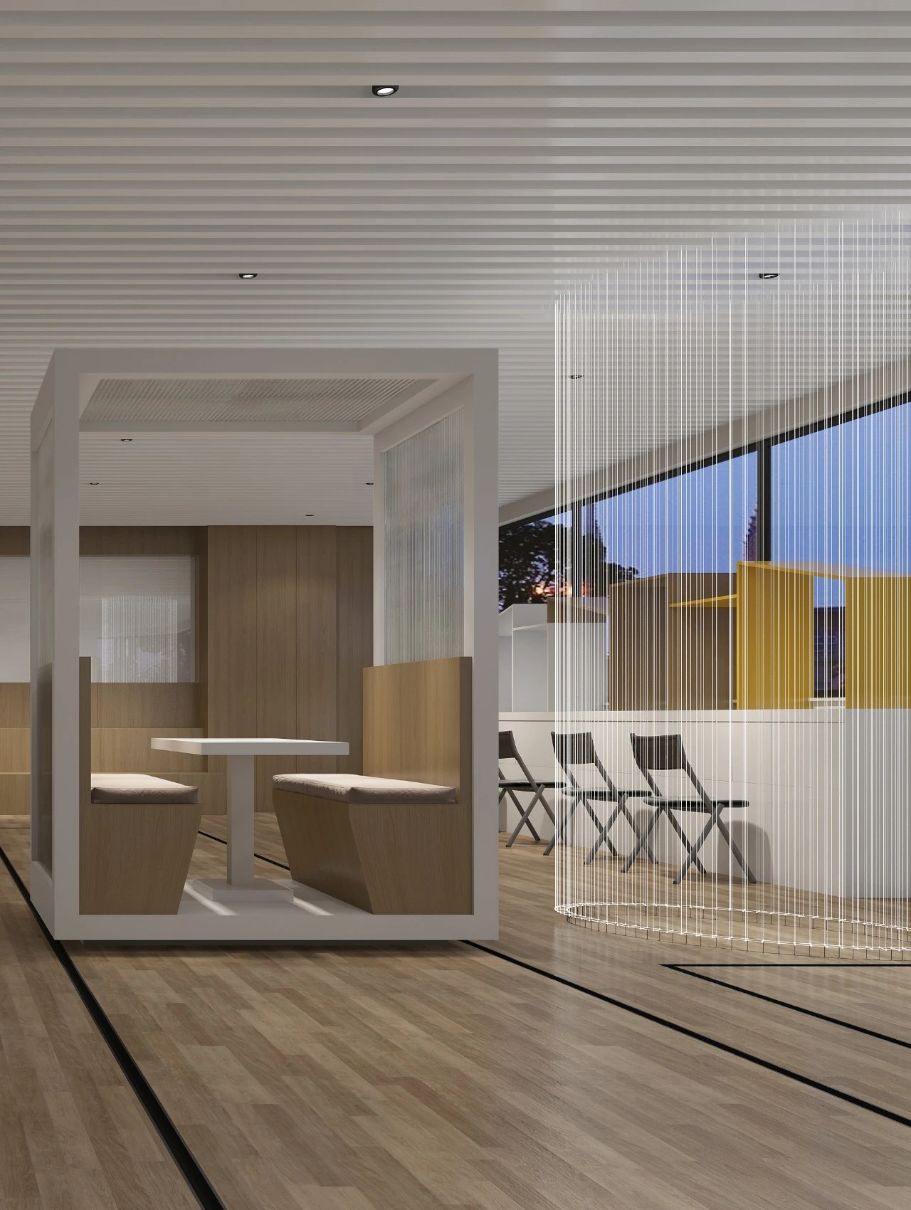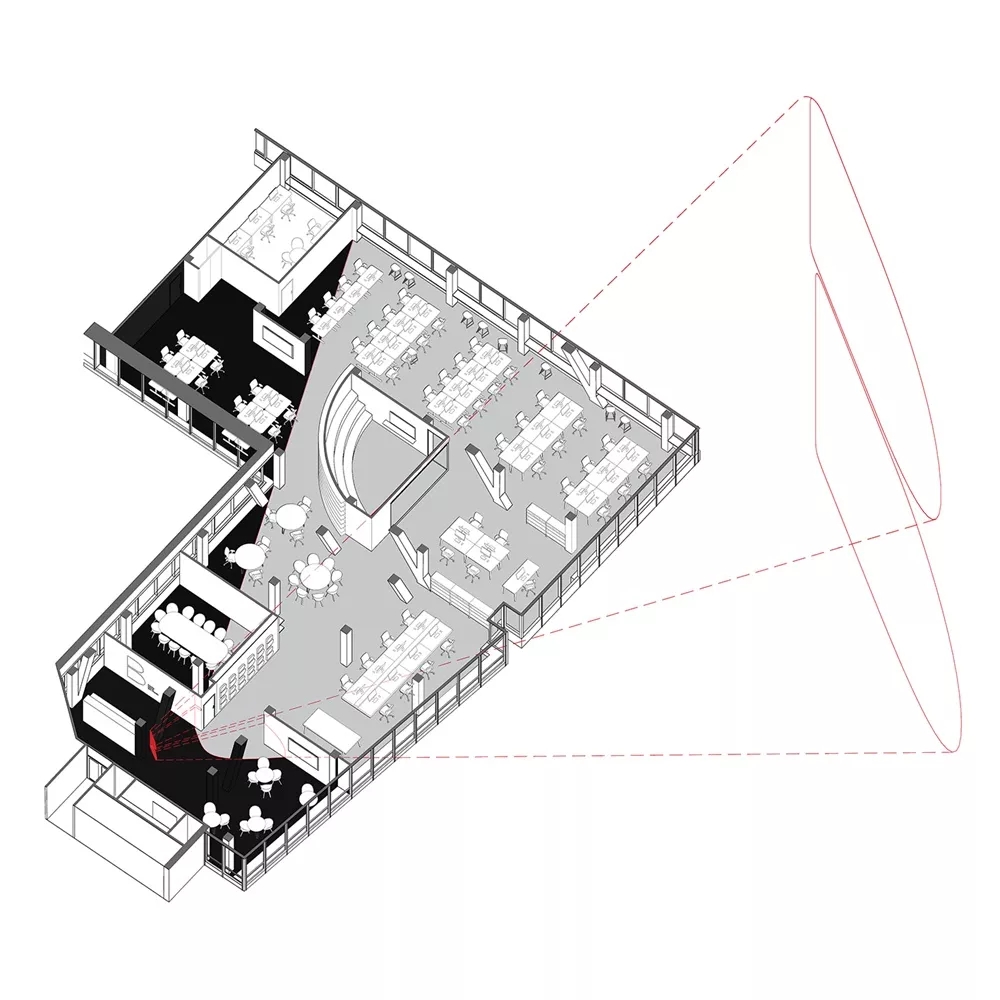 由于员工工作室,餐厅和休息区也被整合到空间中。它有可变的座位,可以用于培训、讲座和内部研讨会,同时也作为员工互动的内部会议点。