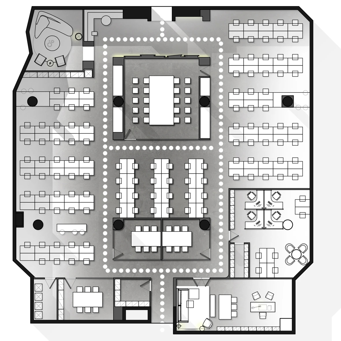 四面是大面积落地玻璃墙,设计确保室内空间是外部城市景观的无缝延伸。重点是突出窗外美丽的风景,培养与城市环境的联系感。这种设计选择不仅优化了自然光的使用,还为工作空间建立了独特的形象。