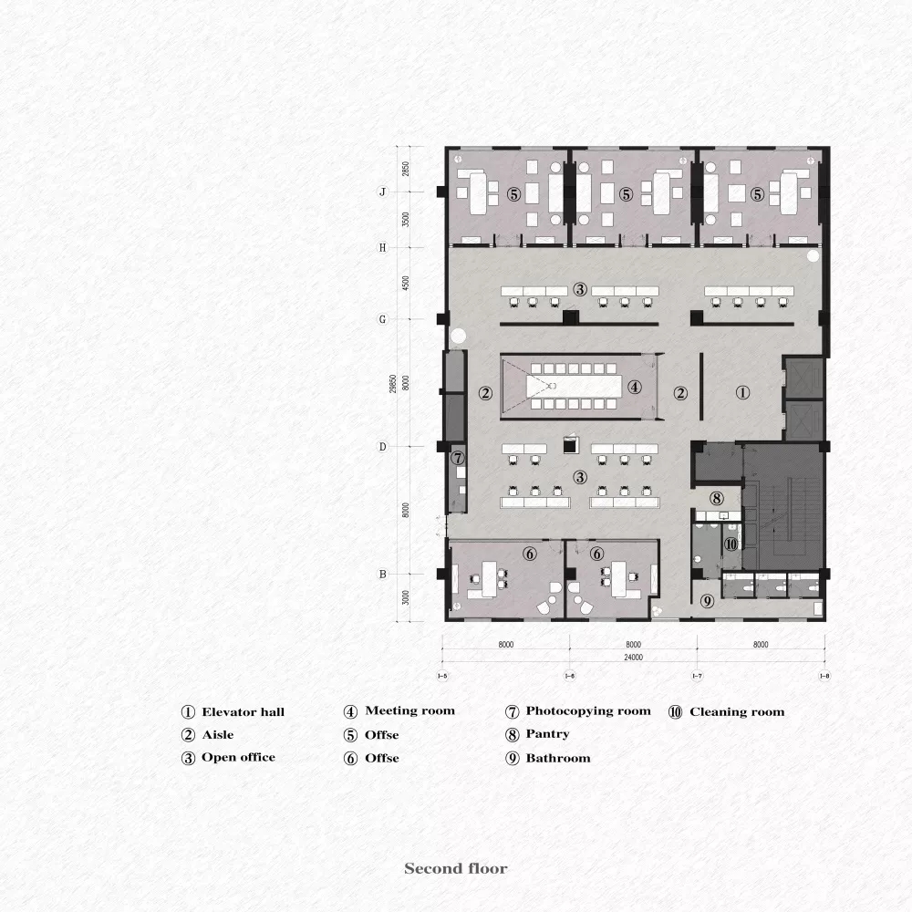 柔和的白色和浅灰色等中性色调主导着整个空间,让来自大型落地玻璃墙的自然光照亮整个办公室,使得办公室成为一个既具有时尚感又兼具实用性的理想工作场所。