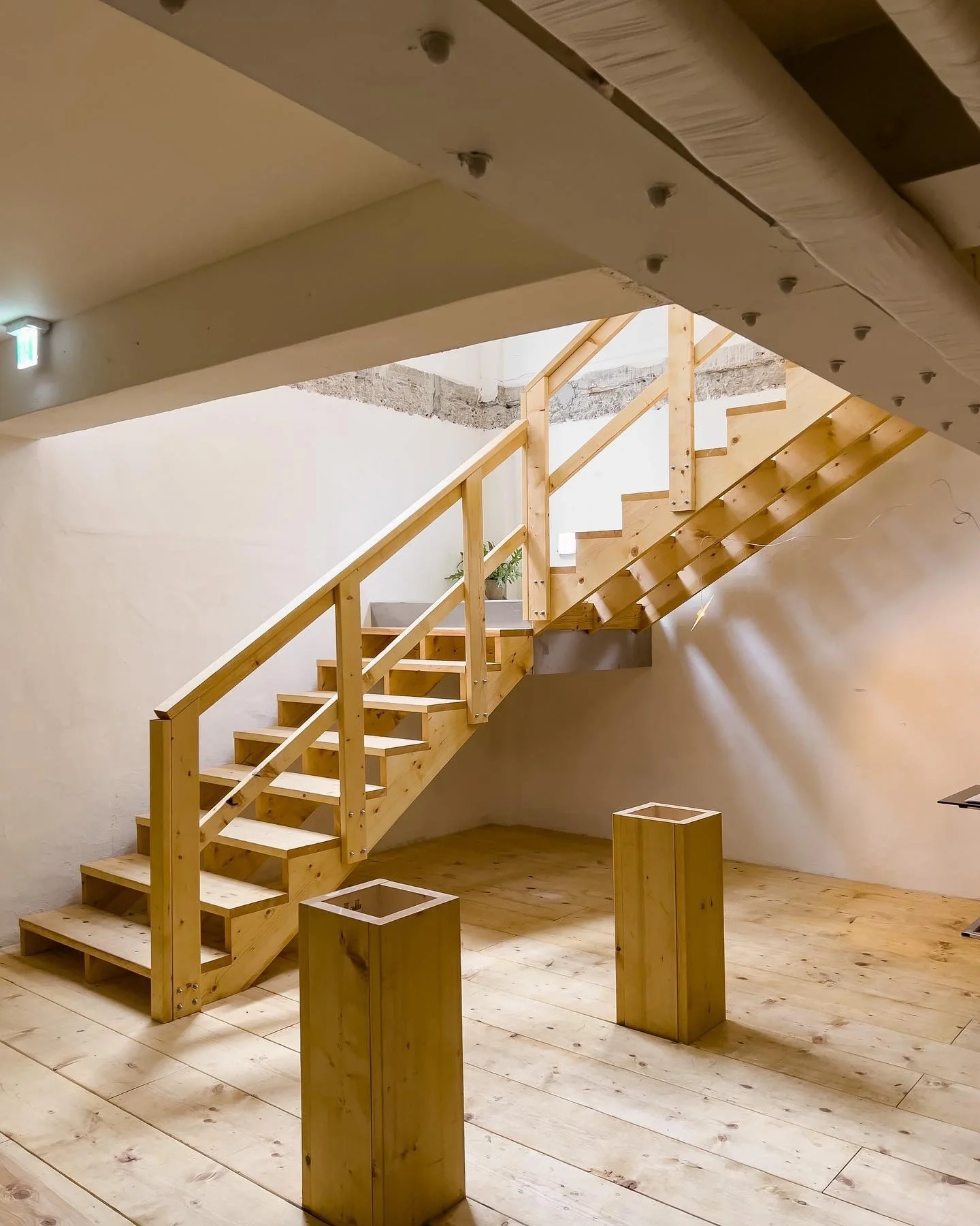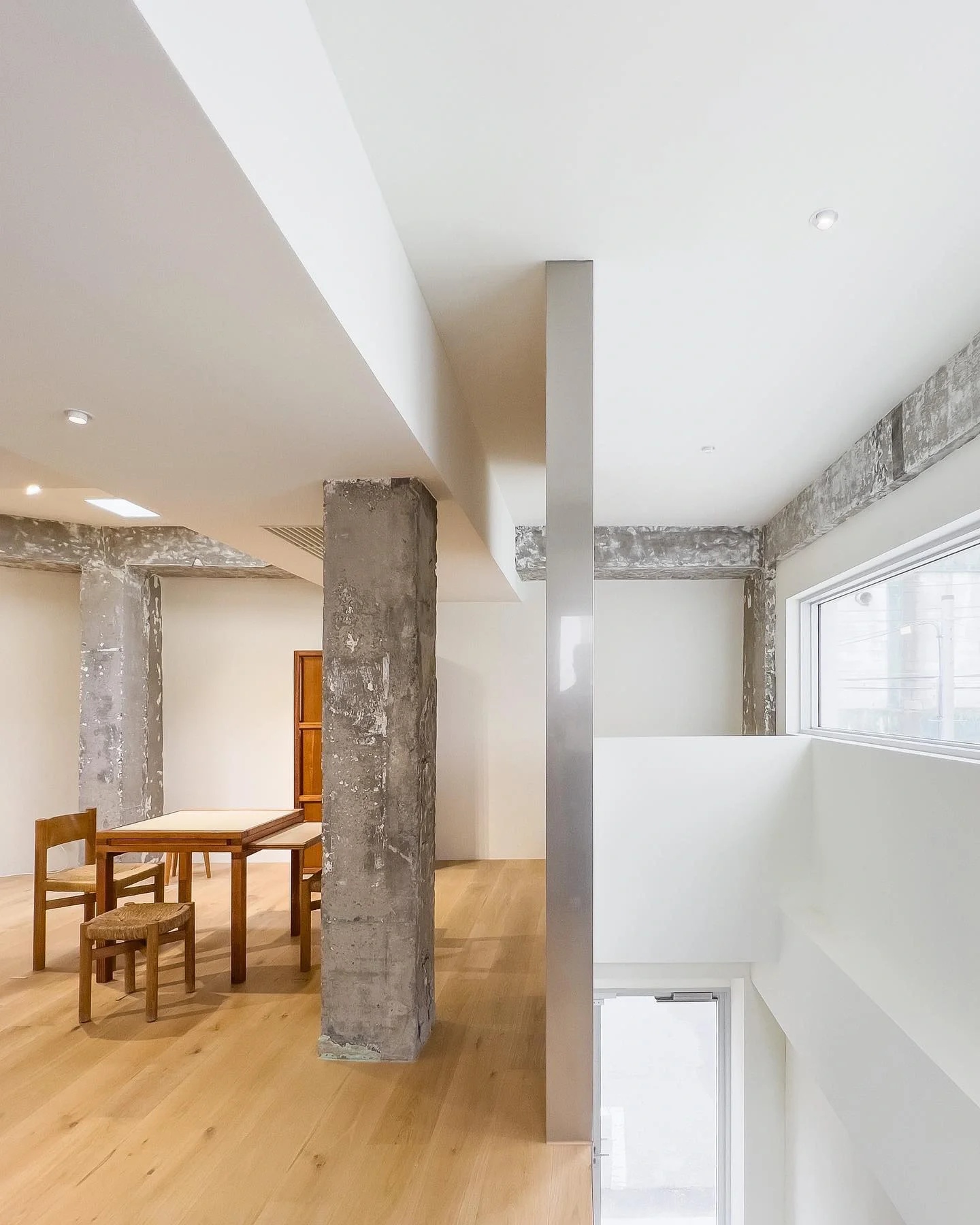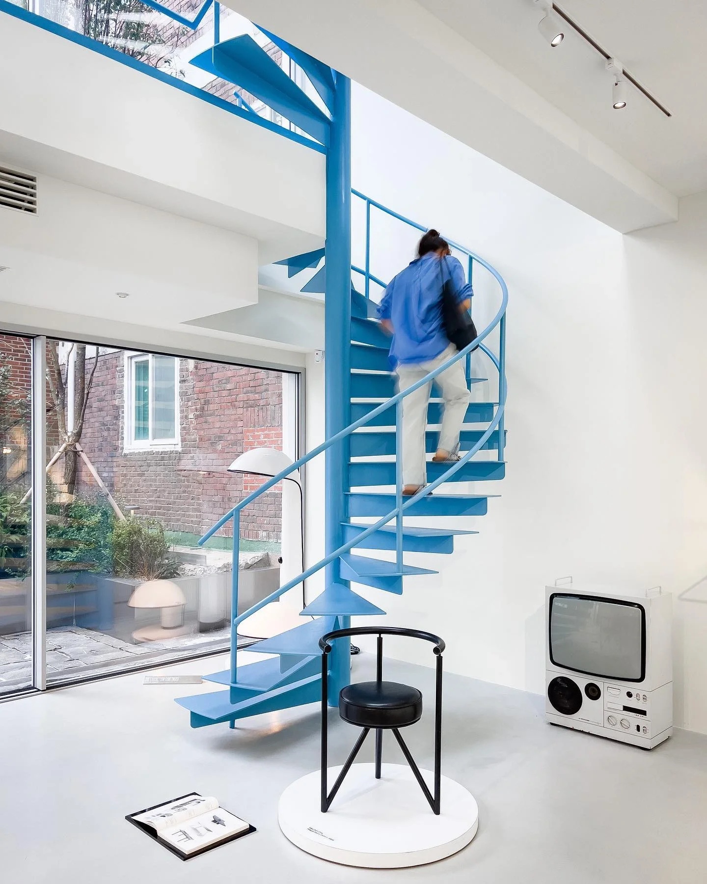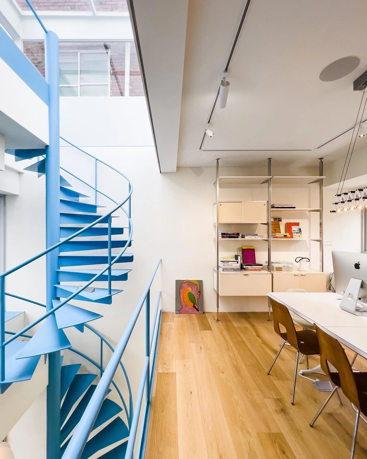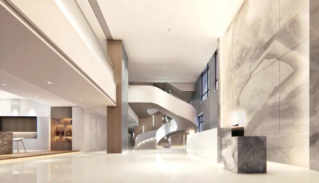 十层办公楼的中央是企业文化的精神堡垒,设计师遵循空间构建的美学关系,通过将自然纯净的白色与温和的木质、沉静的大理石相结合,将品牌形象简洁明了地呈现,和谐统一的空间视觉让空间拥有了结构美和秩序美。空间内洁白清逸的旋转楼梯让上下两层空间有了更多的联系和情感沟通,鼓励了员工在室内流动的积极性,同时也减低了办公空间中的压抑感和局限感。楼梯自下而上的螺旋轨迹也仿若是正在无限衍生的灵感和思想,正在蔓延和交融,灵感也因此得以挥洒。