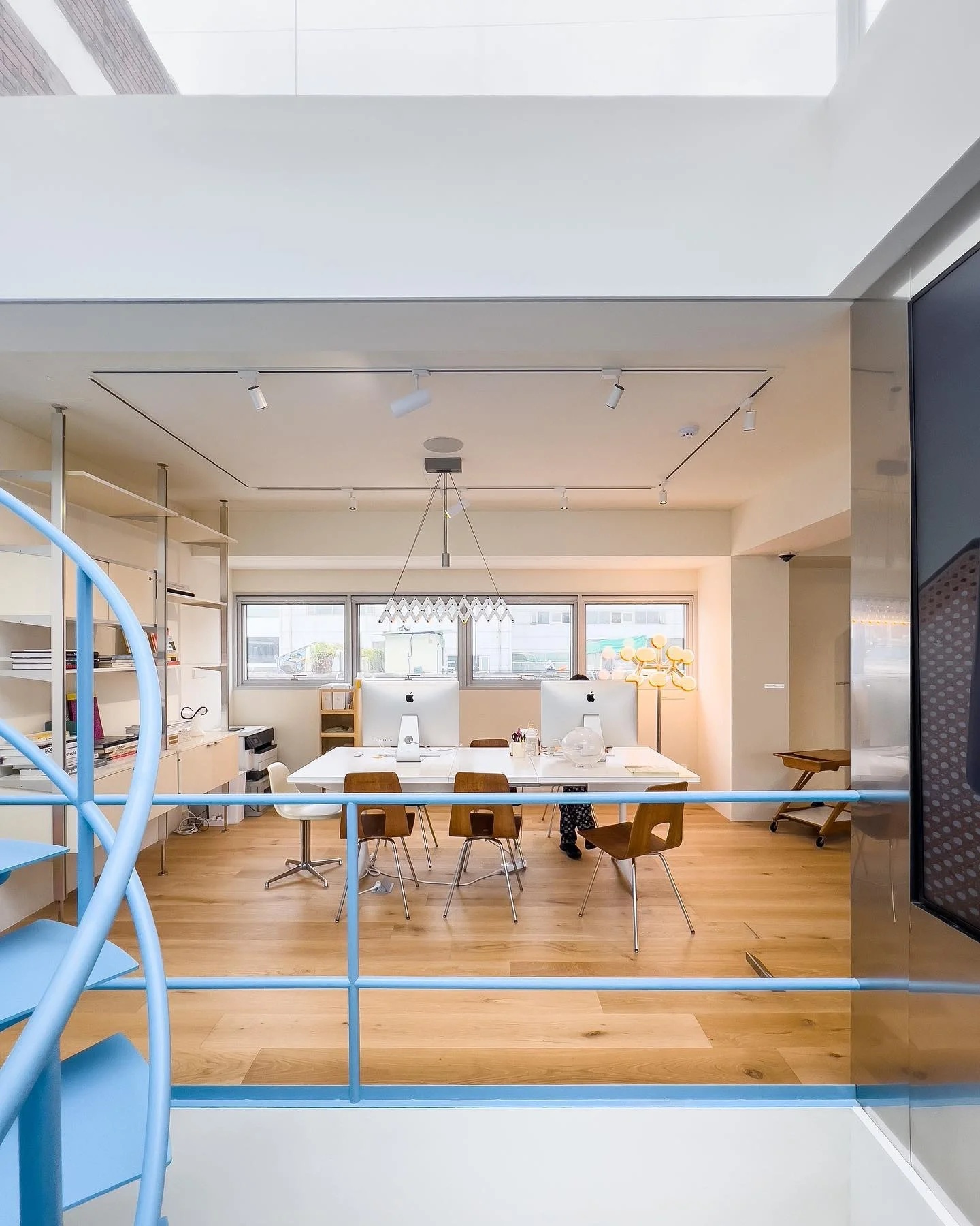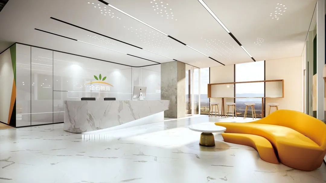 在为金石教育进行办公空间设计时,无论是从空间的形态设计、功能划分,还是从光线引入以及色调、材料搭配和衔接运用,设计师希望设计能通过人、物、空间之间的融合从而衍生出更灵活、动态化的办公场景。