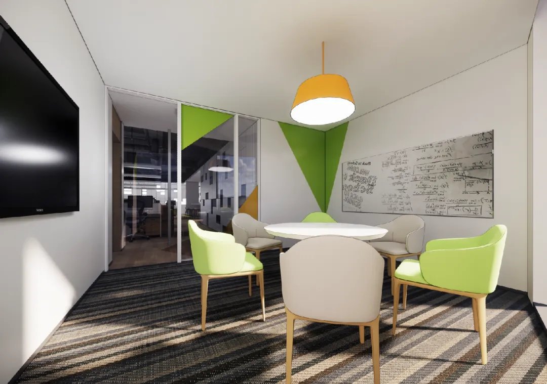 整体空间运用了品牌标志性颜色——绿色和橙色,并以多元、灵活的配色手法为空间带来充满活力、积极向上的氛围,使空间充盈着丰富的创造力。