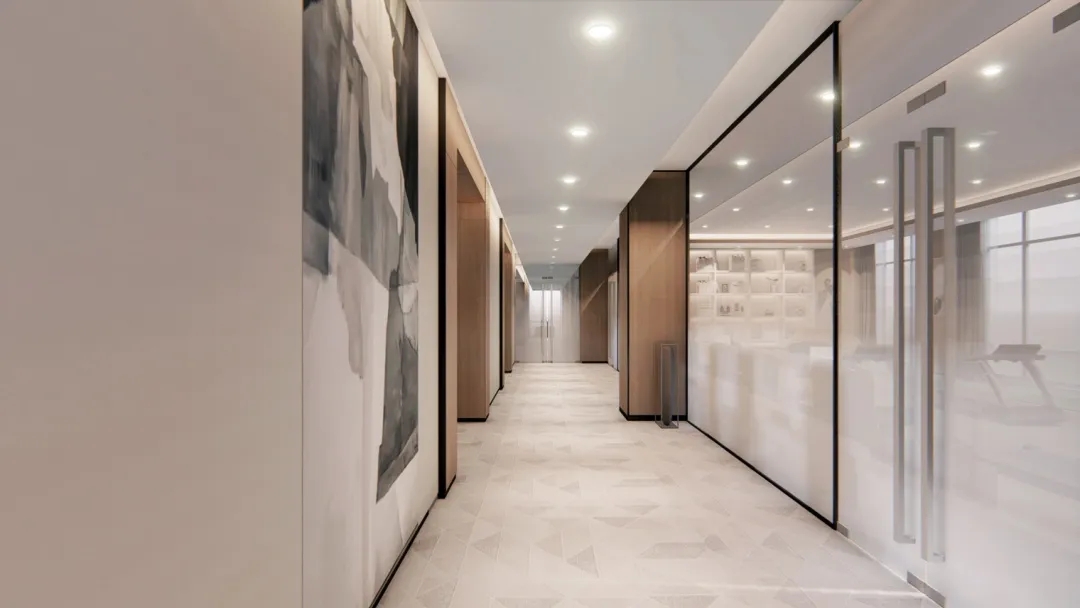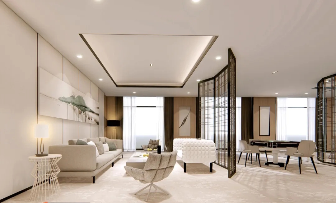 设计的魅力往往是赋予空间更多的可能性以及意境表达,使置身于空间环境内的人有不同的感官和精神的体验。一楼大堂的空间在设计师淡雅明净的笔触下晕染开来,米色色调的运用让空间凝结出静谧优雅的气质,泼墨的山水画让空间增添了人文美学的气息,以木质材料为代表的柔和色调让空间充满了无限的遐想,这是一种摒除复杂的优雅,与行文需要繁简得当同理,空间也需要这种现代性的“去复杂”。