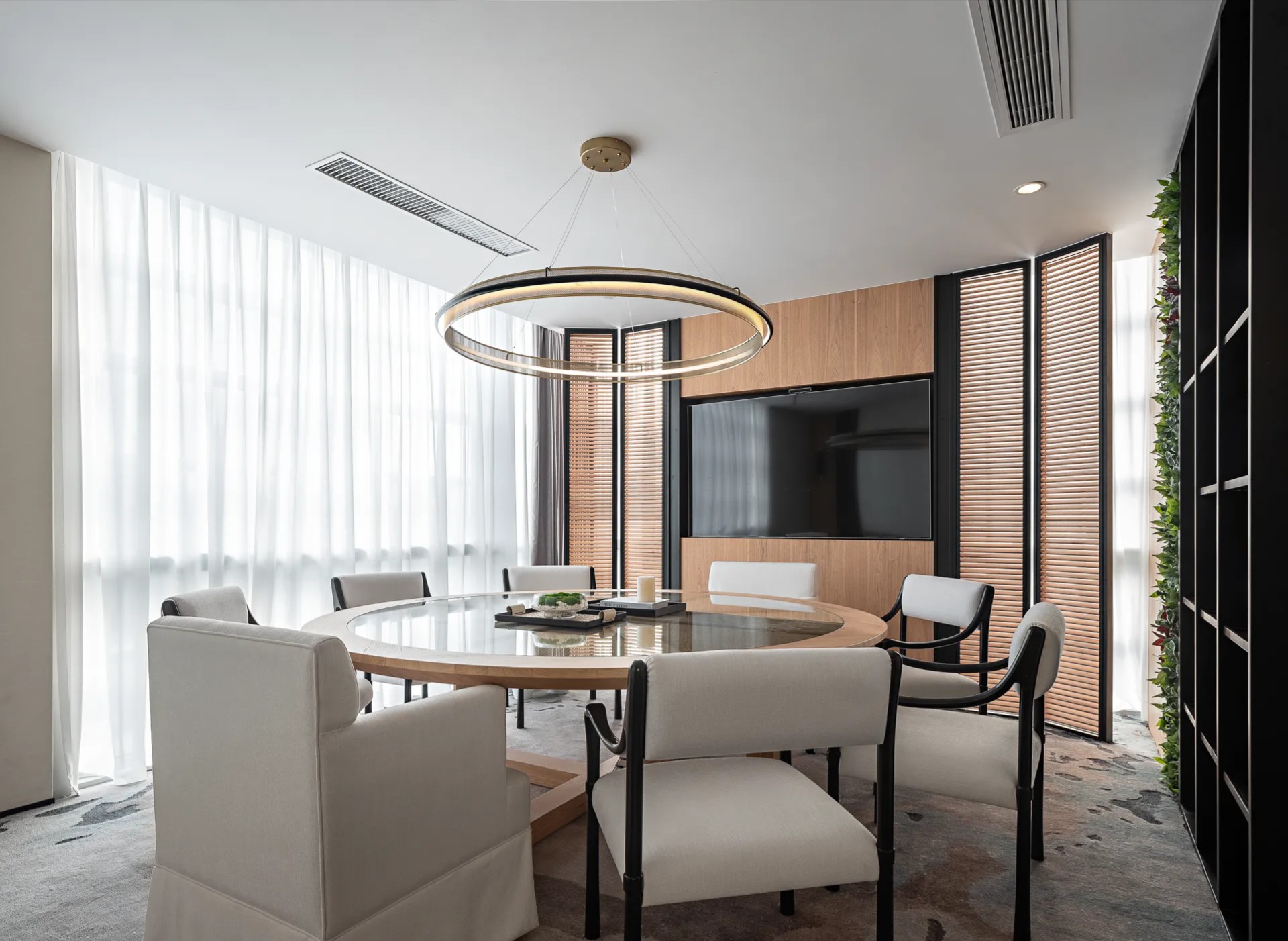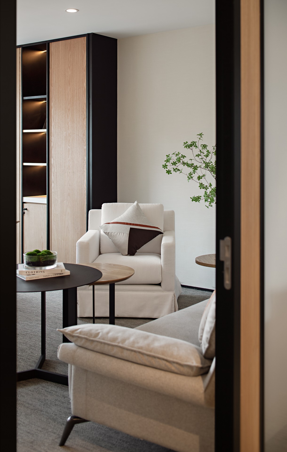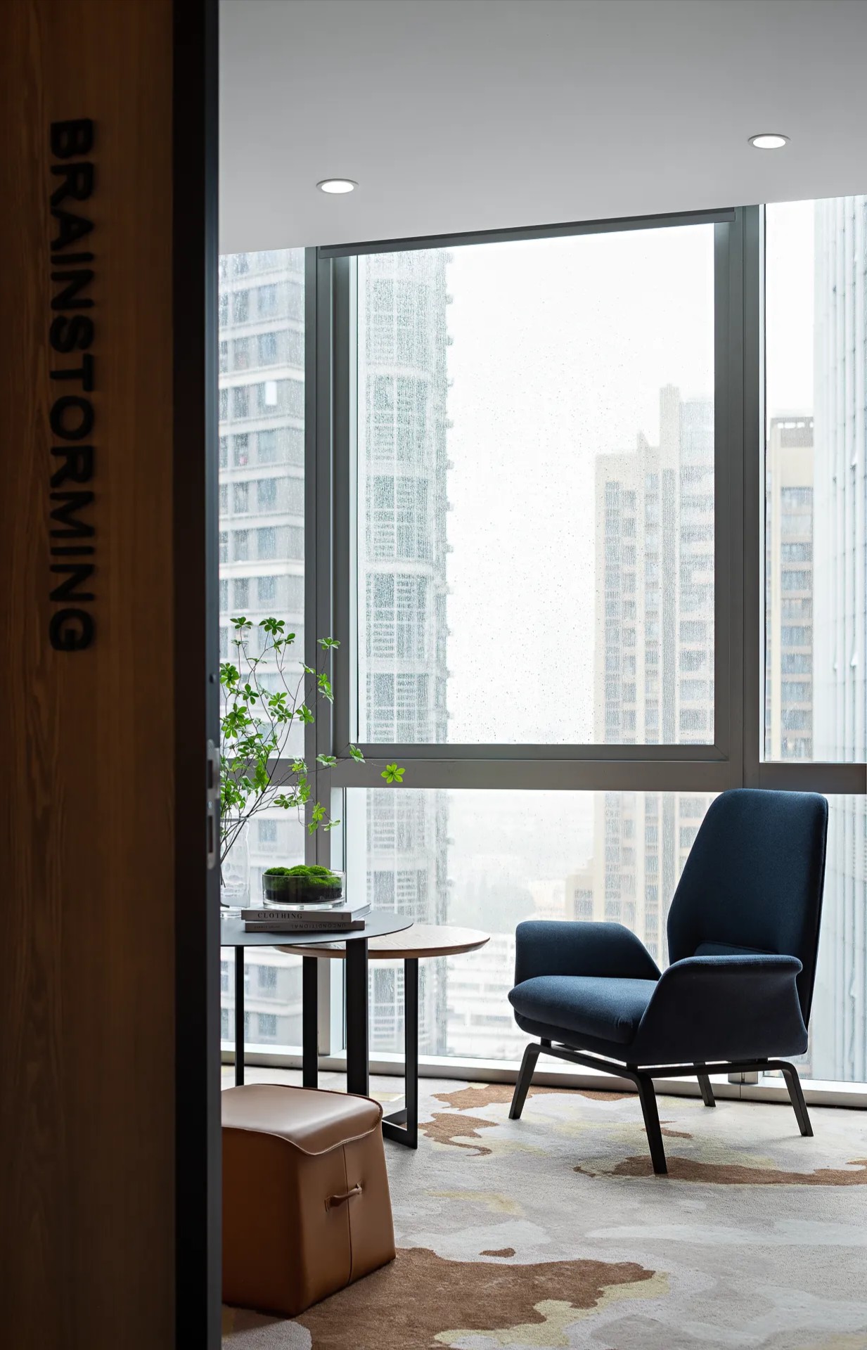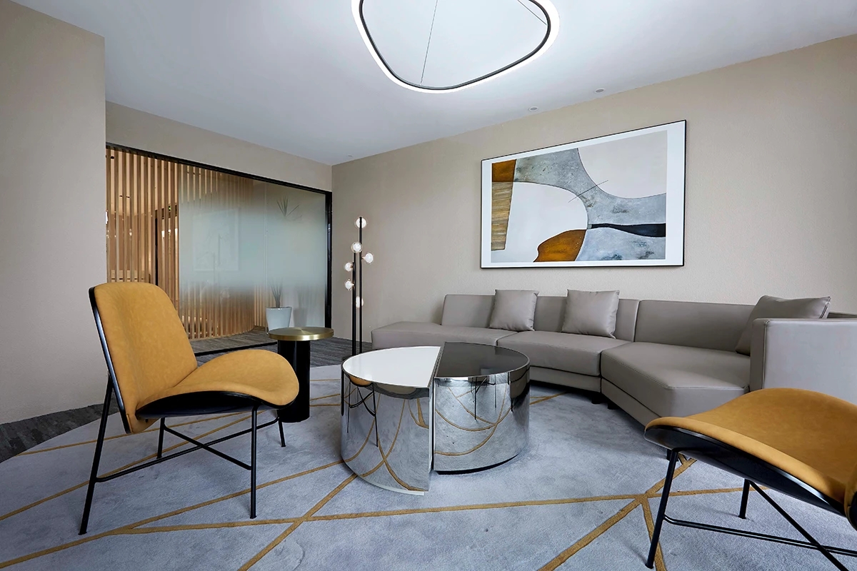 设计以商务美式为基调,色彩以大面积自然原木为主调,引用轻松活力的软装搭配,为空间注入充满生机和希望的活力颜色,整体年轻有趣又不乏精致细节。