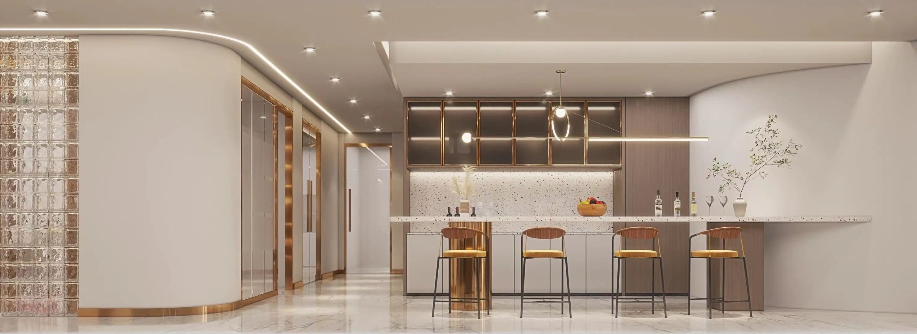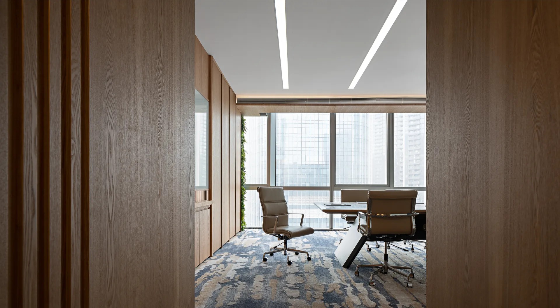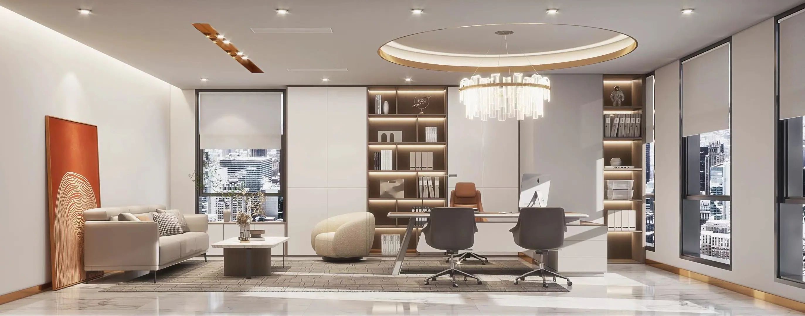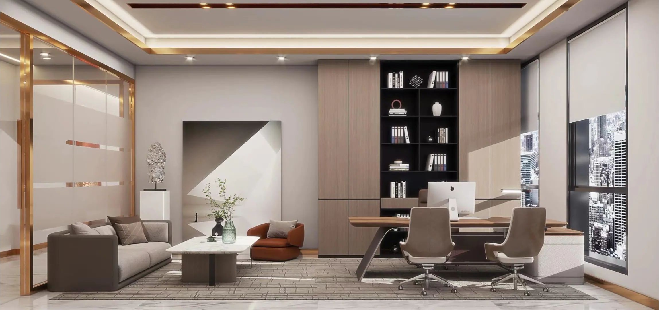 设计以商务美式为基调,色彩以大面积自然原木为主调,引用轻松活力的软装搭配,为空间注入充满生机和希望的活力颜色,整体年轻有趣又不乏精致细节。