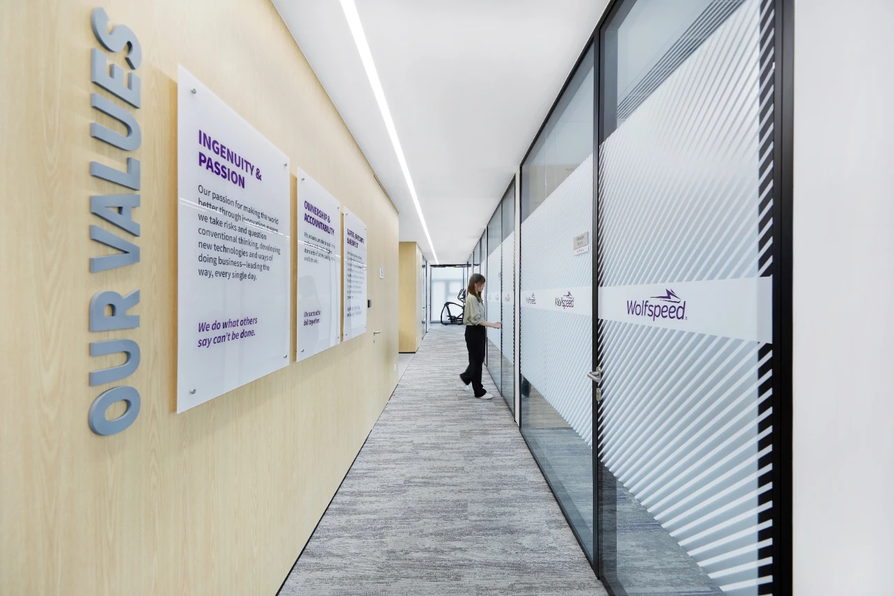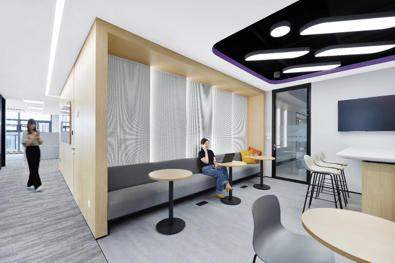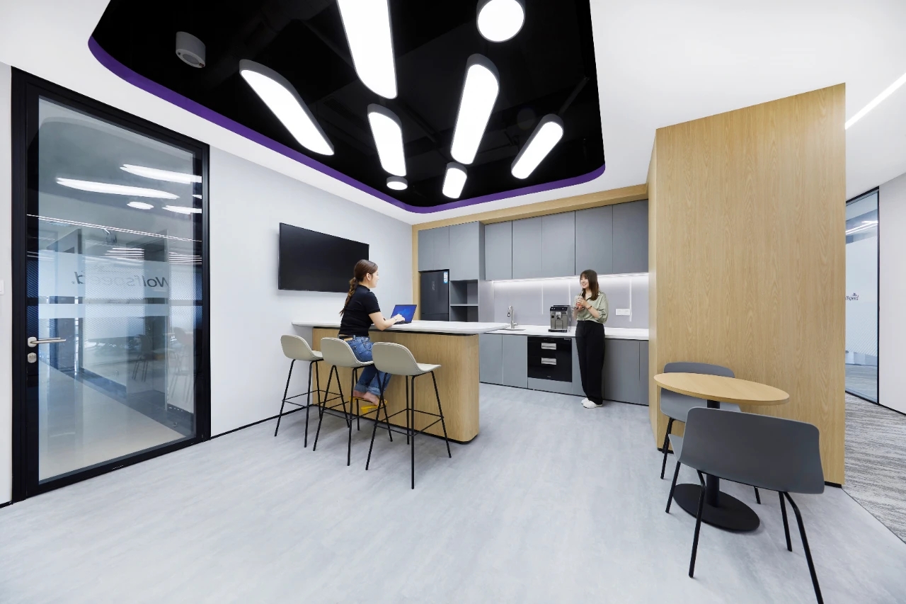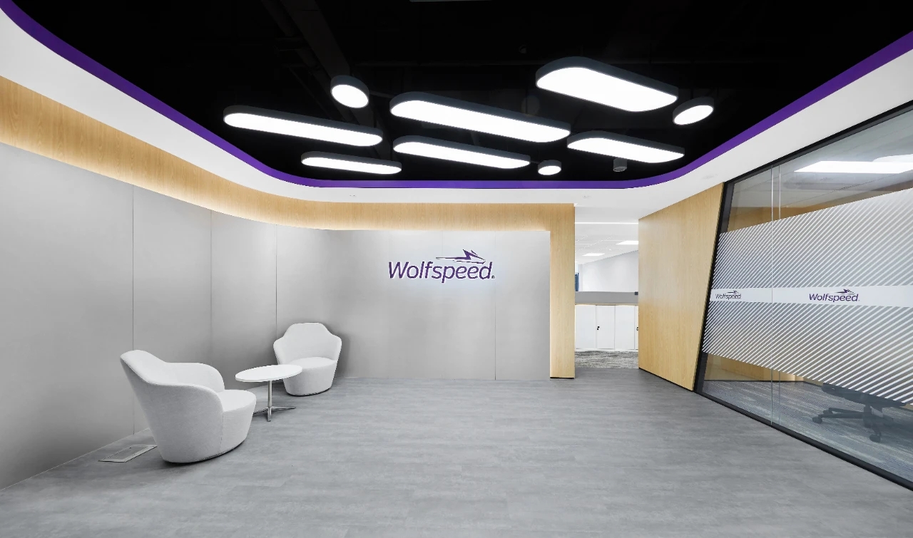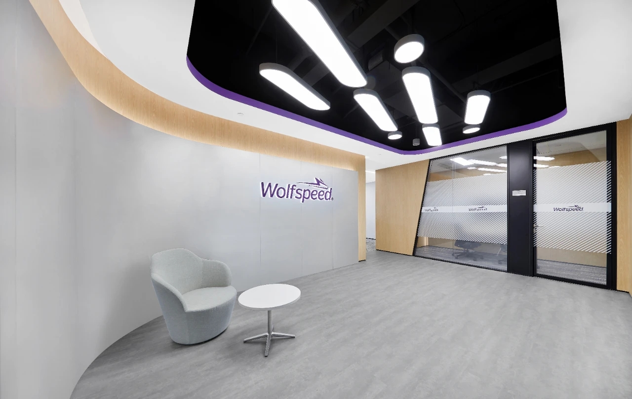 办公室前厅带给人开门见山的醒目科技印象,银灰色立面色泽明亮,与地面材料的色调形成视觉上的连续感。同时我们在顶面天花设计上采用了弧线形的边角处理方式,与地面弧线部分形成对应。我们在前厅和茶水区的天花运用同样的圆角矩形灯具排列,象征科技速度。在黑色幕景中,形成强烈的观赏冲击力。木饰面的局部使用,在科技印象中,又传递出Wolfspeed对自然与人文的关注。员工内区使用大面积的银灰色材料搭配原木立面,为办公区域营造统一、简洁的空间氛围,使人在色调上与碳、硅元素,以及自然印象联系起来,加深对品牌和产品的认知。