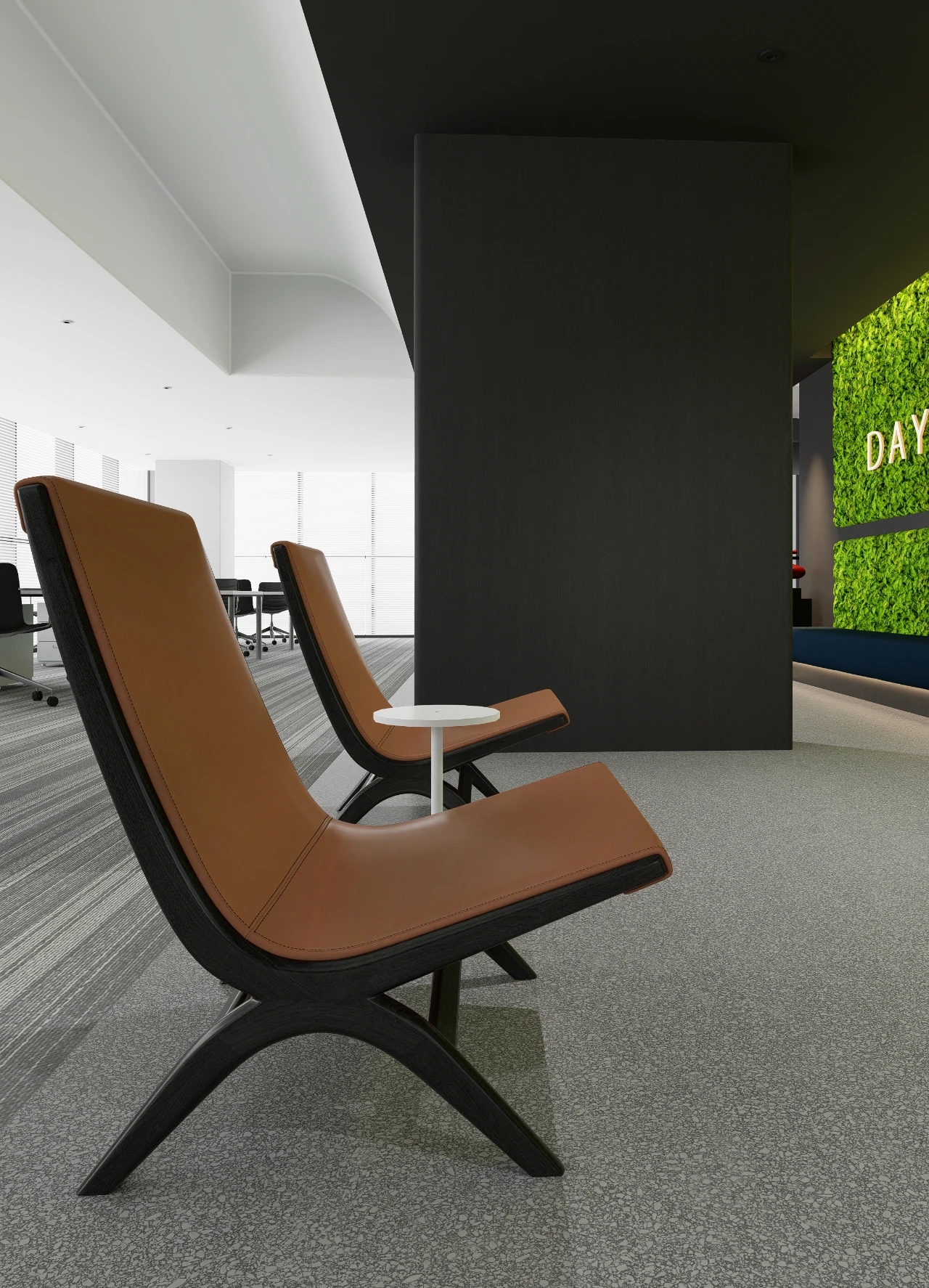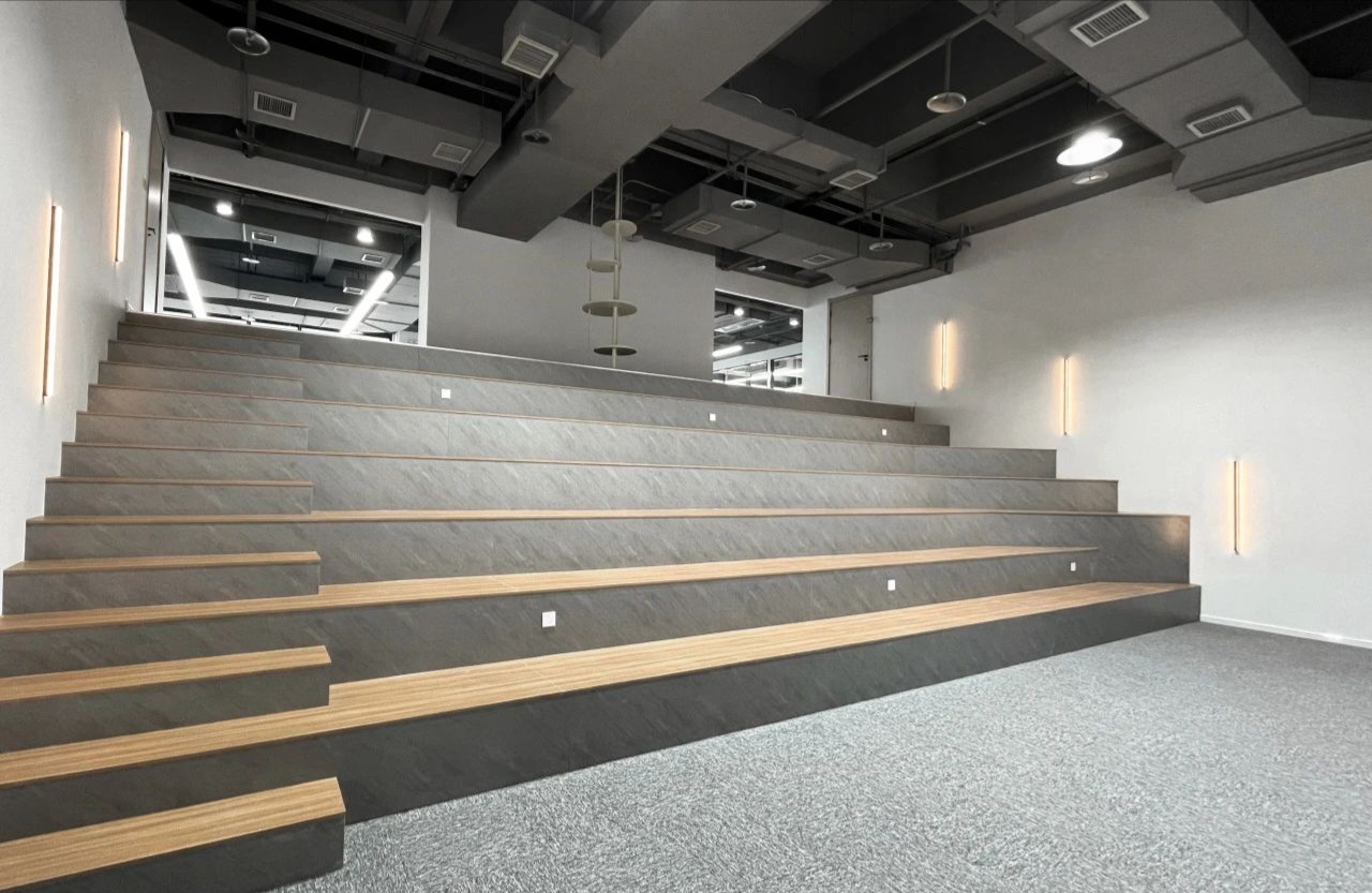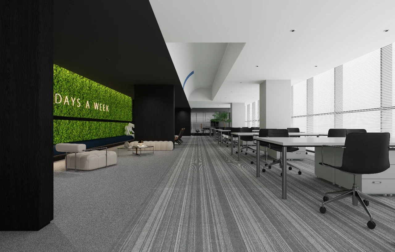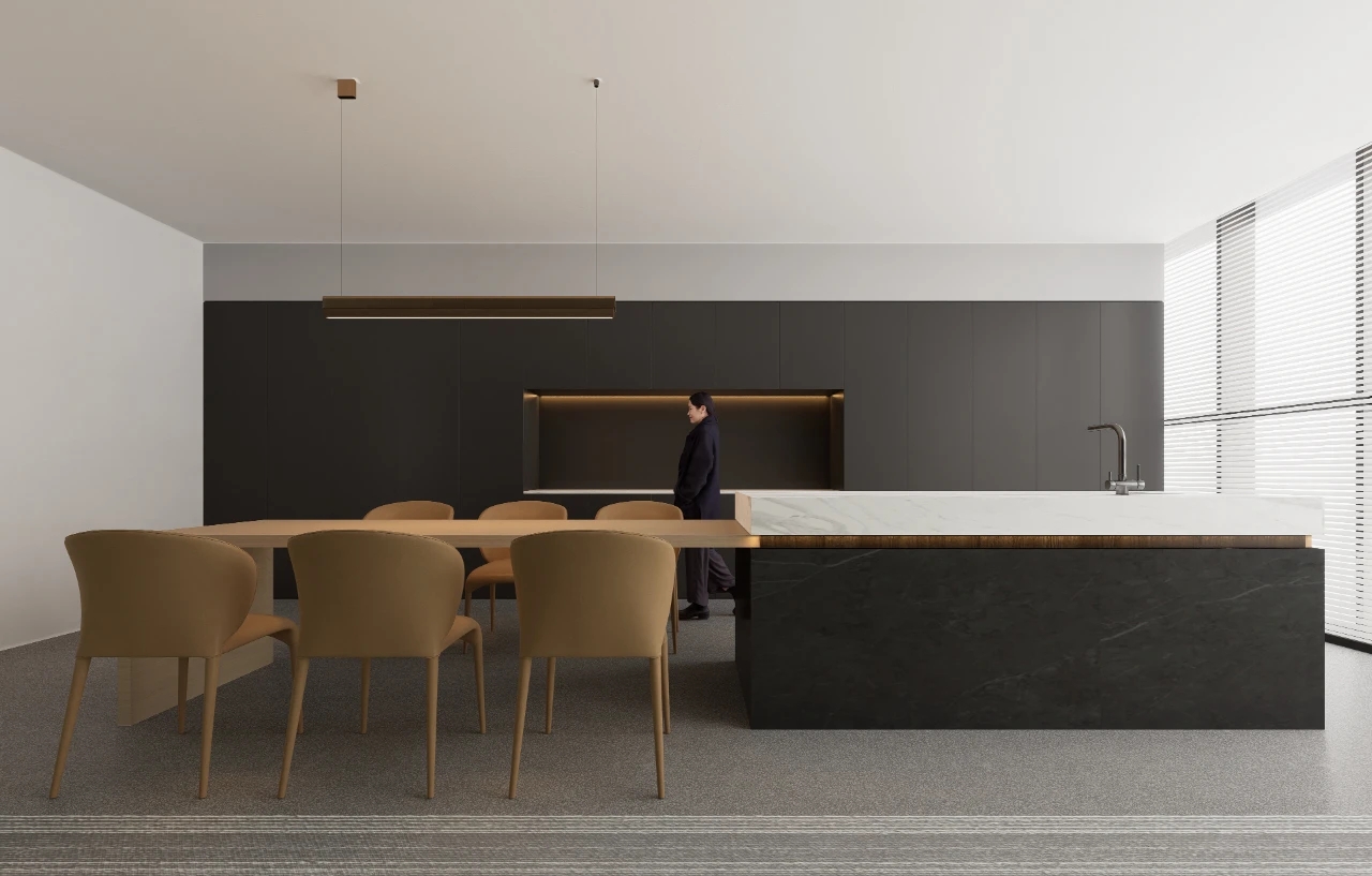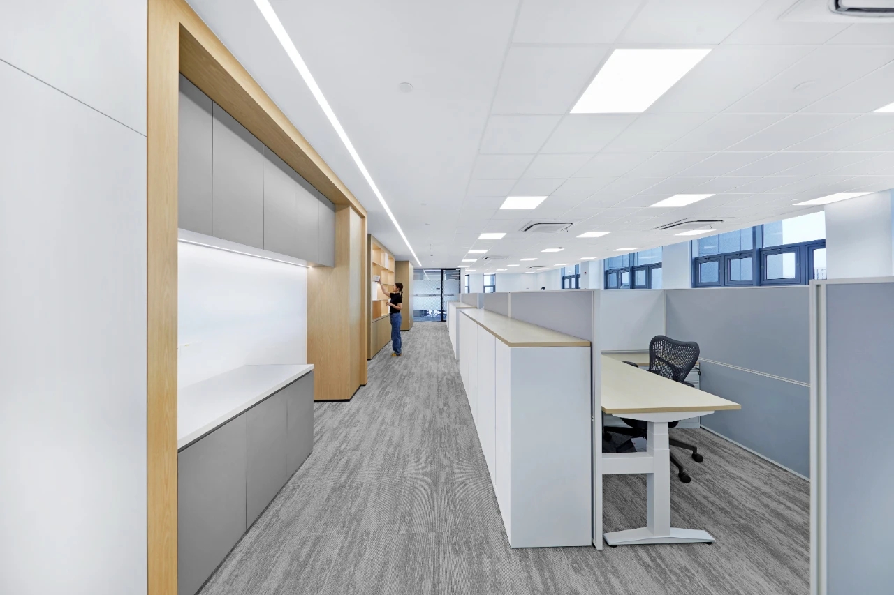 办公室前厅带给人开门见山的醒目科技印象,银灰色立面色泽明亮,与地面材料的色调形成视觉上的连续感。同时我们在顶面天花设计上采用了弧线形的边角处理方式,与地面弧线部分形成对应。我们在前厅和茶水区的天花运用同样的圆角矩形灯具排列,象征科技速度。在黑色幕景中,形成强烈的观赏冲击力。木饰面的局部使用,在科技印象中,又传递出Wolfspeed对自然与人文的关注。员工内区使用大面积的银灰色材料搭配原木立面,为办公区域营造统一、简洁的空间氛围,使人在色调上与碳、硅元素,以及自然印象联系起来,加深对品牌和产品的认知。