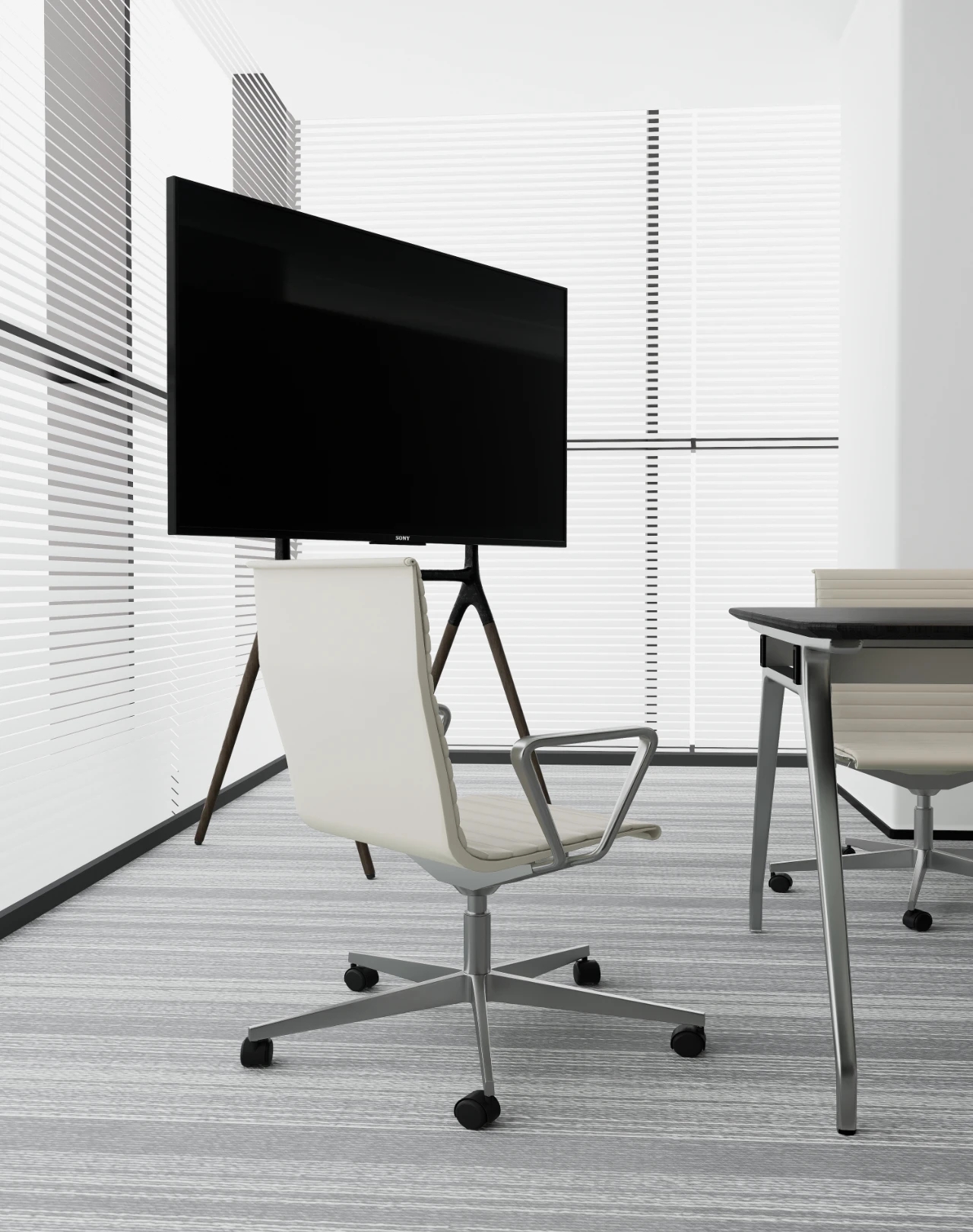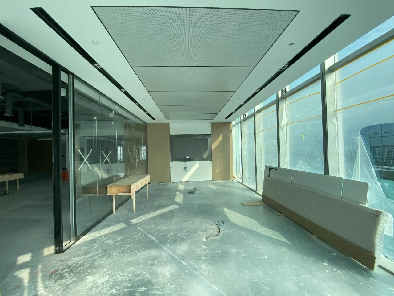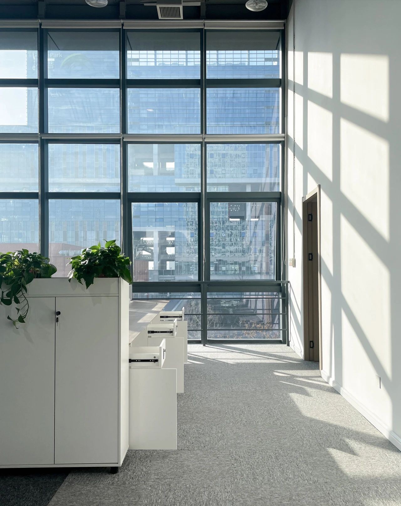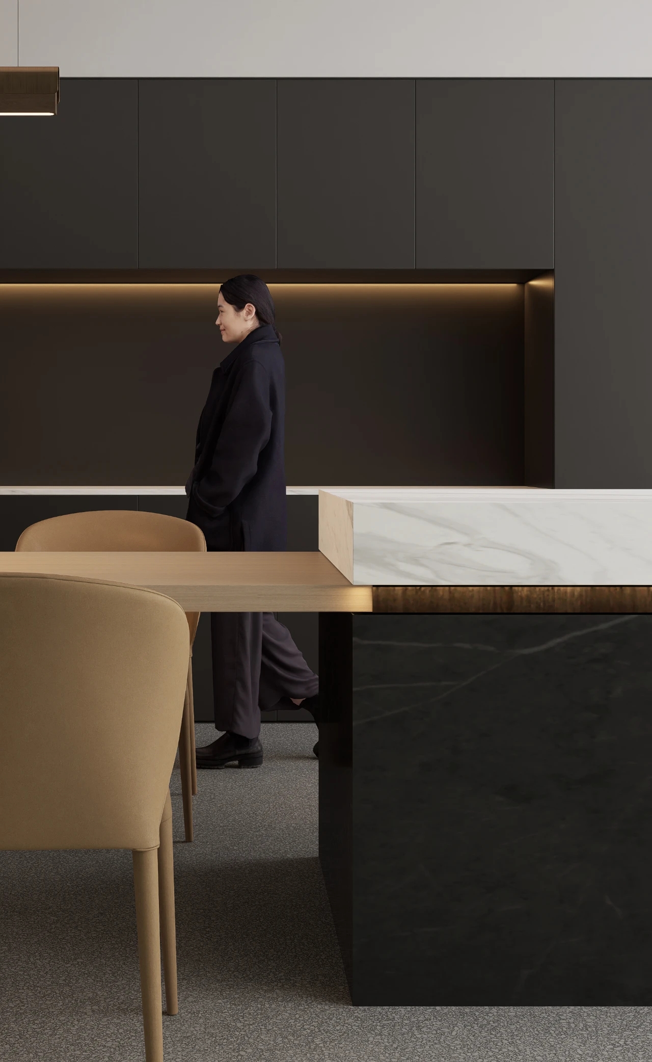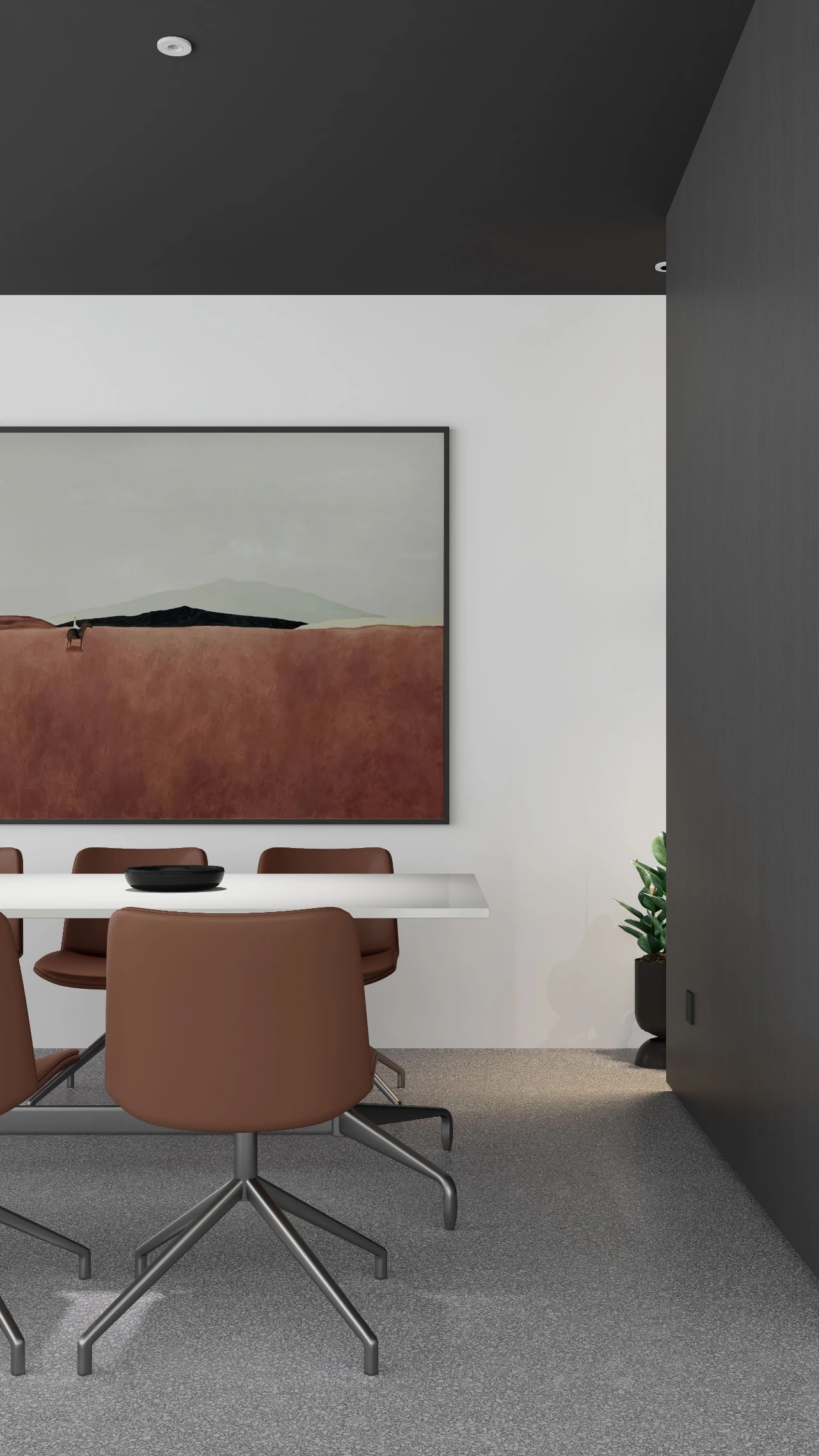 办公室前厅带给人开门见山的醒目科技印象,银灰色立面色泽明亮,与地面材料的色调形成视觉上的连续感。同时我们在顶面天花设计上采用了弧线形的边角处理方式,与地面弧线部分形成对应。我们在前厅和茶水区的天花运用同样的圆角矩形灯具排列,象征科技速度。在黑色幕景中,形成强烈的观赏冲击力。木饰面的局部使用,在科技印象中,又传递出Wolfspeed对自然与人文的关注。员工内区使用大面积的银灰色材料搭配原木立面,为办公区域营造统一、简洁的空间氛围,使人在色调上与碳、硅元素,以及自然印象联系起来,加深对品牌和产品的认知。