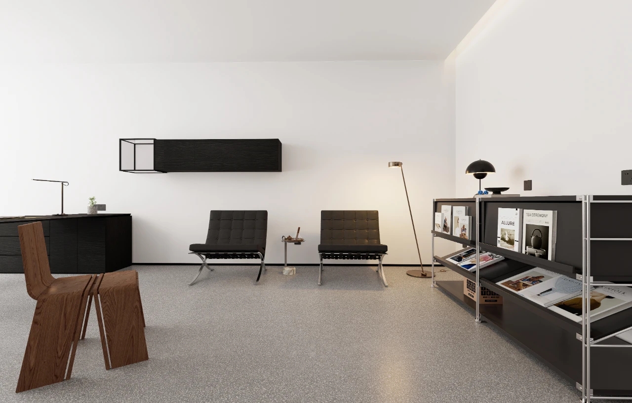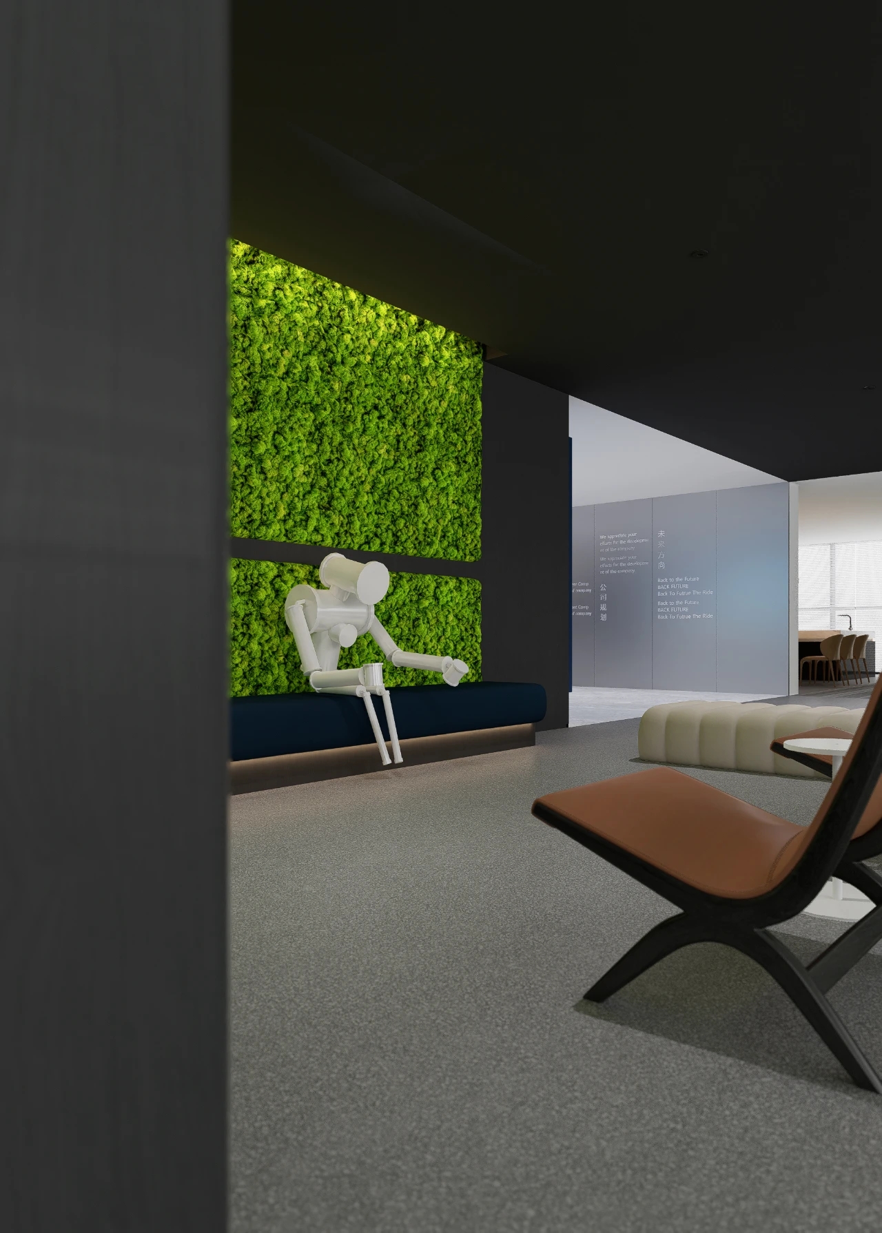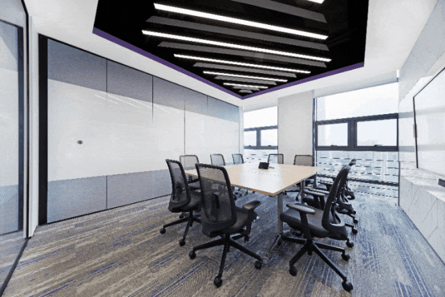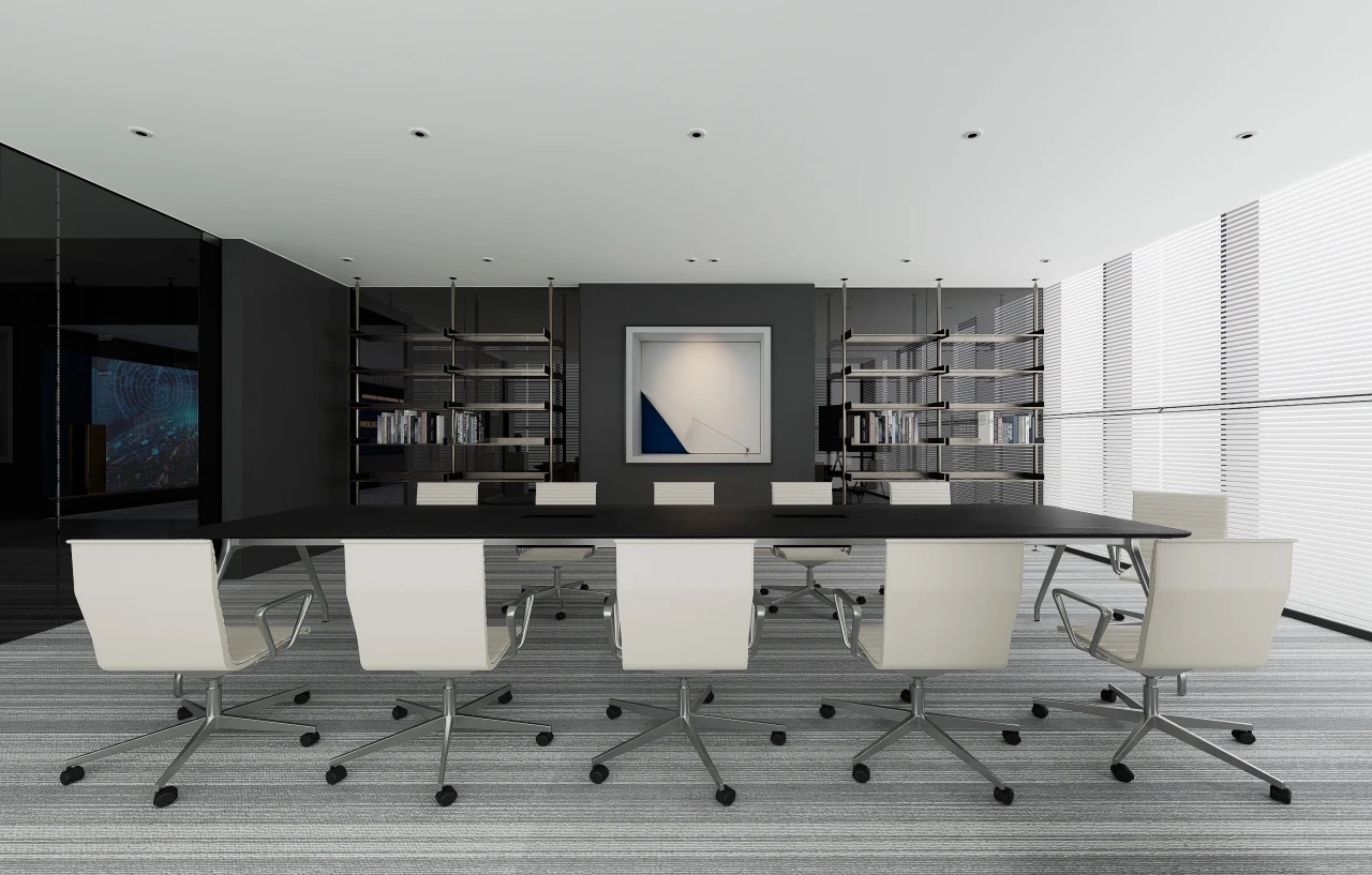 在黑白灰的色调基础上,设计上简洁利落,适当的留白、独特的科技类目,足够的空间感,让处于环境内不过于压抑,融合营造出轻奢舒适又不失艺术的设计氛围感。蓝色背景整体化一,钢板接待台面与石材毛石浑然一体,主打一个艺术氛围气息。化繁为简,大面积的白色运用在空间中,带来宁静舒缓的感受,白与黑的搭配,让人时刻感受空间带来的简约力量。简约的底色中,突出空间建筑感,几何棱角的建筑与利落的软装搭配,让空间具有克制沉静的美。黑与白交错延伸,其中存在将空间动静分区,会客与走道被巧妙分隔。