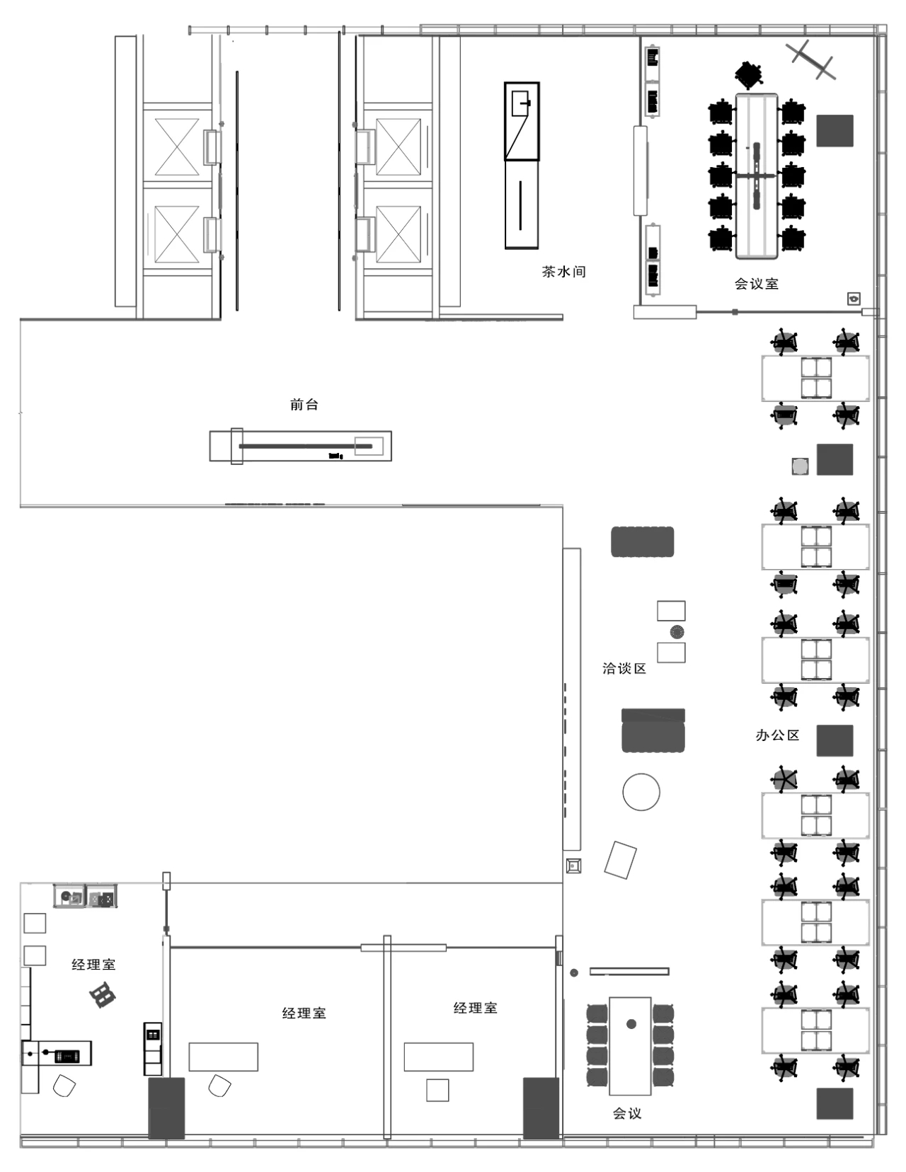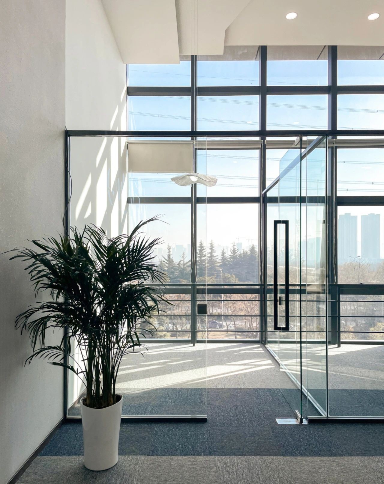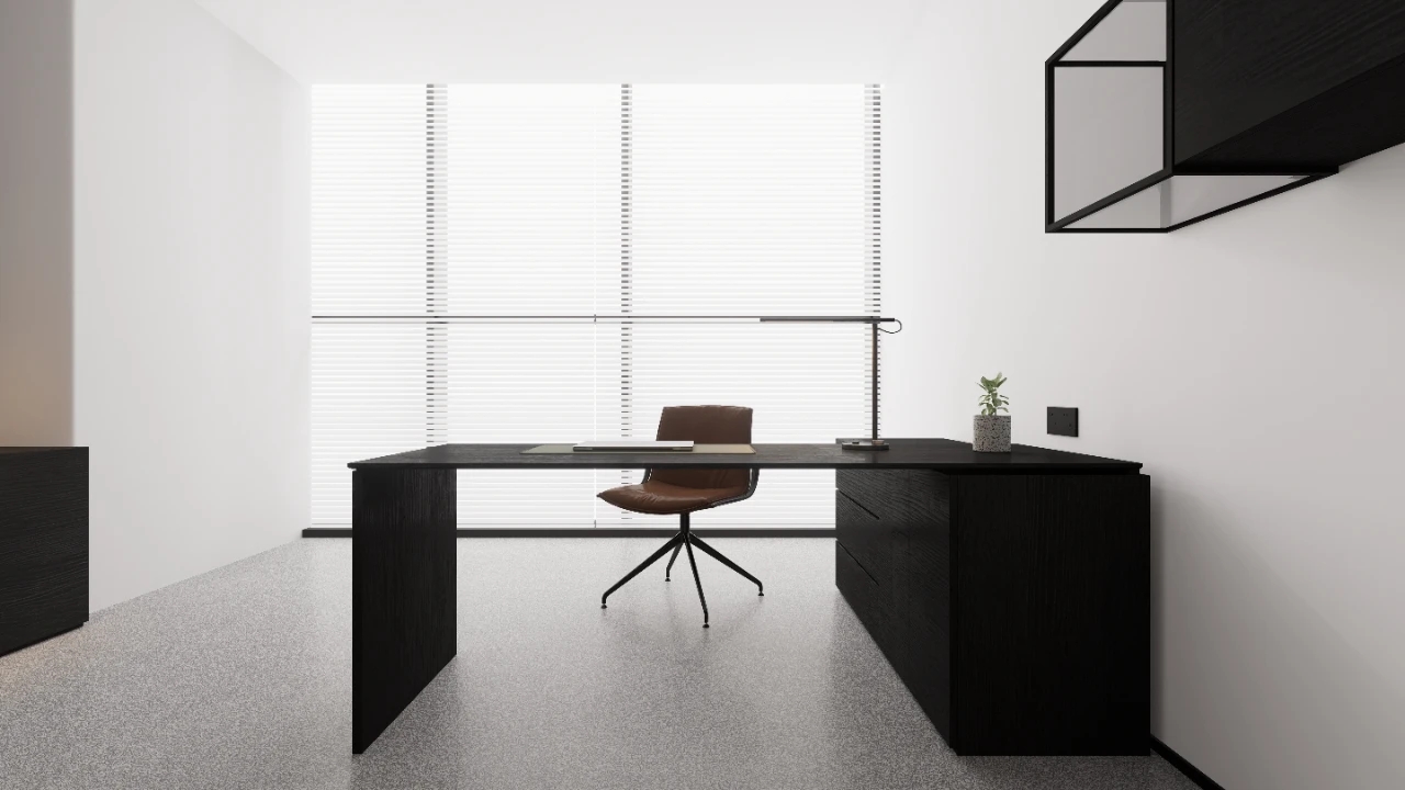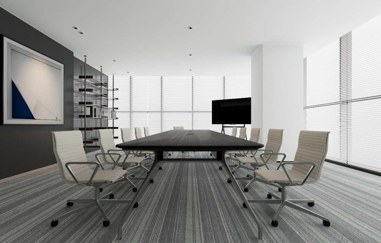 在黑白灰的色调基础上,设计上简洁利落,适当的留白、独特的科技类目,足够的空间感,让处于环境内不过于压抑,融合营造出轻奢舒适又不失艺术的设计氛围感。蓝色背景整体化一,钢板接待台面与石材毛石浑然一体,主打一个艺术氛围气息。化繁为简,大面积的白色运用在空间中,带来宁静舒缓的感受,白与黑的搭配,让人时刻感受空间带来的简约力量。简约的底色中,突出空间建筑感,几何棱角的建筑与利落的软装搭配,让空间具有克制沉静的美。黑与白交错延伸,其中存在将空间动静分区,会客与走道被巧妙分隔。