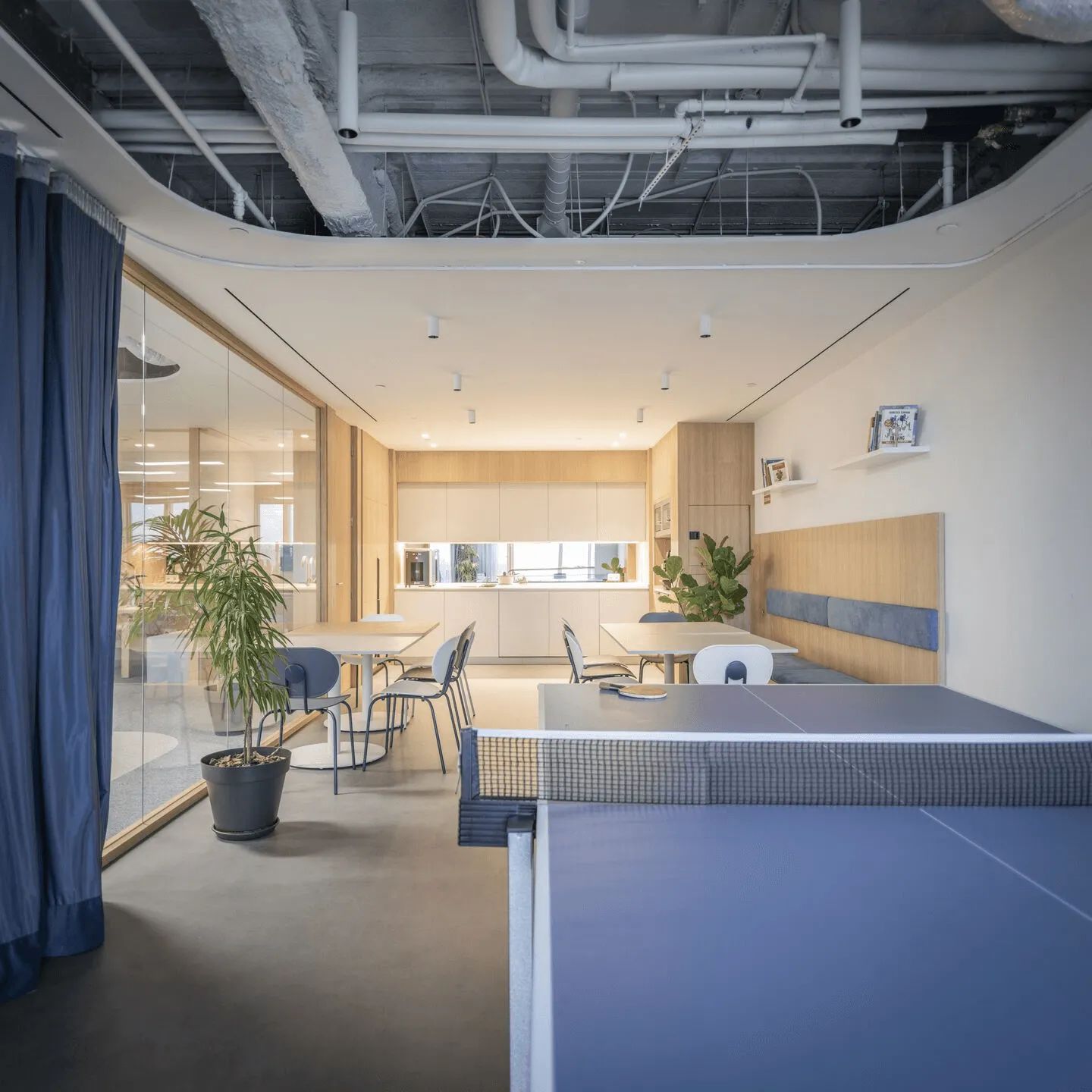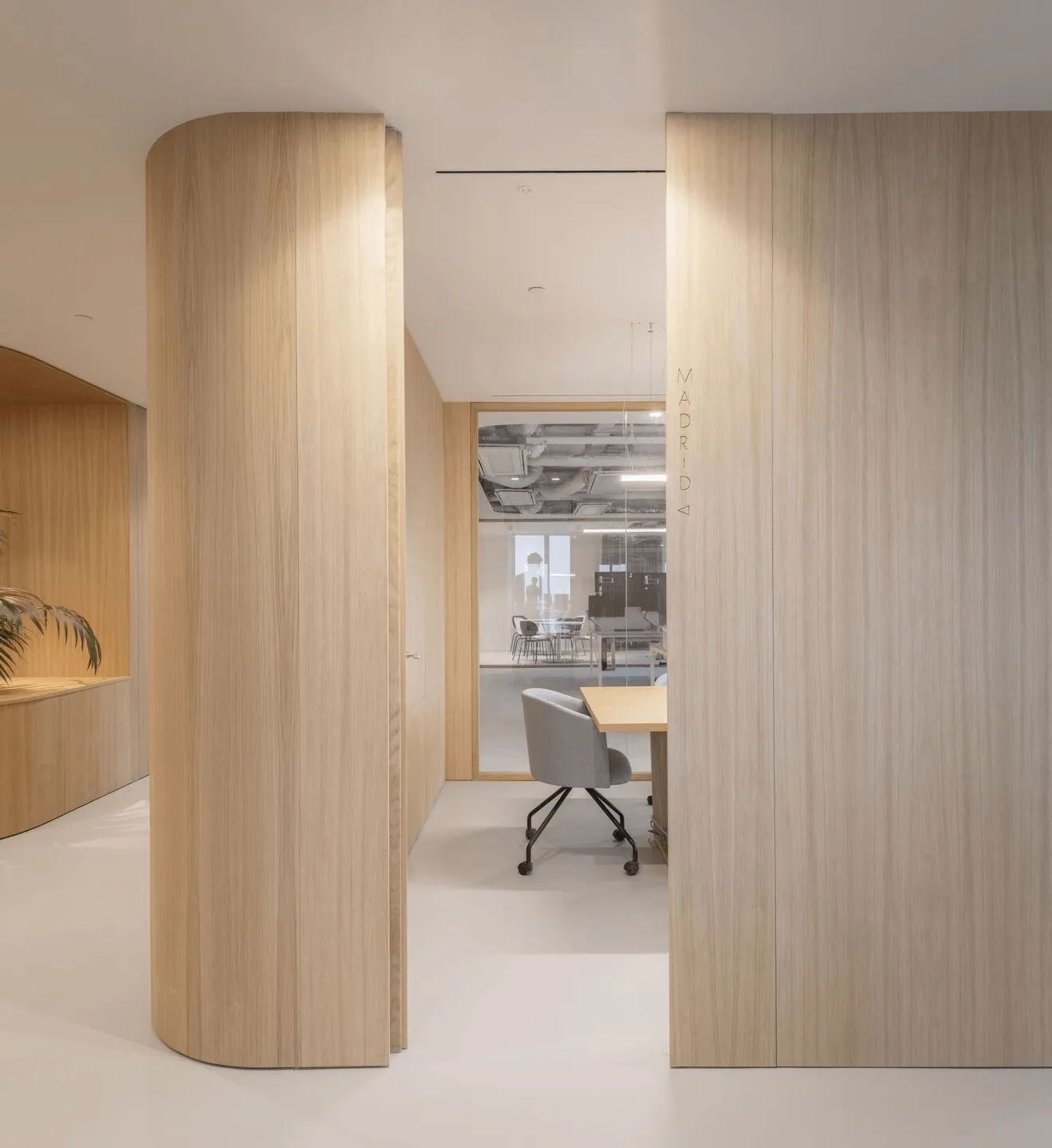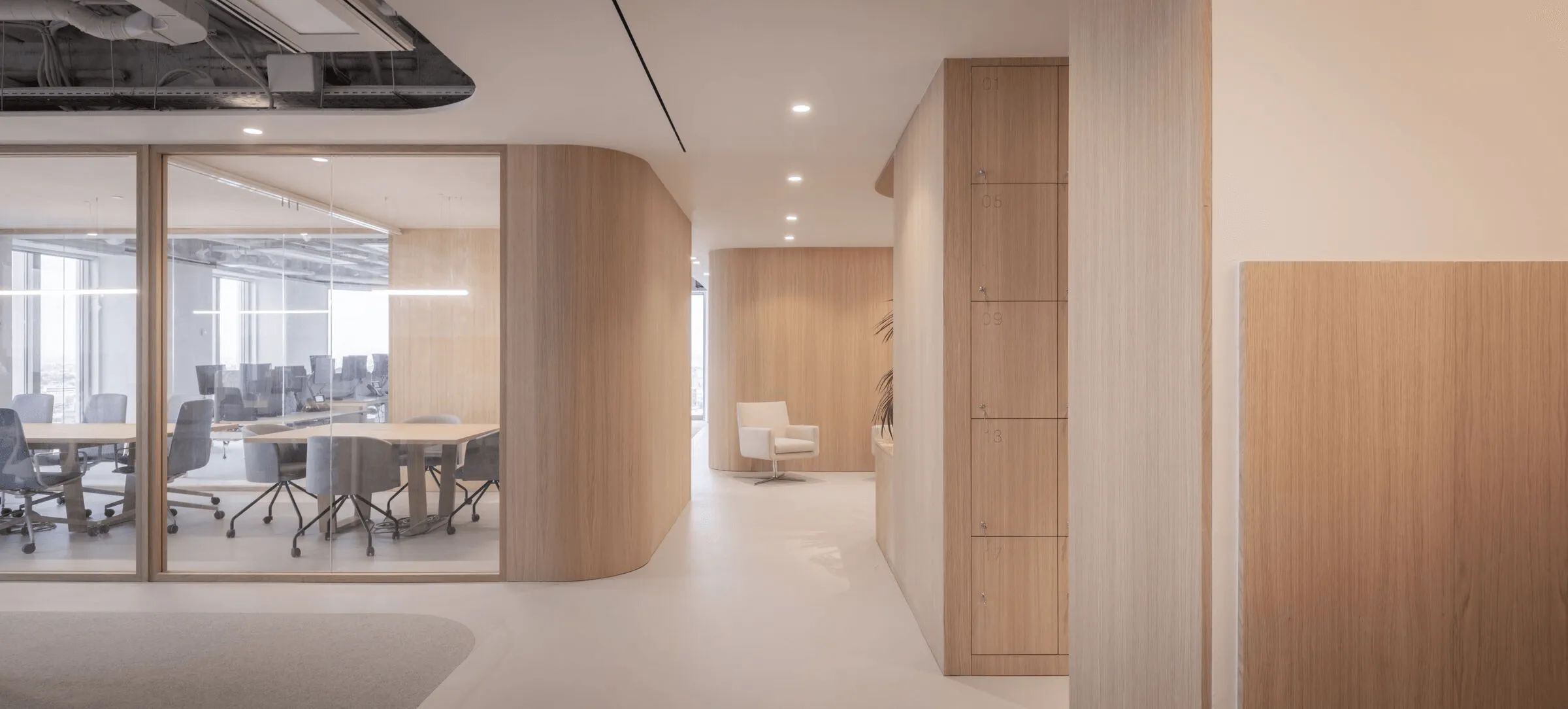 曲线是该项目的基本元素,软化了十字路口的交汇点。隔断、家具和假天花板通过曲线反映和界定投影空间。窗帘元素有助于划分灵活的空间设计注重材料与几何元素的结合,营造理想的工作氛围。木材为走廊和会议室带来温暖,而白色表面则营造出办公室干净、专业的环境。微妙的曲线促进运动,确保舒适度和流畅的感觉。