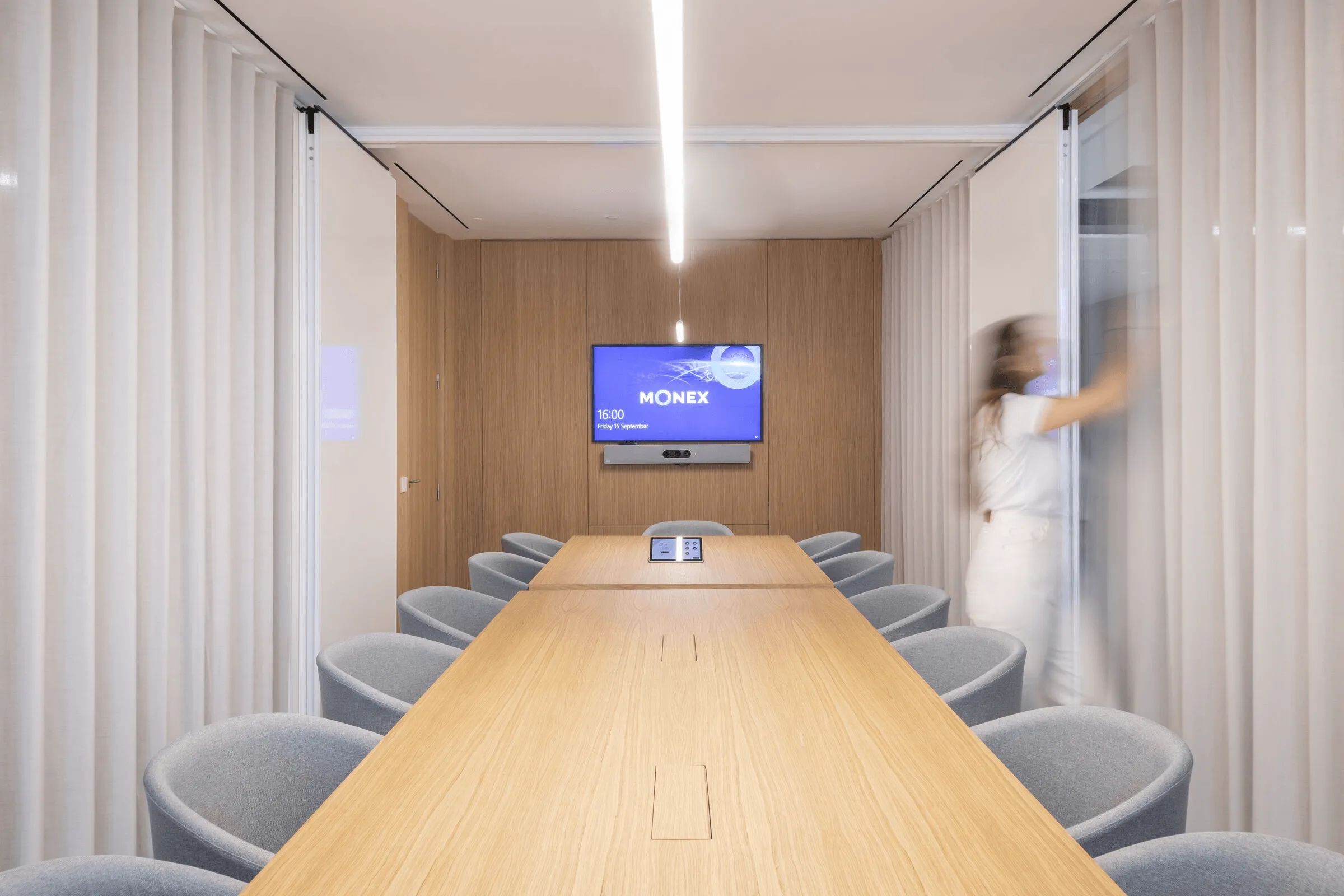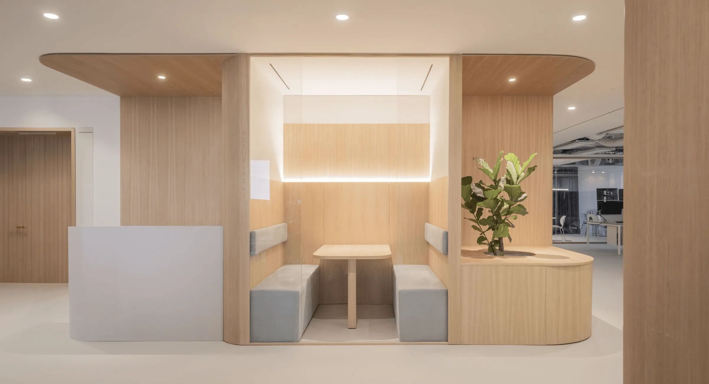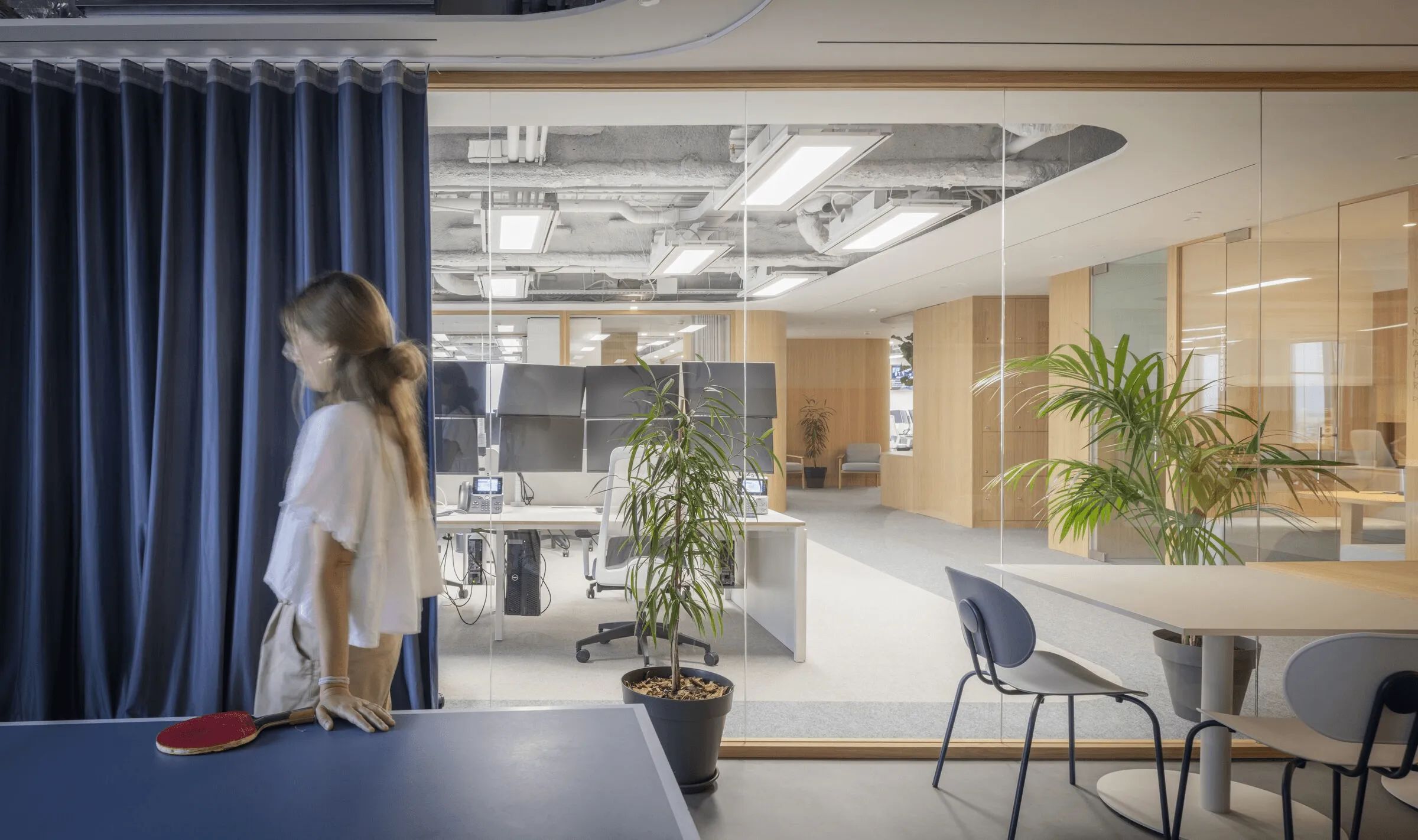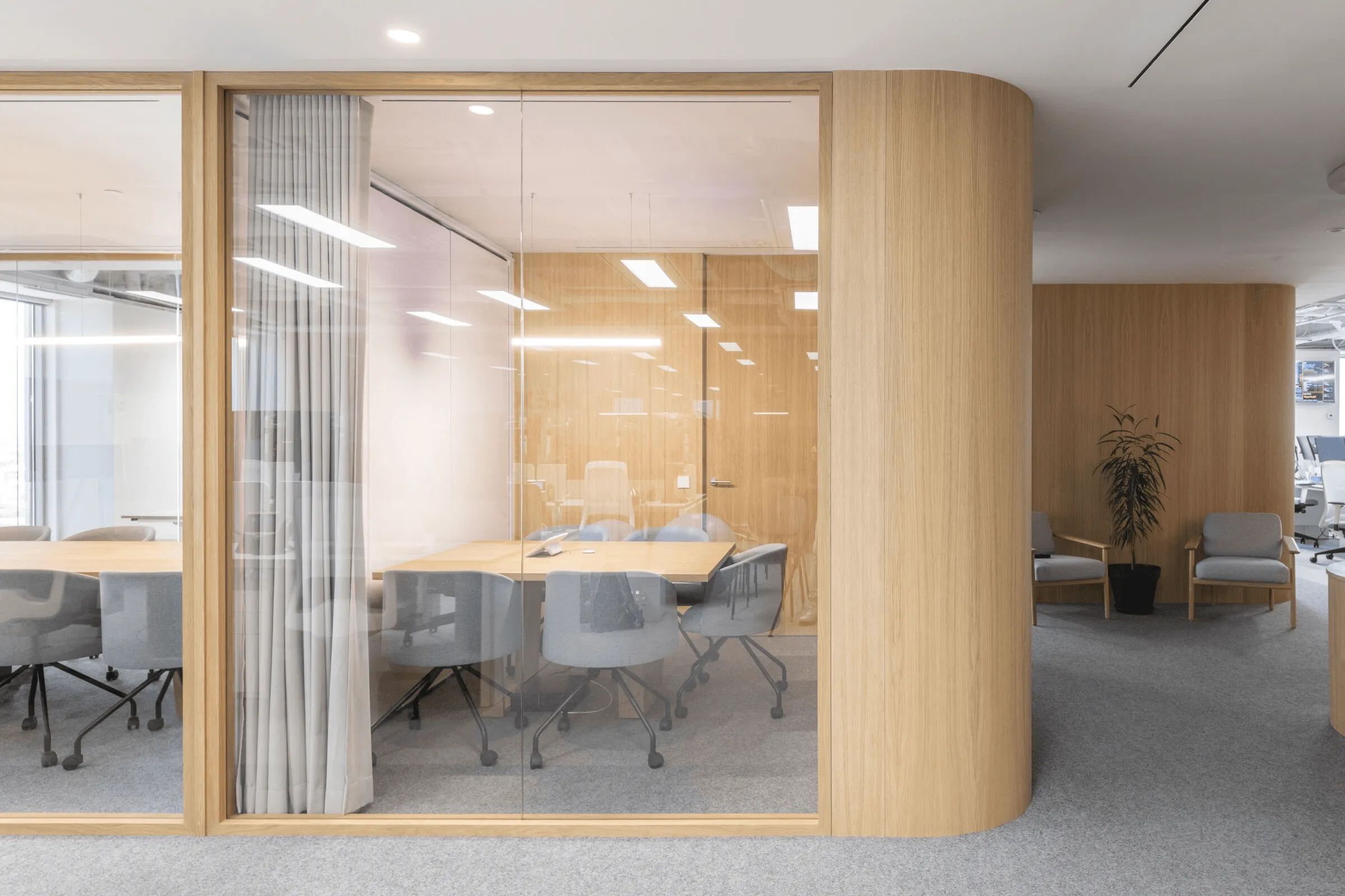 曲线是该项目的基本元素,软化了十字路口的交汇点。隔断、家具和假天花板通过曲线反映和界定投影空间。窗帘元素有助于划分灵活的空间设计注重材料与几何元素的结合,营造理想的工作氛围。木材为走廊和会议室带来温暖,而白色表面则营造出办公室干净、专业的环境。微妙的曲线促进运动,确保舒适度和流畅的感觉。