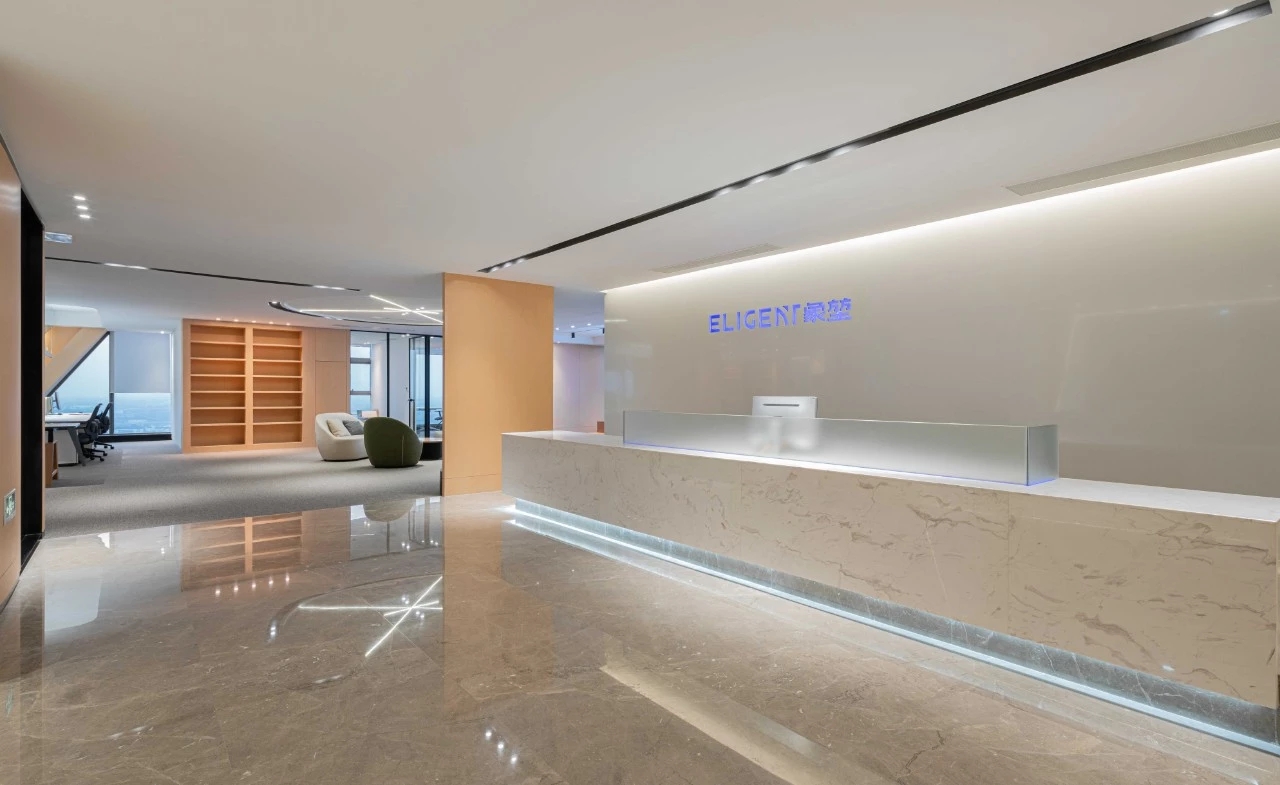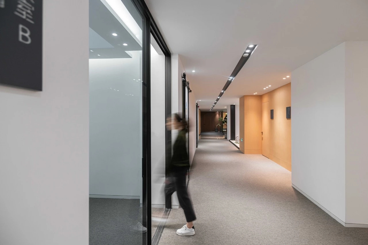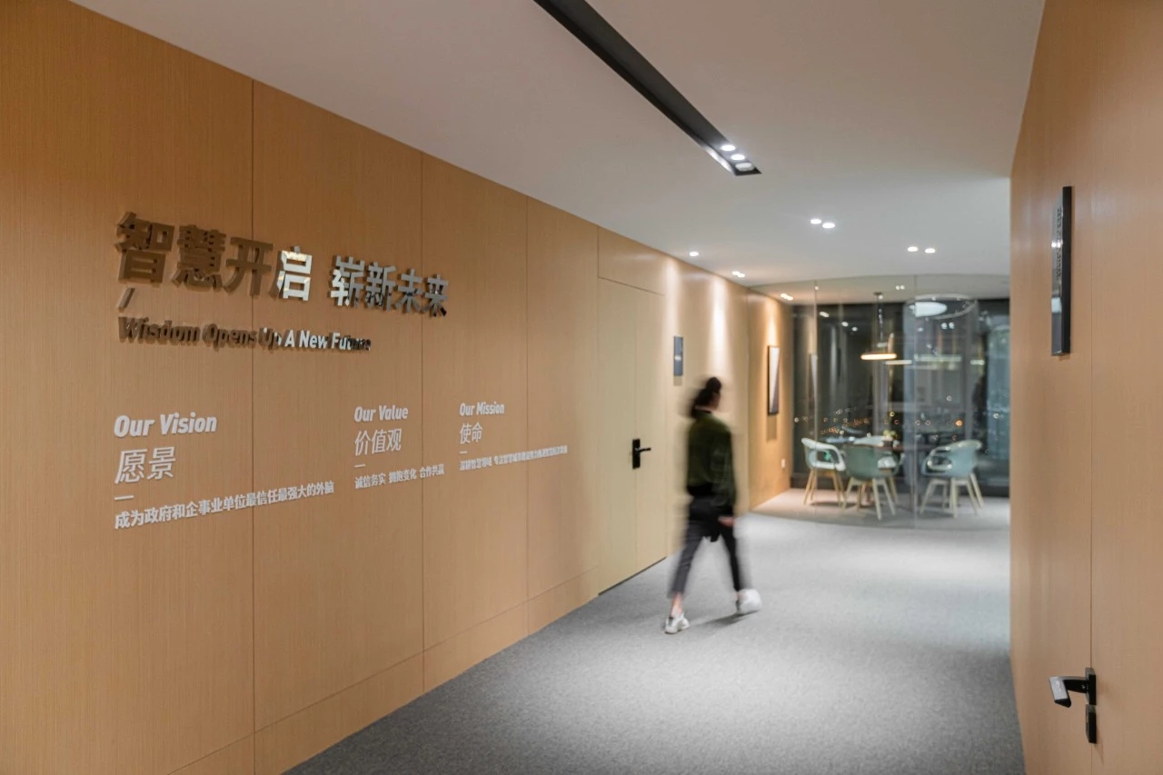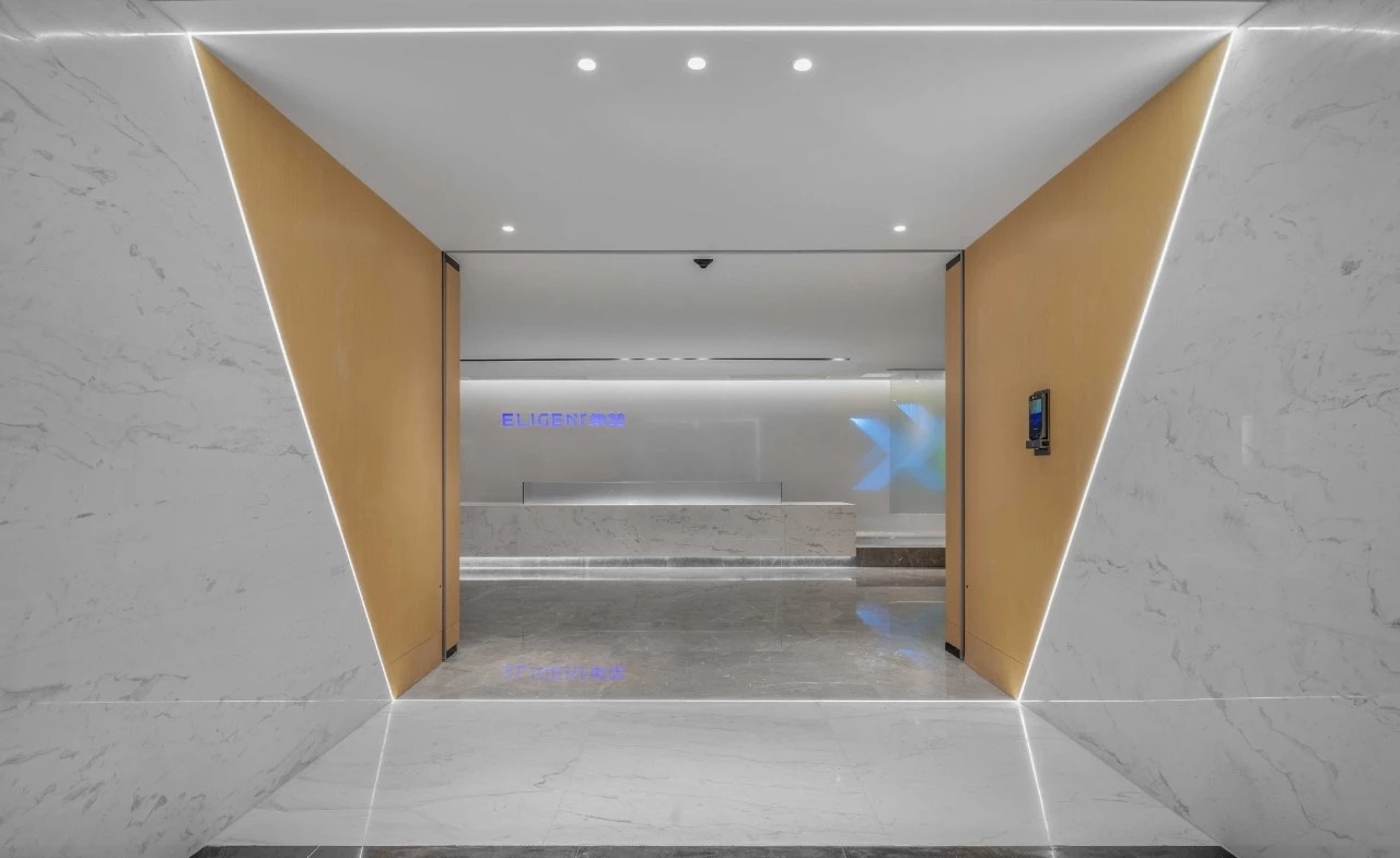 未入门,素雅大气的大理石和温暖自然的木饰面在嵌入式灯带的光影交错下被完美衔接,自有一份现代感。缓步而入,自动感应门缓缓打开,映入眼帘的便是通过水幕投影方式呈现的公司LOGO。