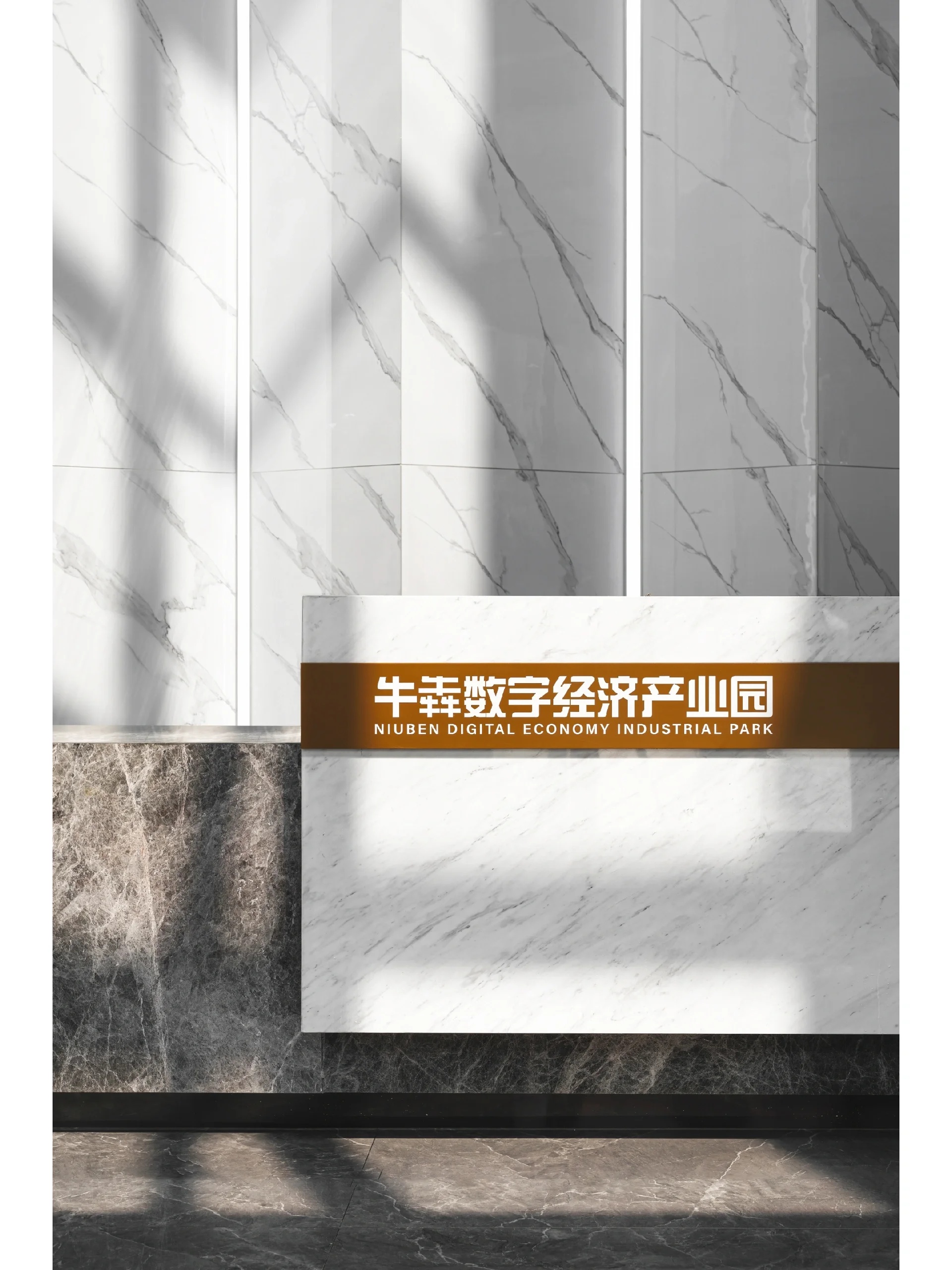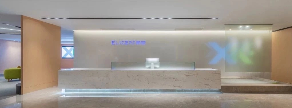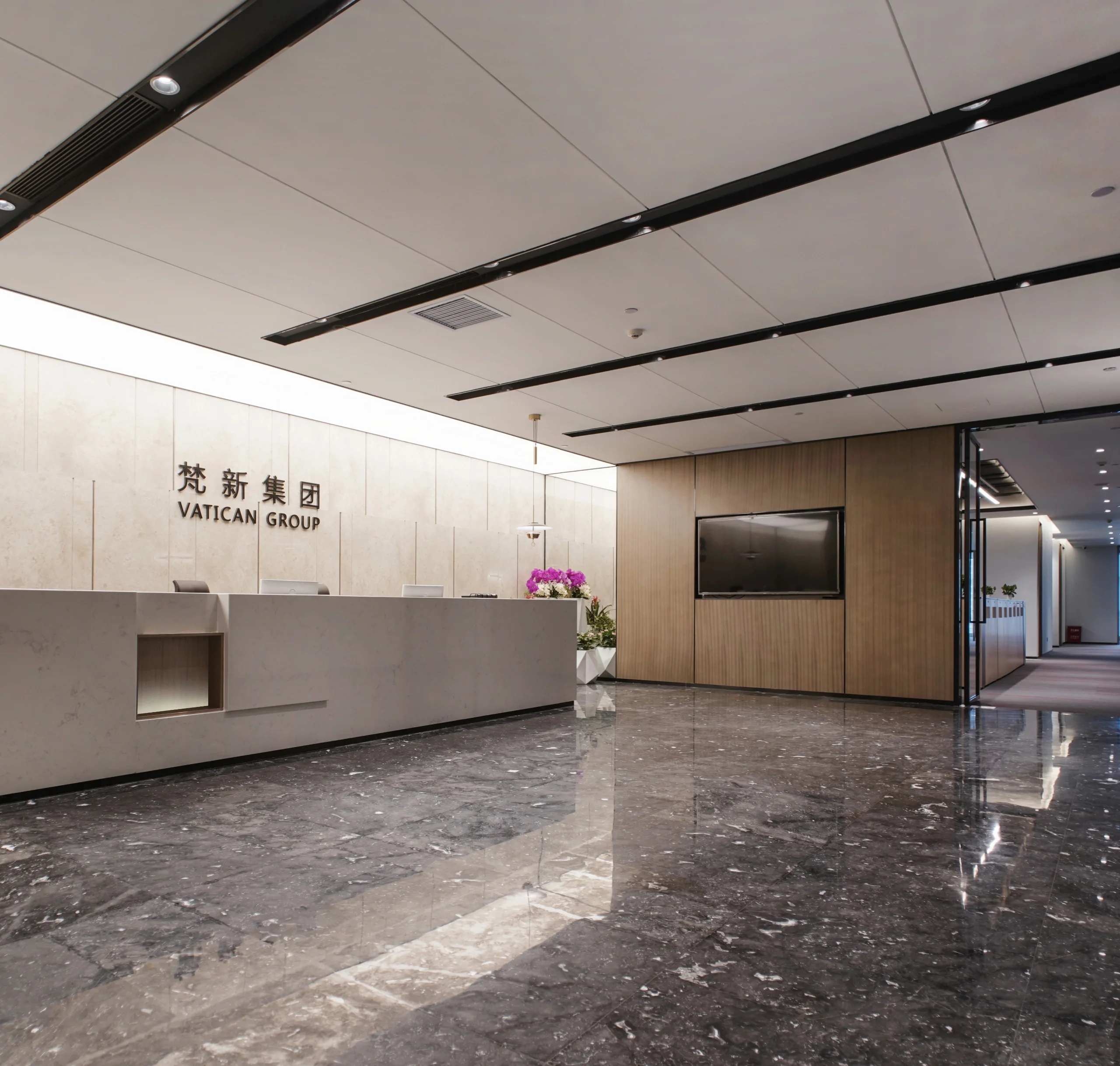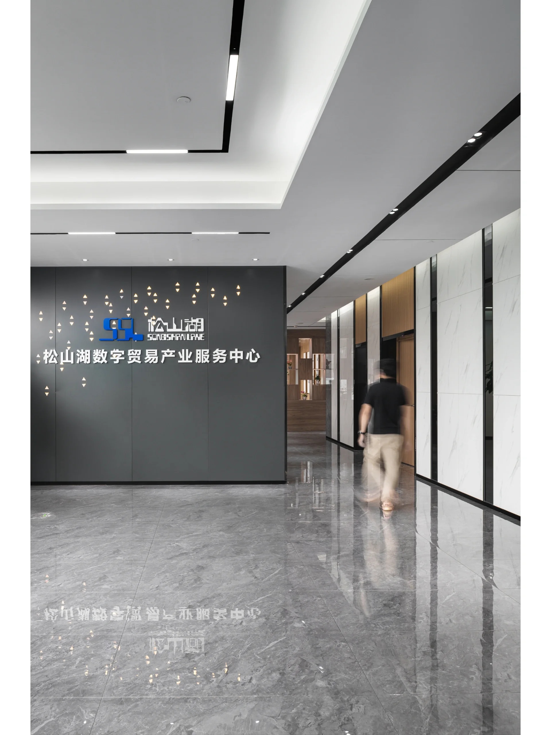 未入门,素雅大气的大理石和温暖自然的木饰面在嵌入式灯带的光影交错下被完美衔接,自有一份现代感。缓步而入,自动感应门缓缓打开,映入眼帘的便是通过水幕投影方式呈现的公司LOGO。