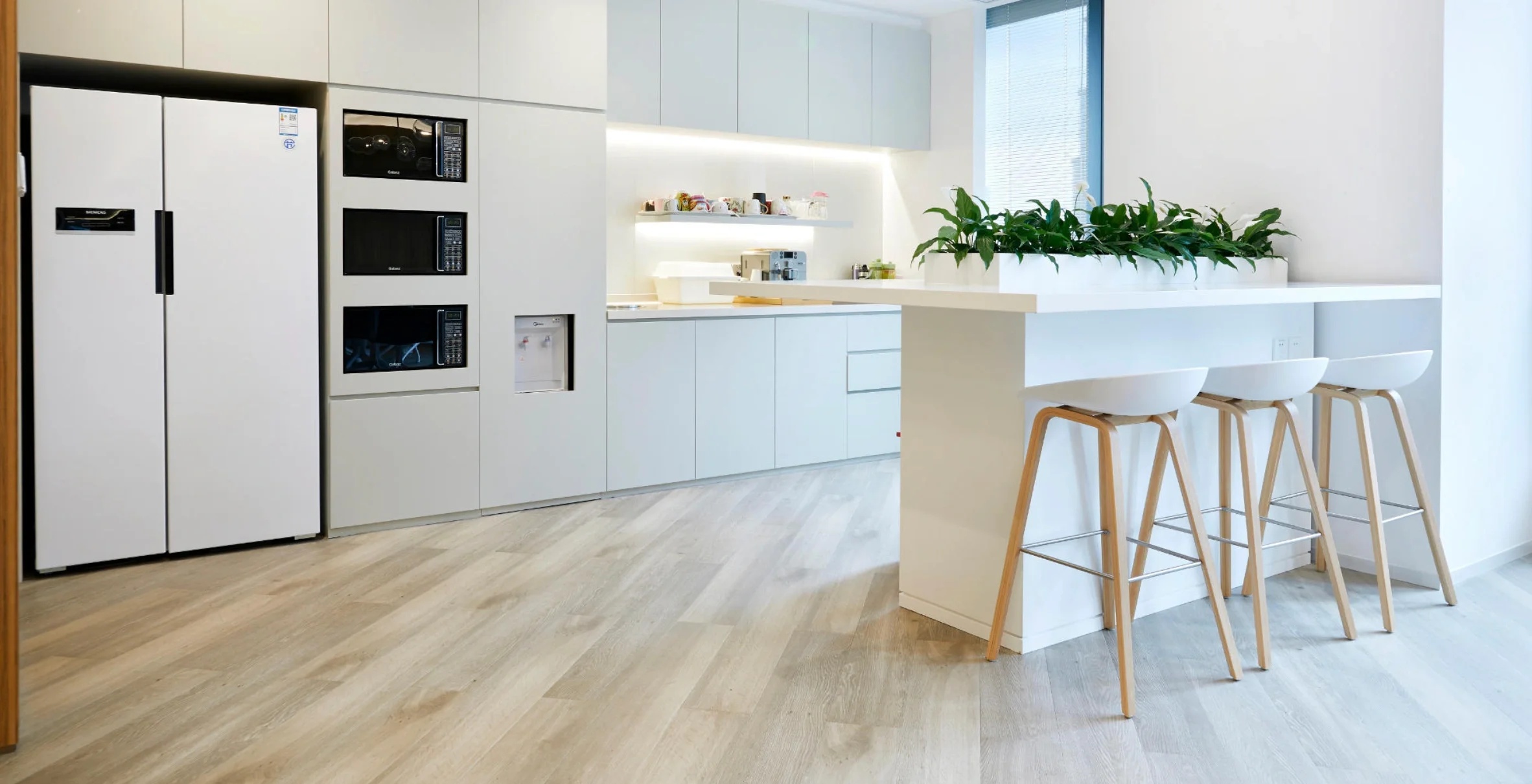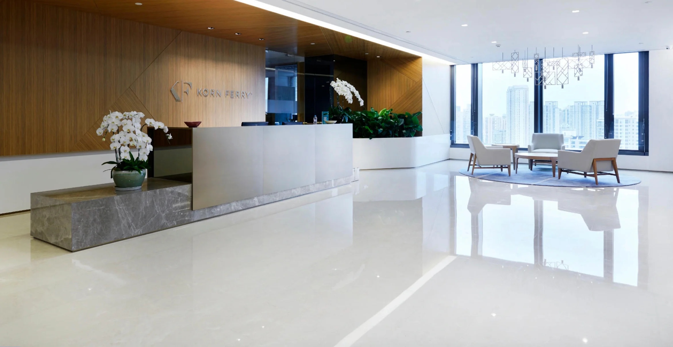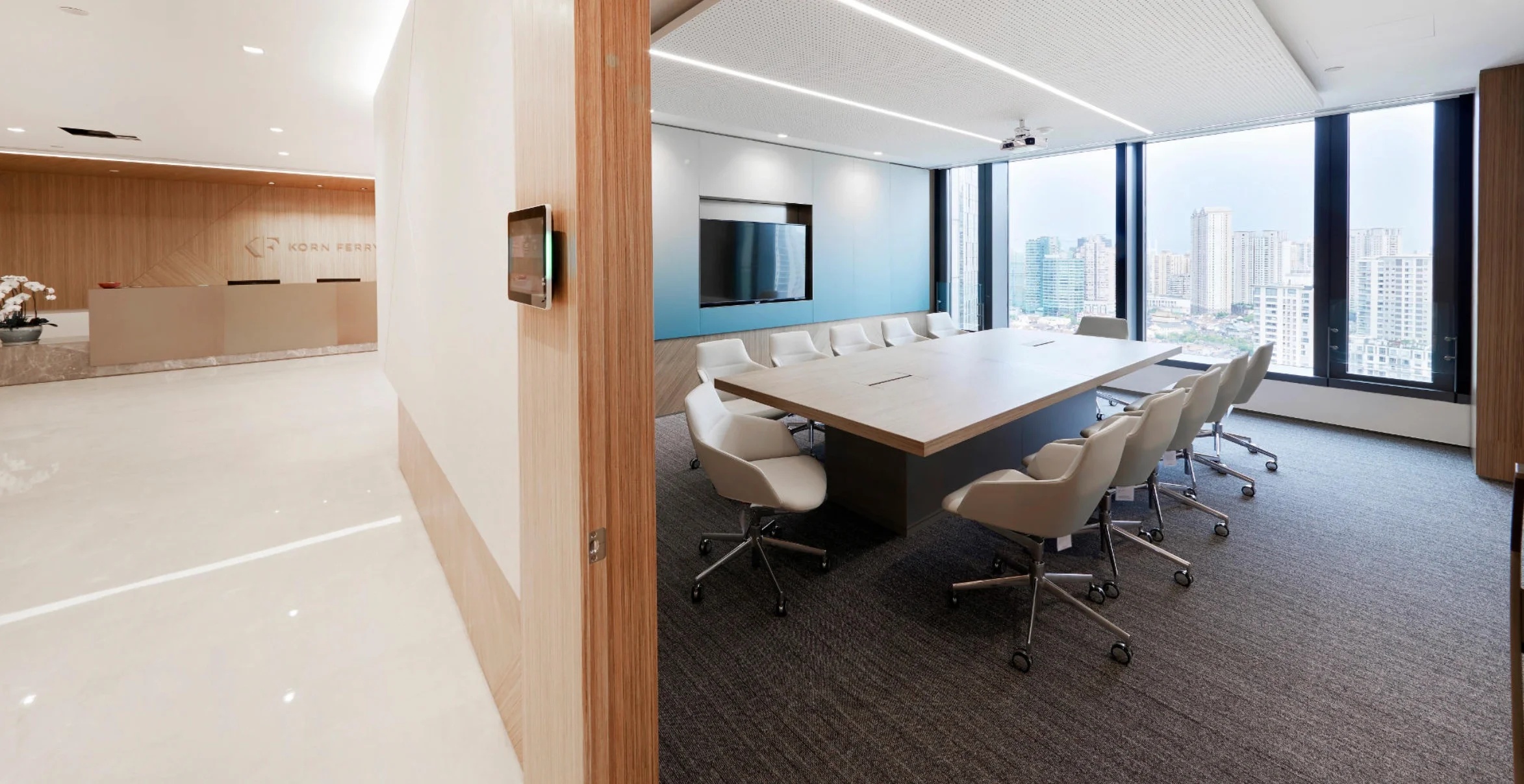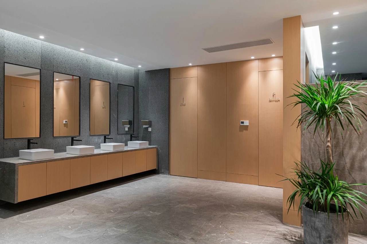 未入门,素雅大气的大理石和温暖自然的木饰面在嵌入式灯带的光影交错下被完美衔接,自有一份现代感。缓步而入,自动感应门缓缓打开,映入眼帘的便是通过水幕投影方式呈现的公司LOGO。