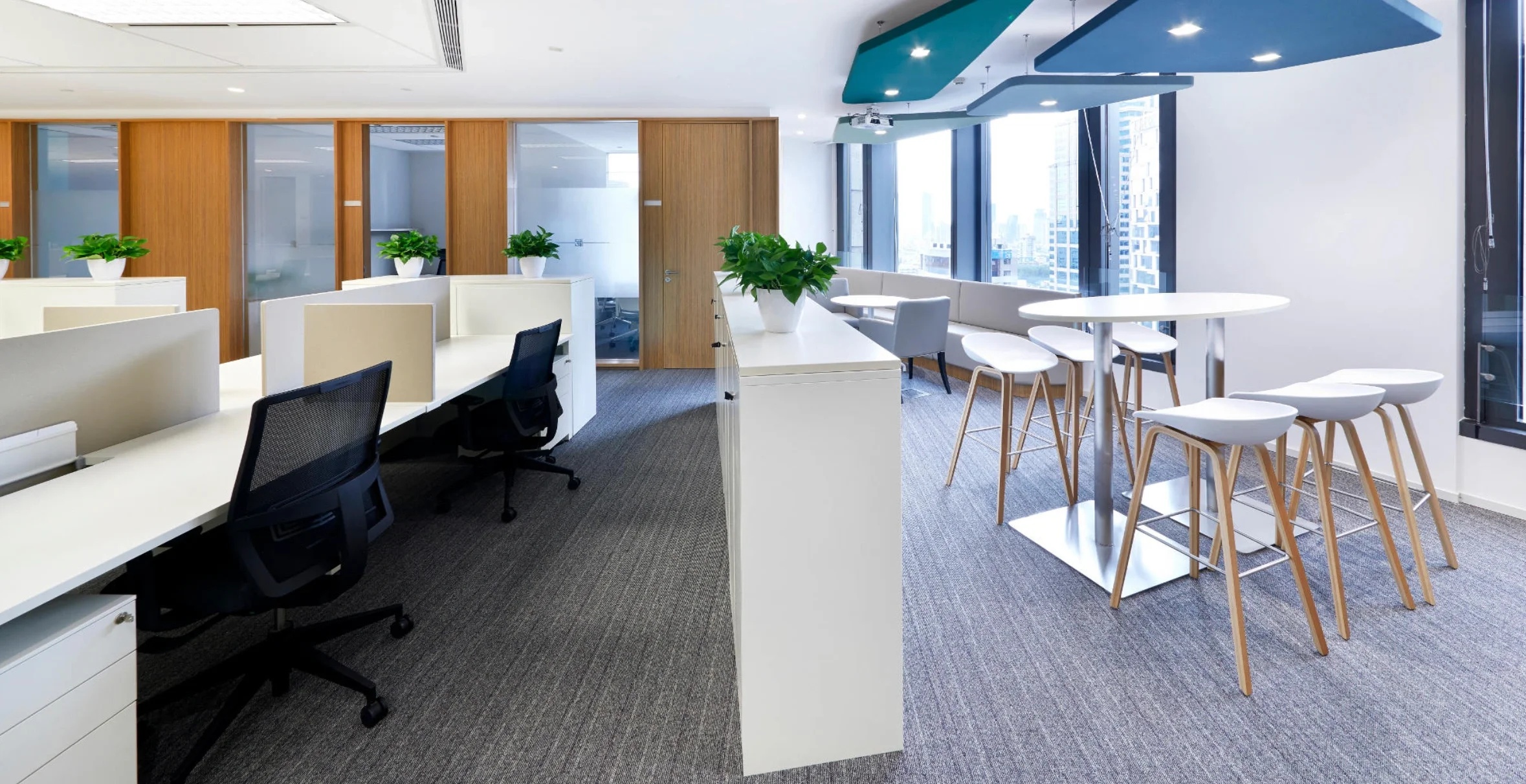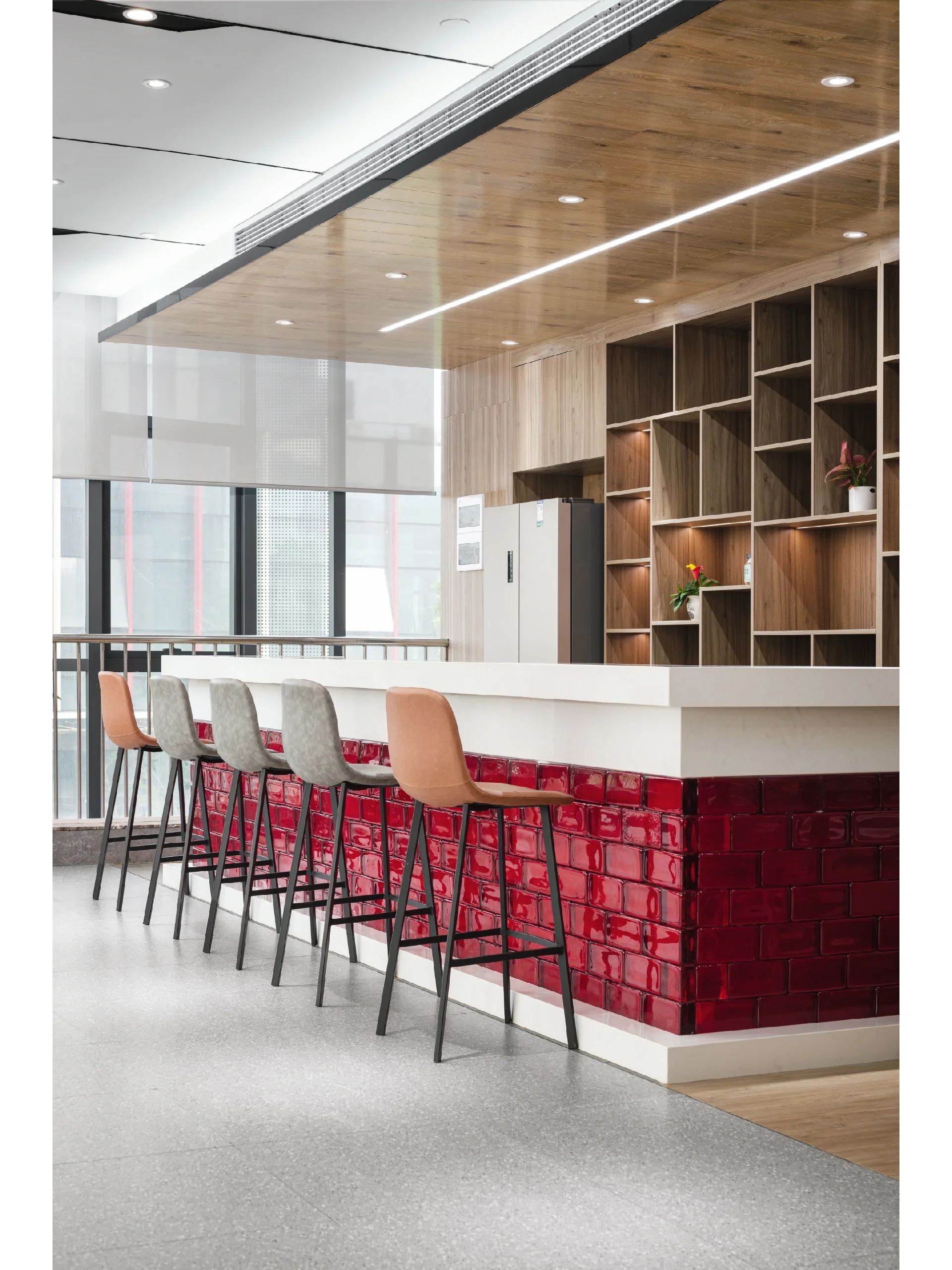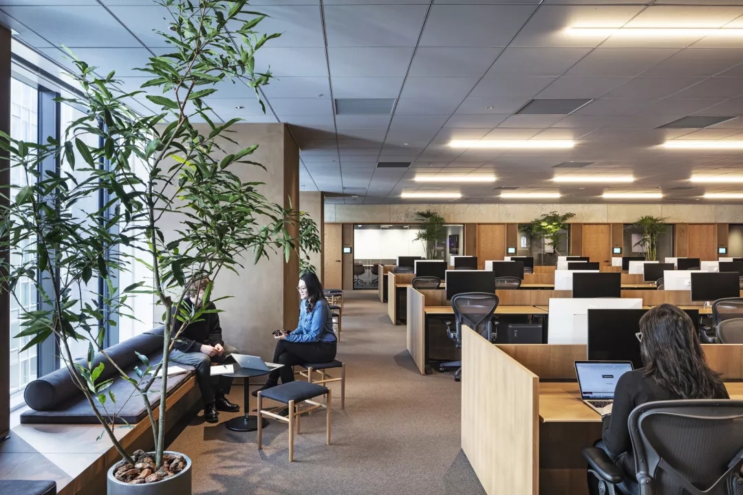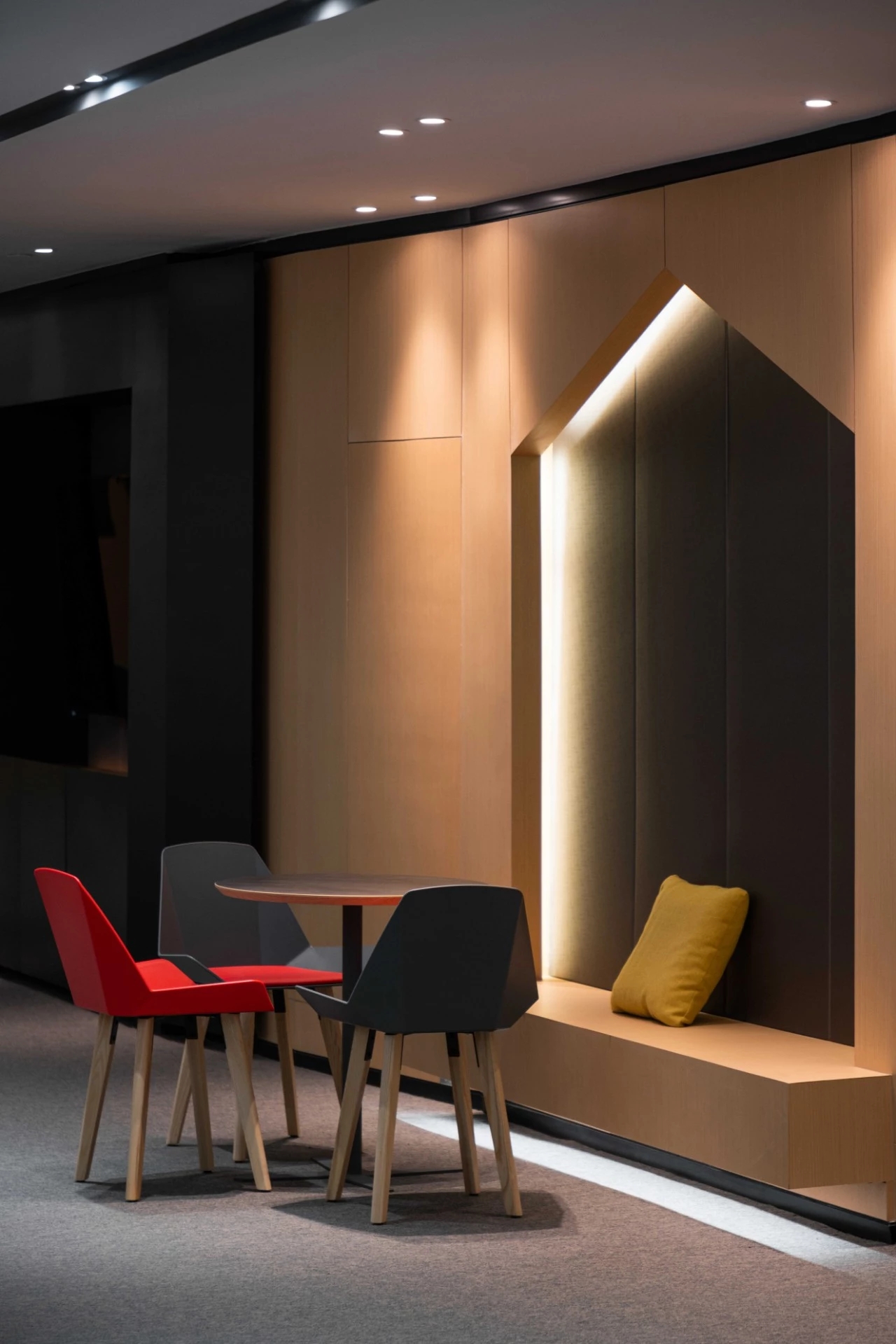 开放办公区边设置的休闲卡座,既可以作为员工休闲放松的地方,也同样可以作为临时接待之处。细节之处更能体现人性化的理念,更具智慧。