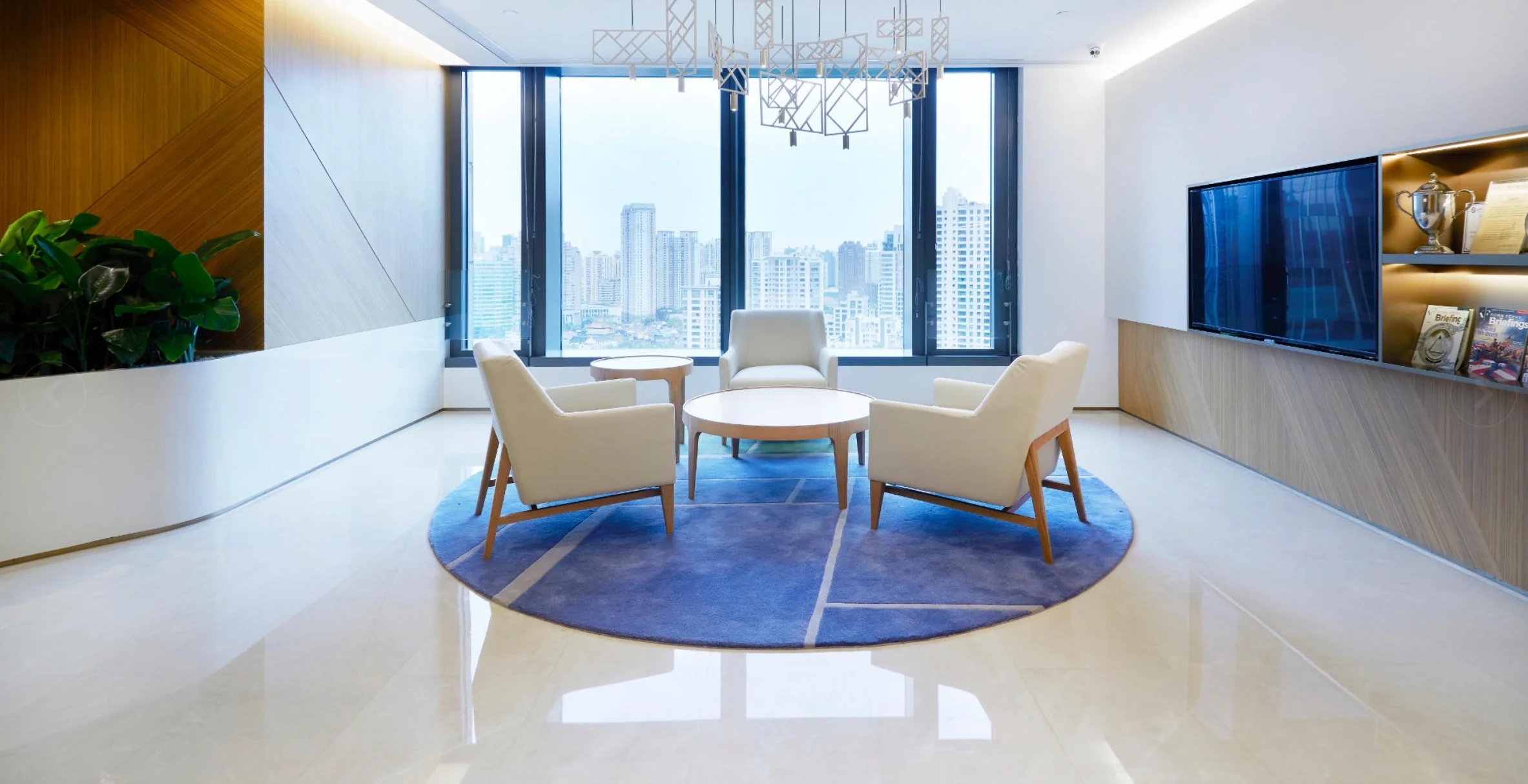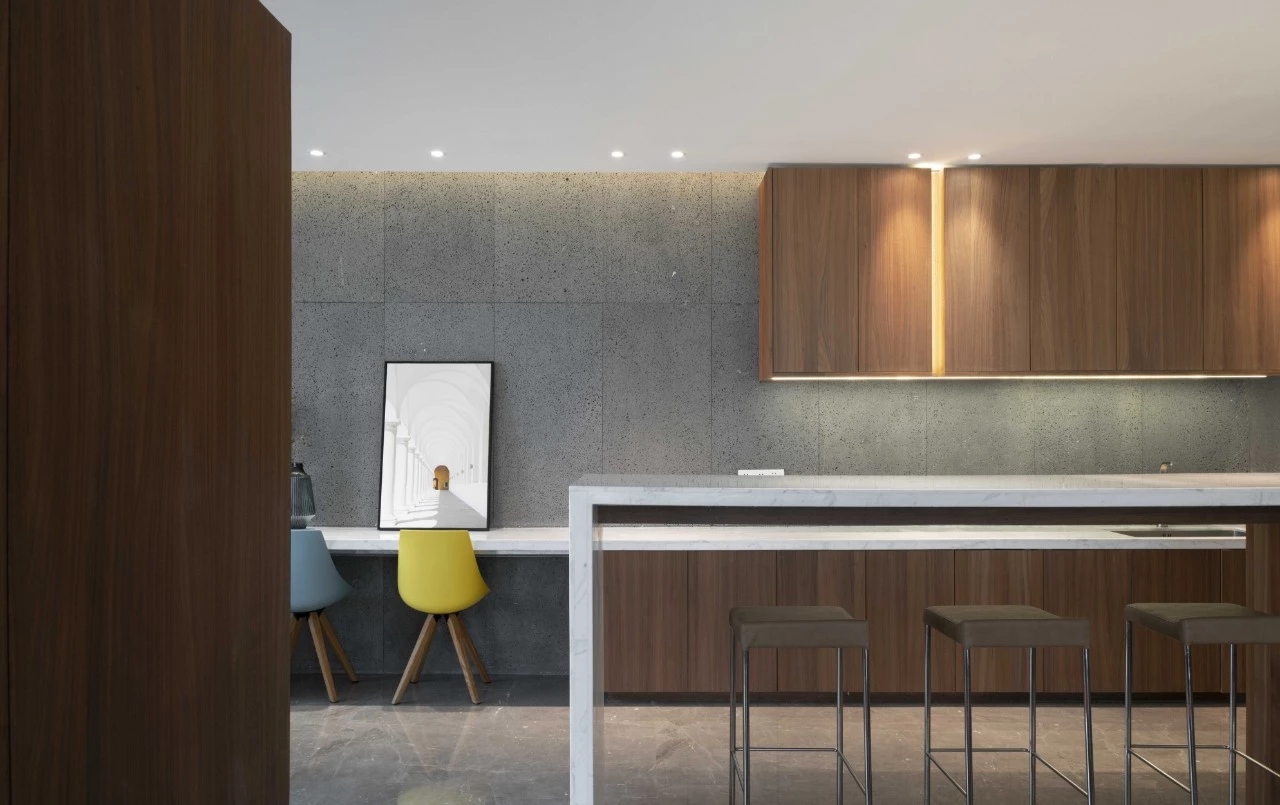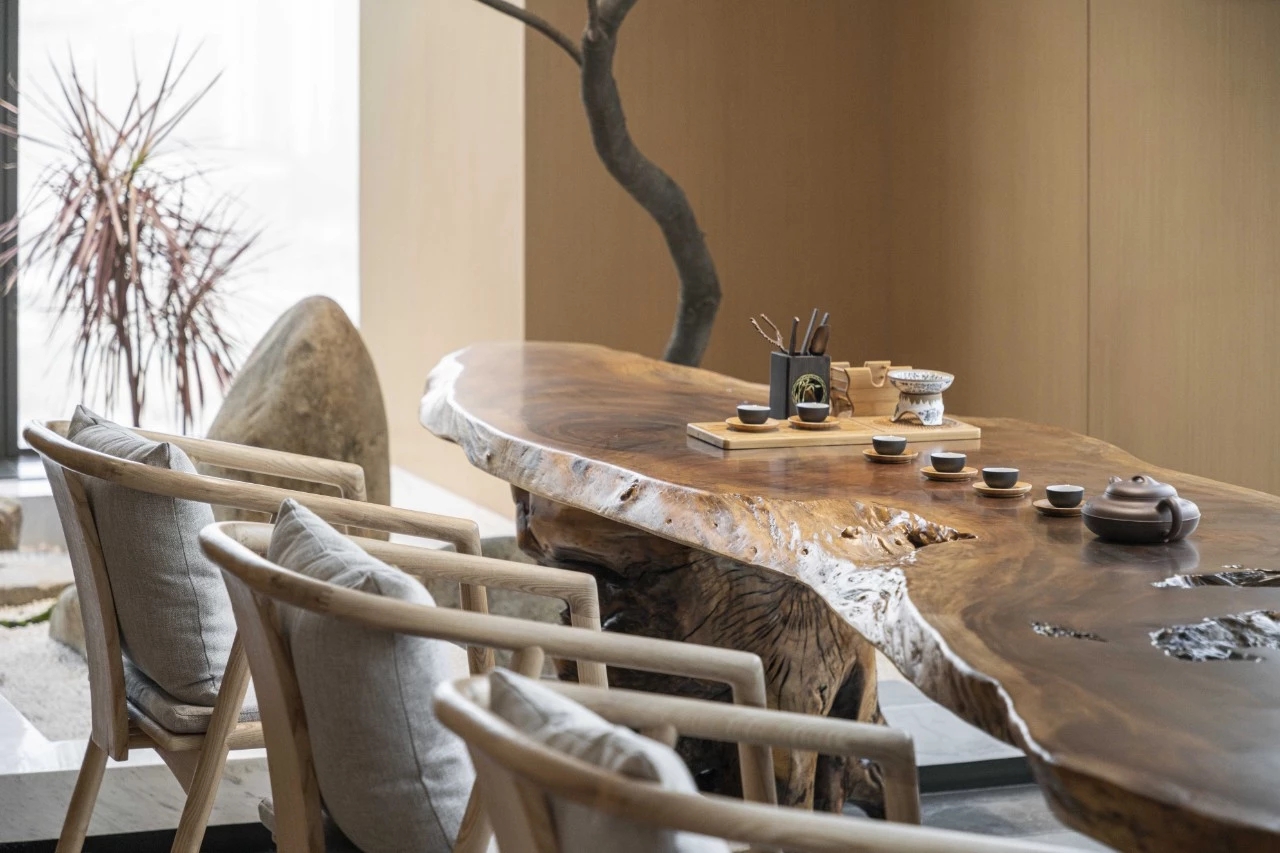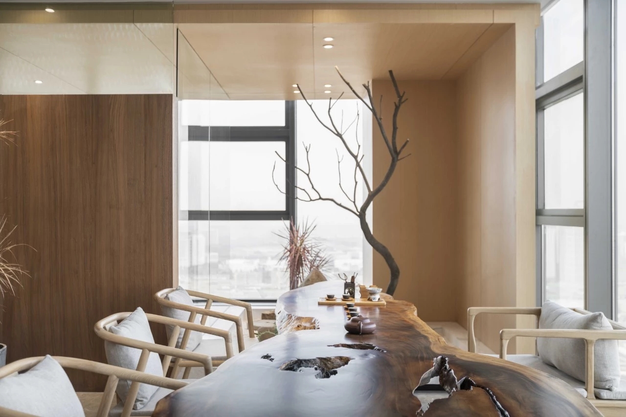 接待前厅,直接以空间线条、材质、体块的组织,将水流、布艺、木感与灯光、玻璃、金属感交错融合,共同呈现出一个简洁通透,细腻自然的初印象空间。
