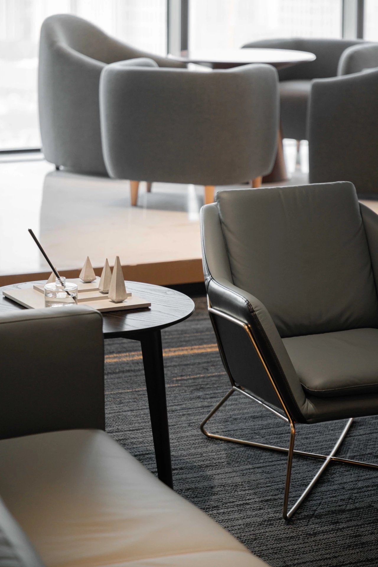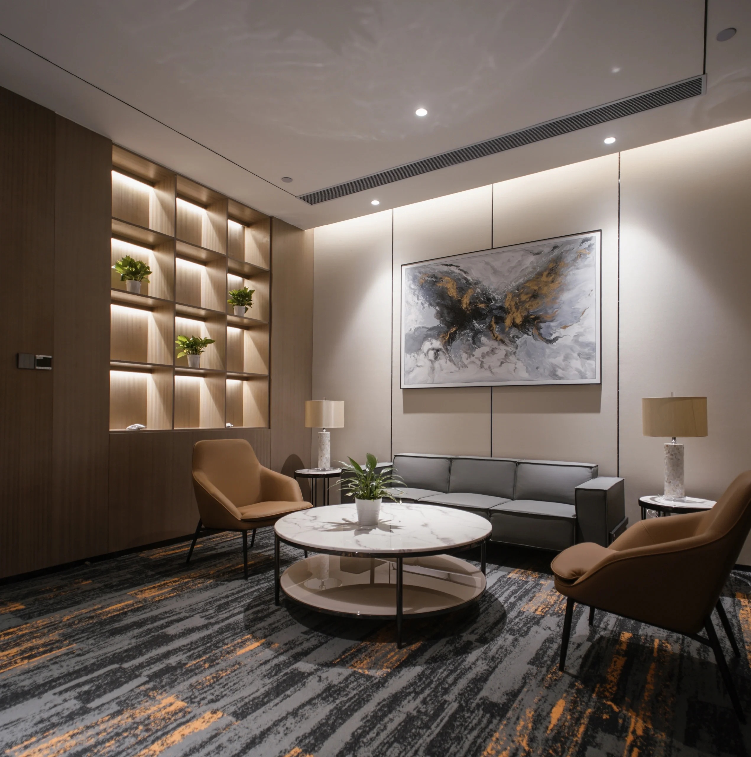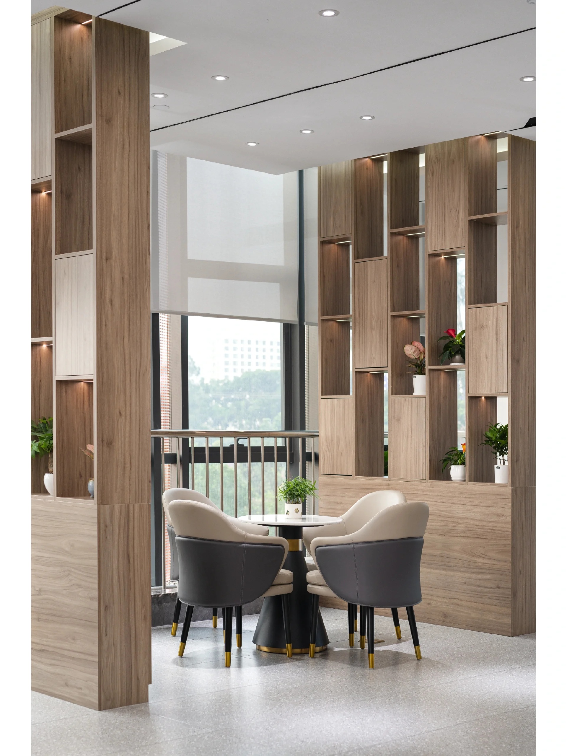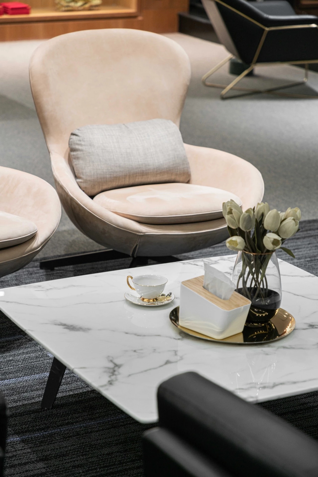 接待前厅,直接以空间线条、材质、体块的组织,将水流、布艺、木感与灯光、玻璃、金属感交错融合,共同呈现出一个简洁通透,细腻自然的初印象空间。