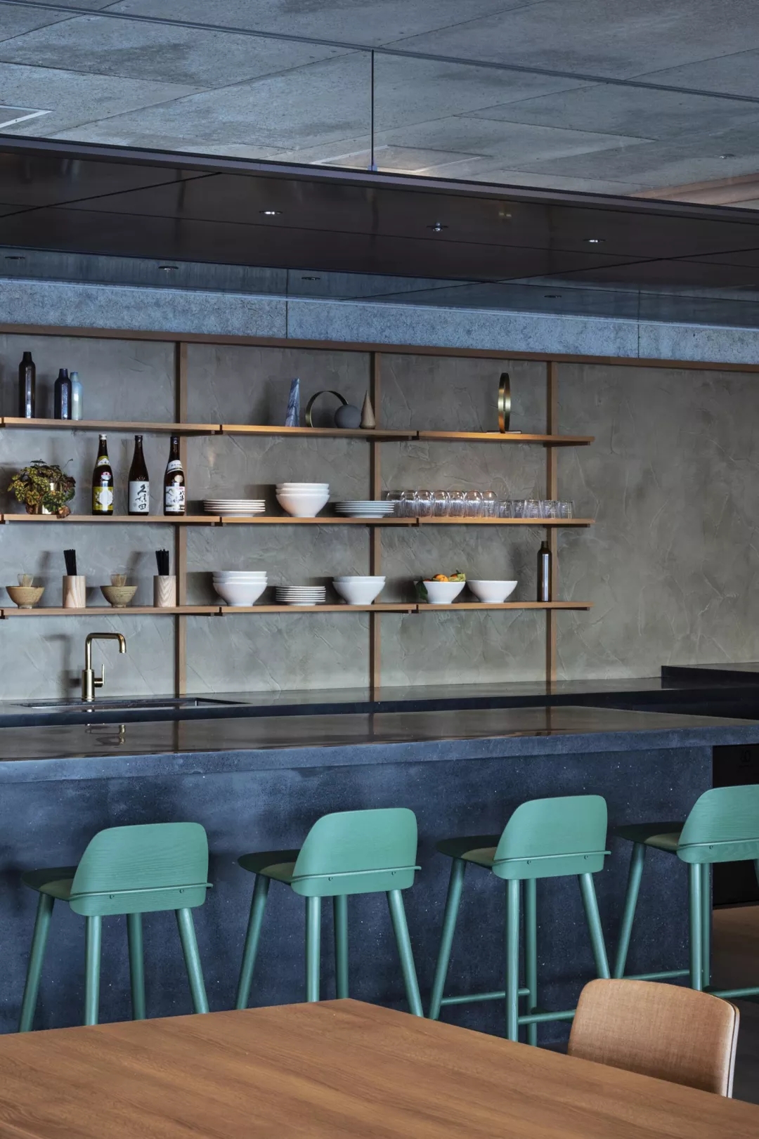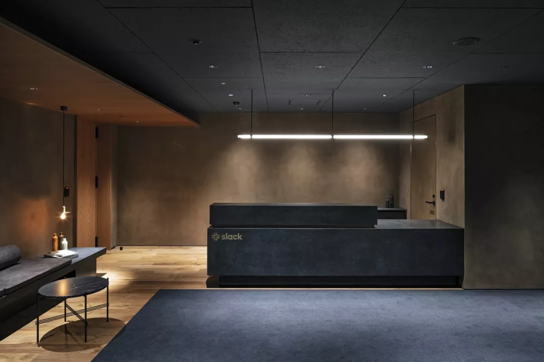 除了包围休息区中一个矮胖早餐岛的海绿色高脚凳以外,整个工作区的其他颜色均保持深色–沙发,边桌和大堂柜台都是黑色。浅色木材则被用来制作公共工作台和员工的正式办公桌。