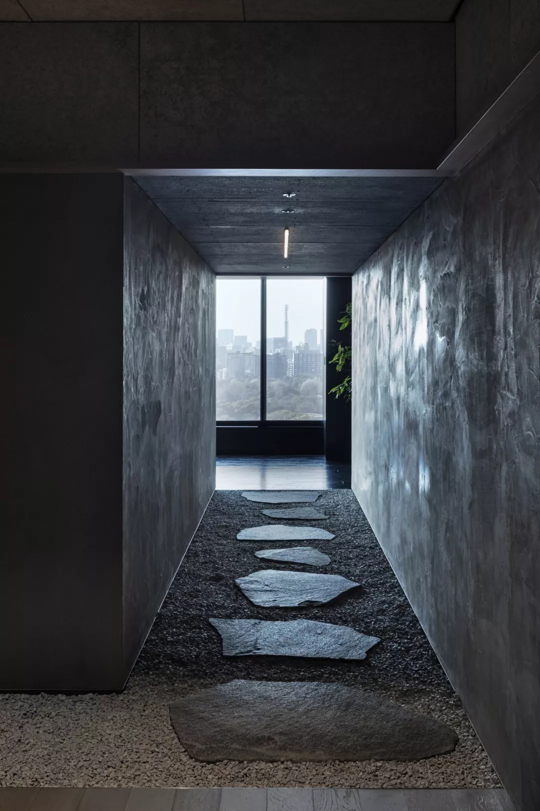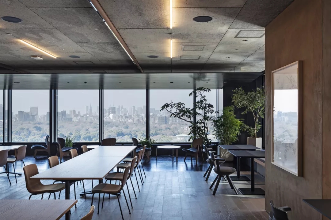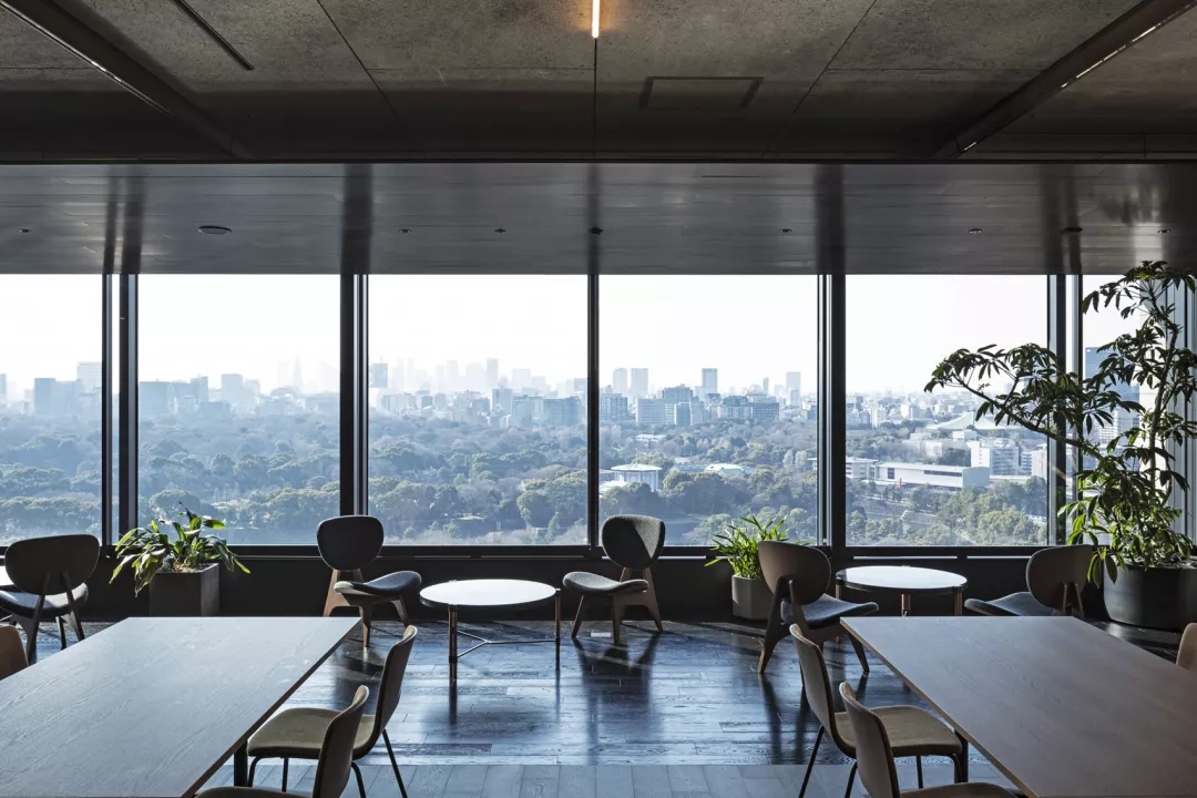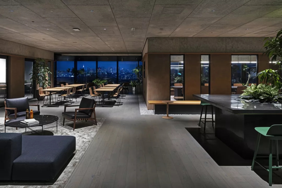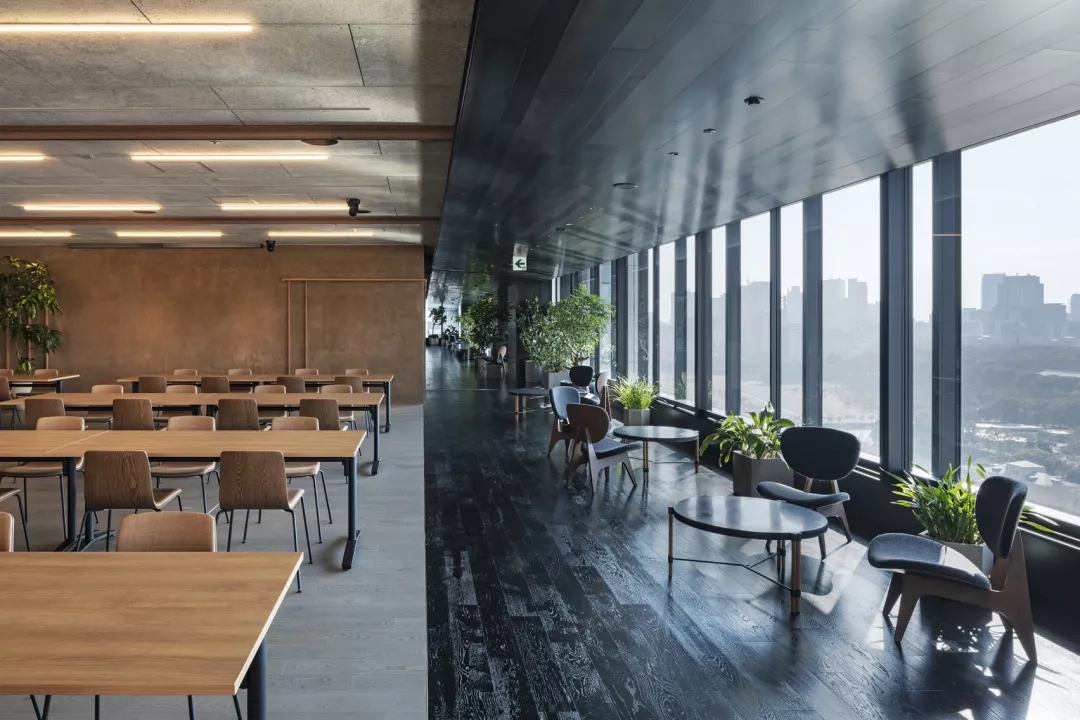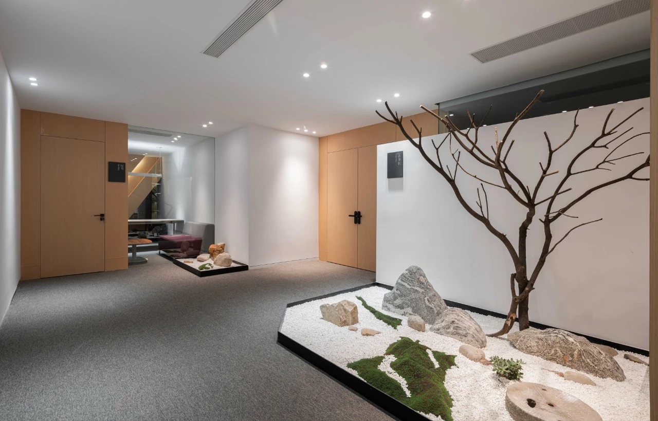 日式风格办公室 ‖ 办公室的外围可以俯瞰葱郁的花园,并以黑色喷漆天花板和地板。并定期放置以深灰色织物装饰的椅子,石凳和绿叶盆栽。 办公室里铺着砂石的走廊进一步向室外致意,走廊的中心是一系列垫脚石,很像池塘对面的景观。
