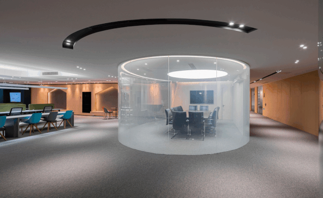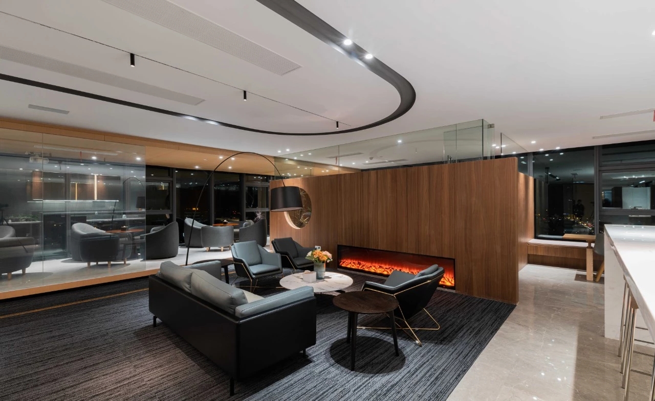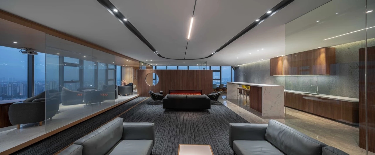 空间设计摒弃传统办公设计,采用开放式办公,以黑、灰、白、木色为主,通过各种创新手法与技术的运用,打造出一个现代而又人性化的智慧办公空间。