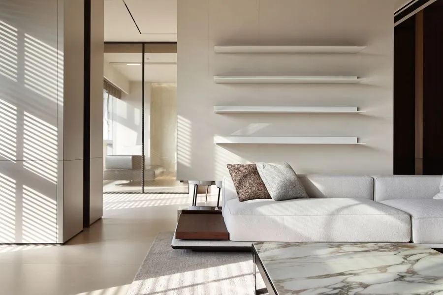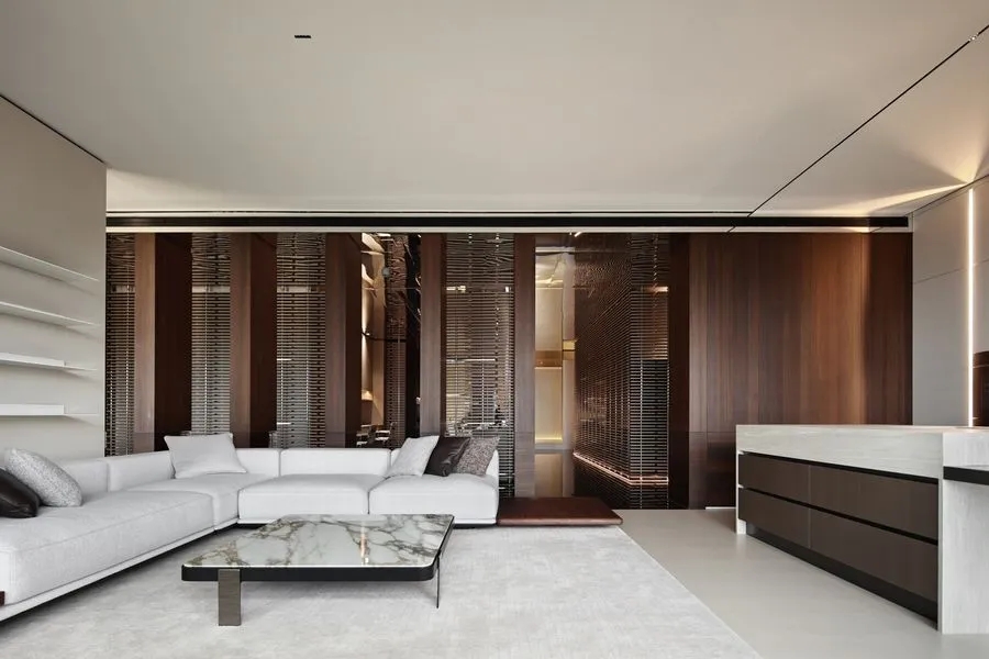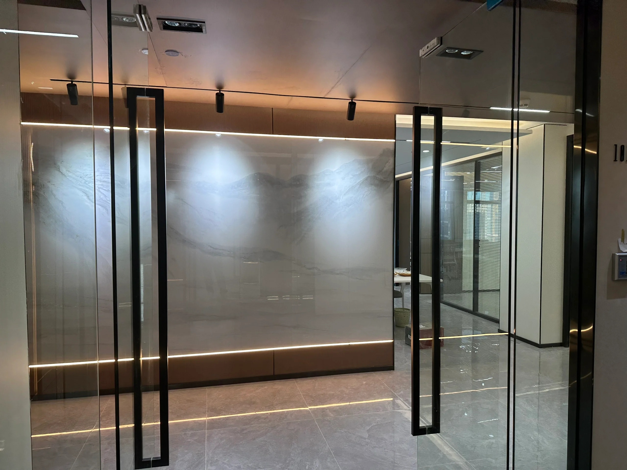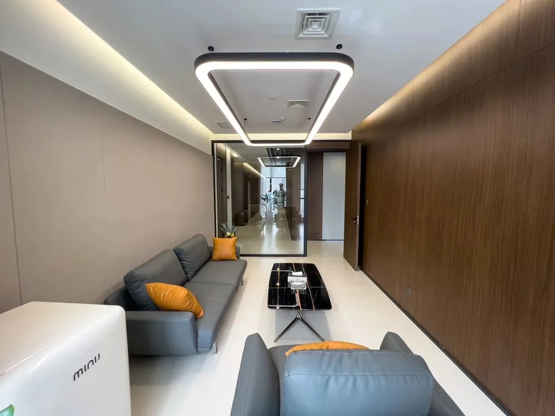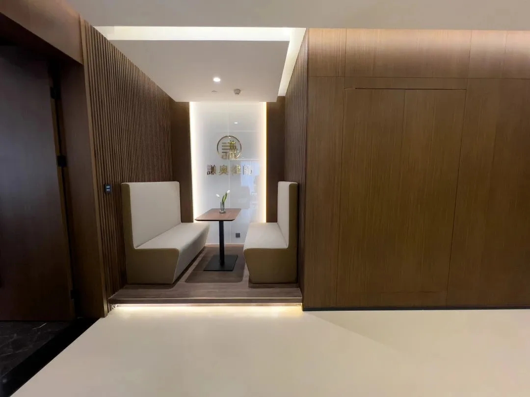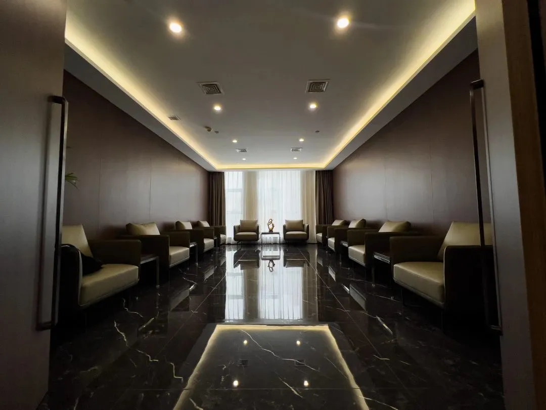 标准的接待室空间,要正式但又不能刻板严肃;在设计上,整体的格局规划是按照VIP接待室的规格出发,材质的使用做到内外统一,地面选择大块的仿大理石地砖提升质感,顶面造型采用了现在包容性比较强的叠级顶设计。