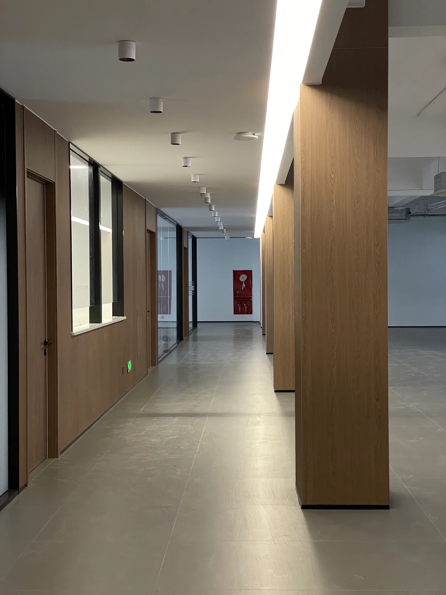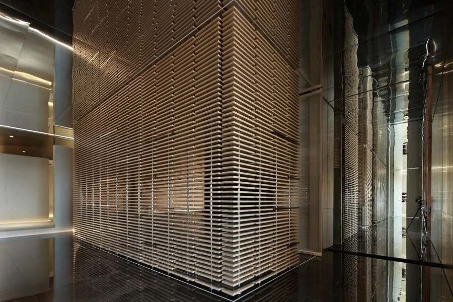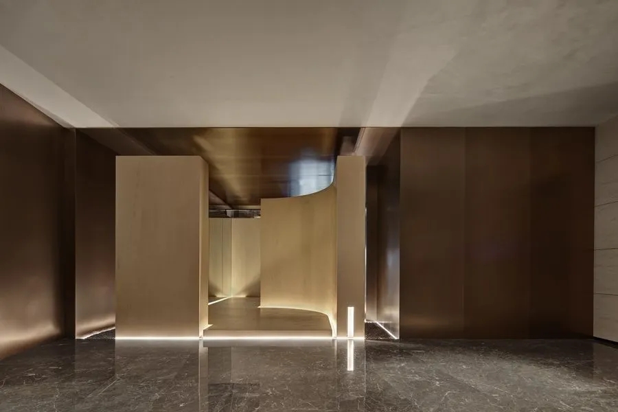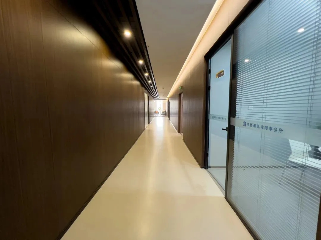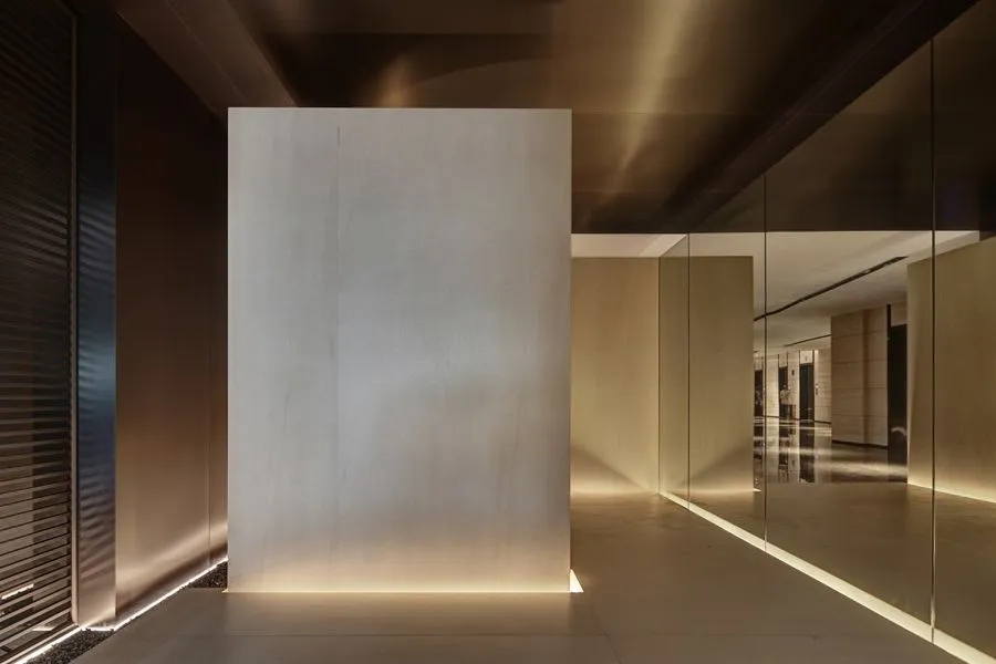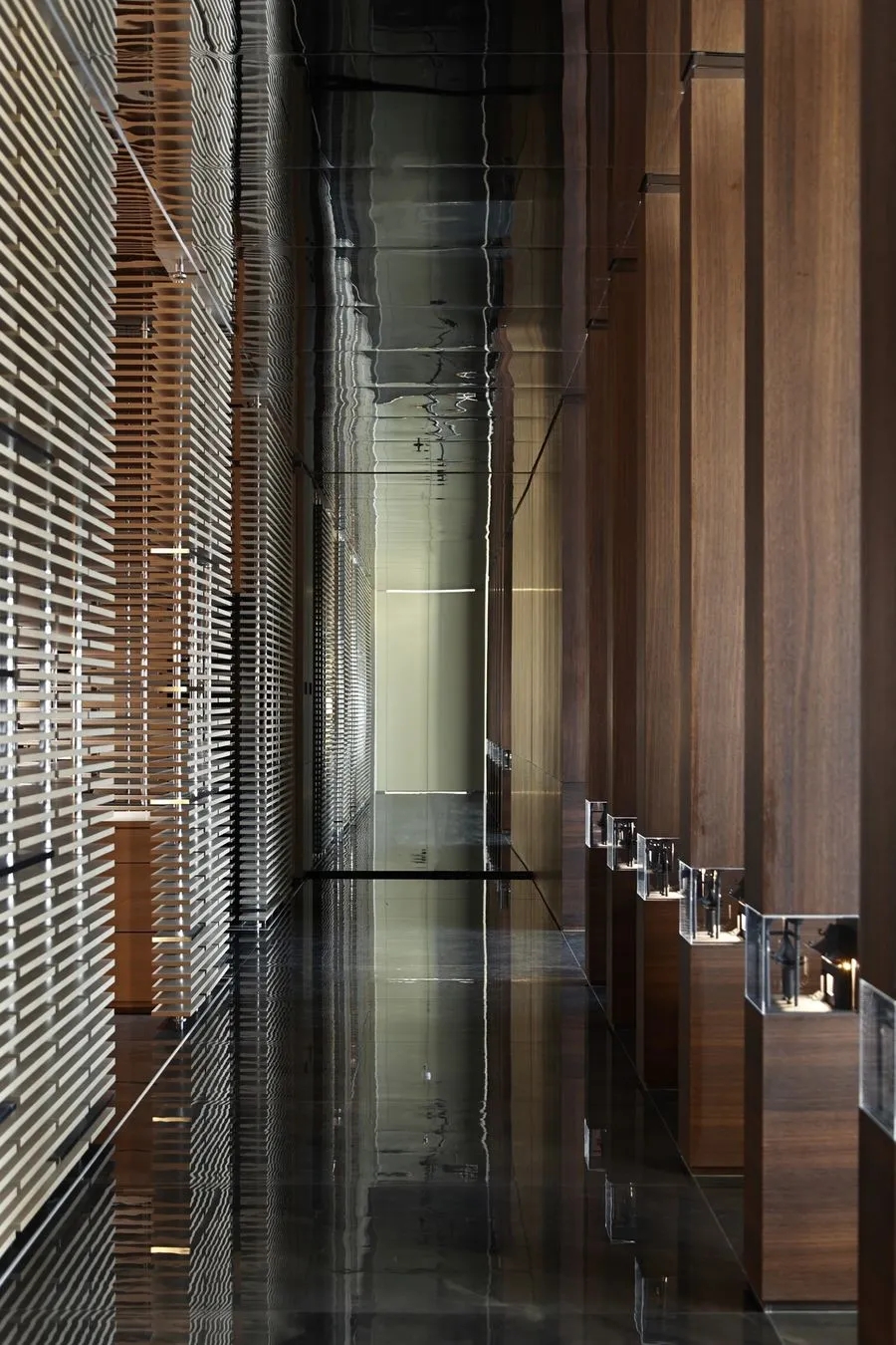 穿过门厅,第一视角便是窗外的曲江池遗址公园。设计师通过材质将窗外的曲江池景引入,营造出室内湖泊的效果,又以万众国际建筑外观映入水面为元素,形成办公区域的隔断。