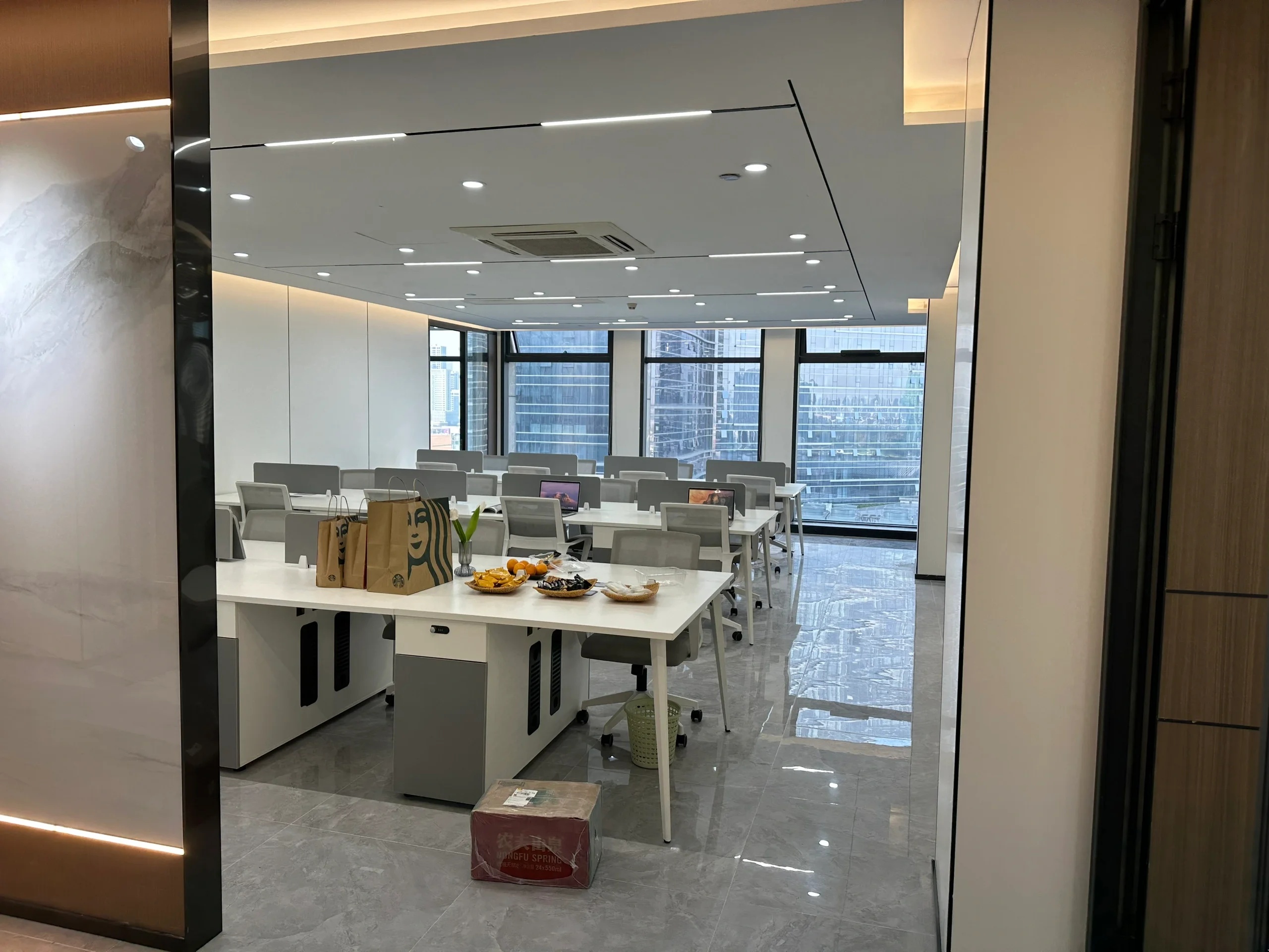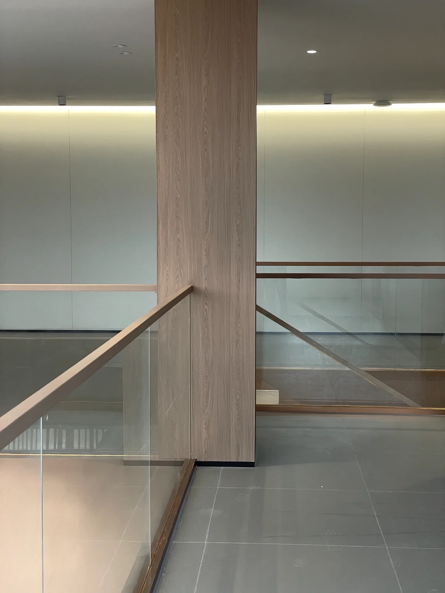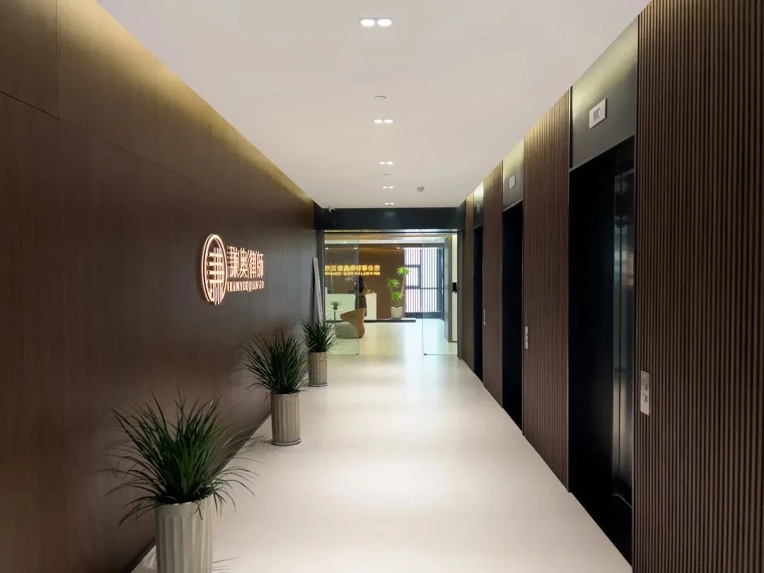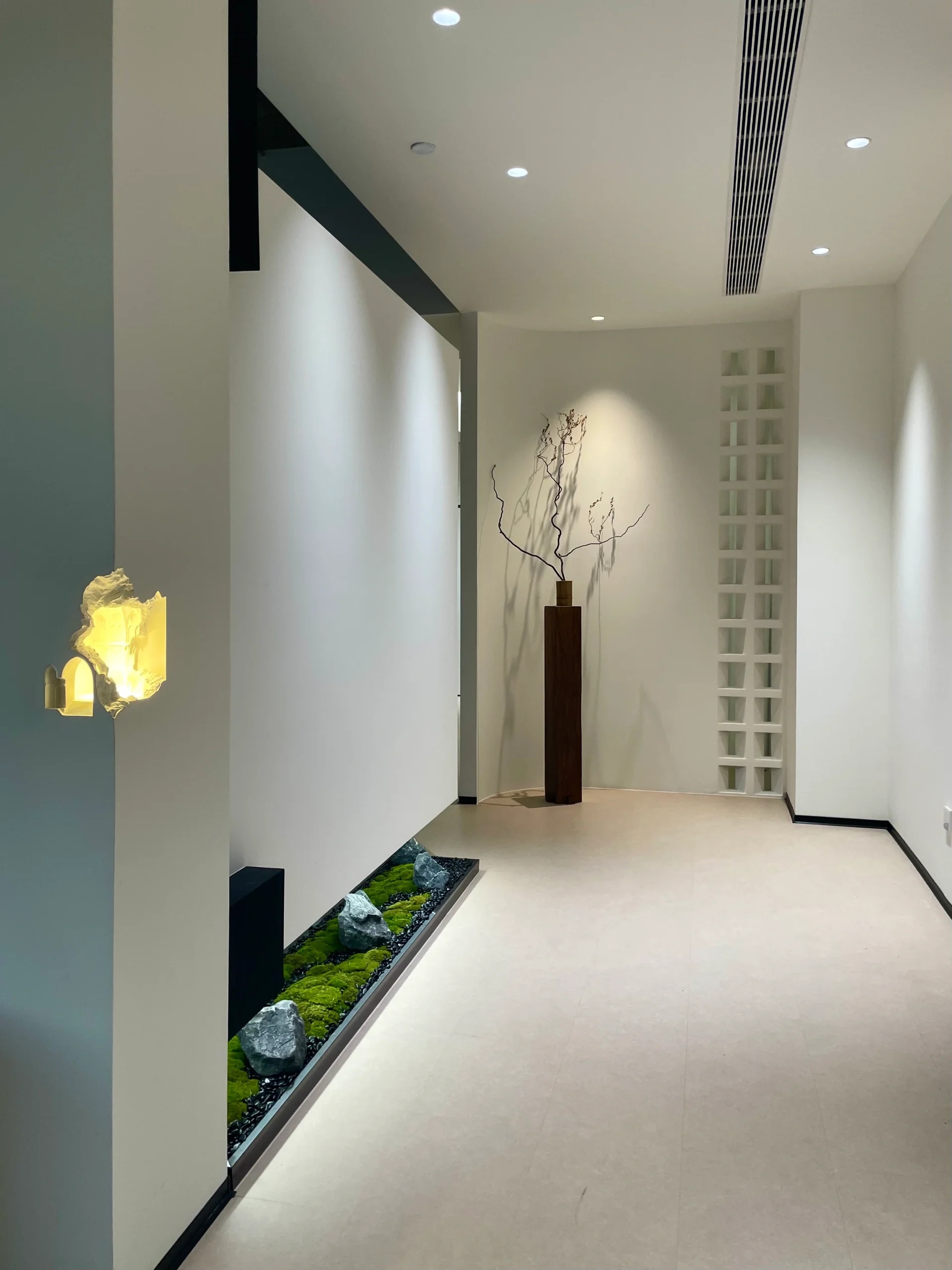 穿过门厅,第一视角便是窗外的曲江池遗址公园。设计师通过材质将窗外的曲江池景引入,营造出室内湖泊的效果,又以万众国际建筑外观映入水面为元素,形成办公区域的隔断。