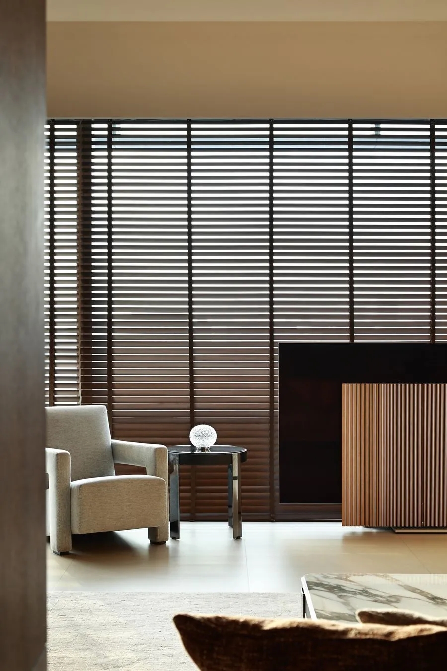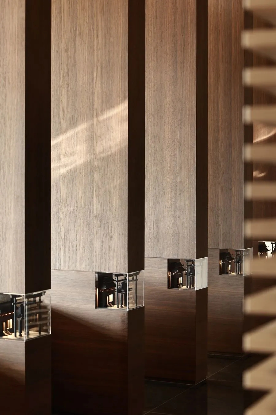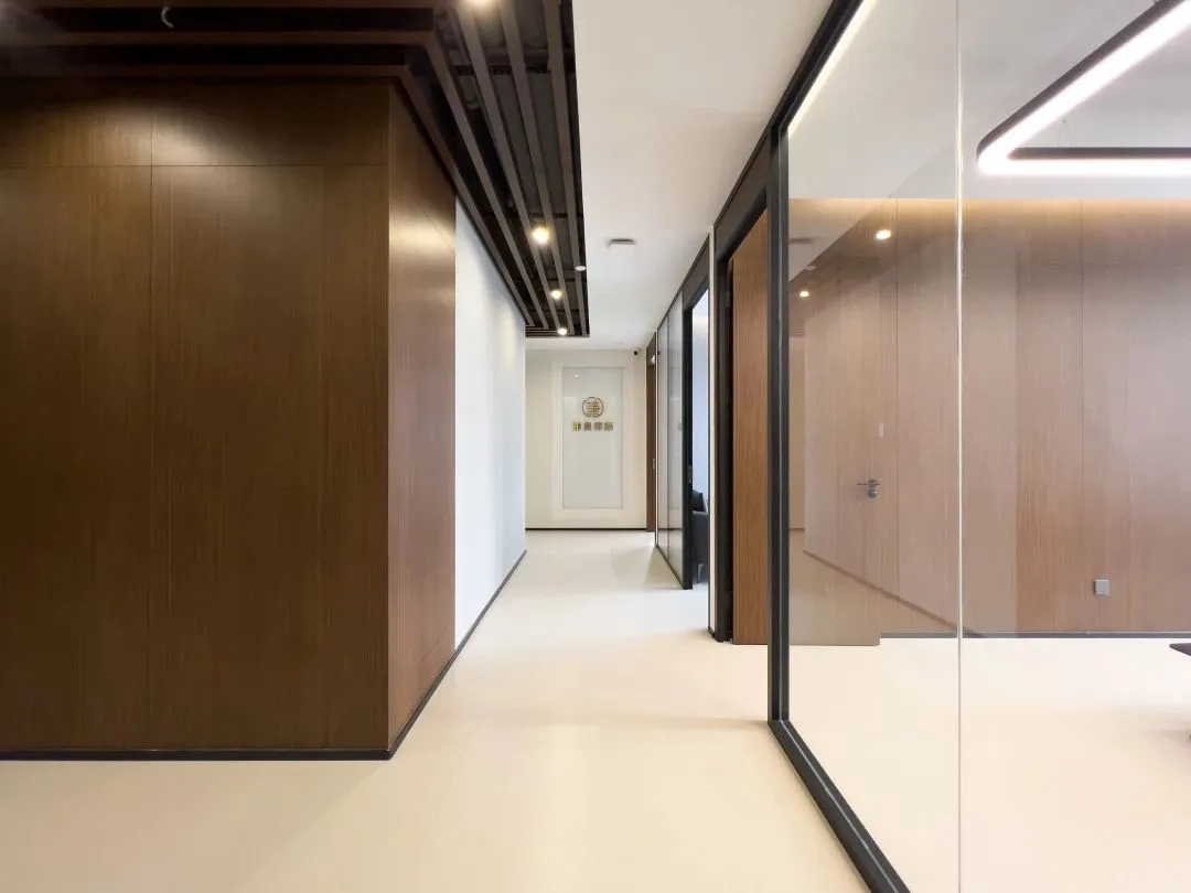 预留出律师职业照及荣誉奖章展示空间;另外选用与木饰面同色的格栅做到内外统一,不显单调;所有的门体选择通顶,视觉表现上使得整体感更强。