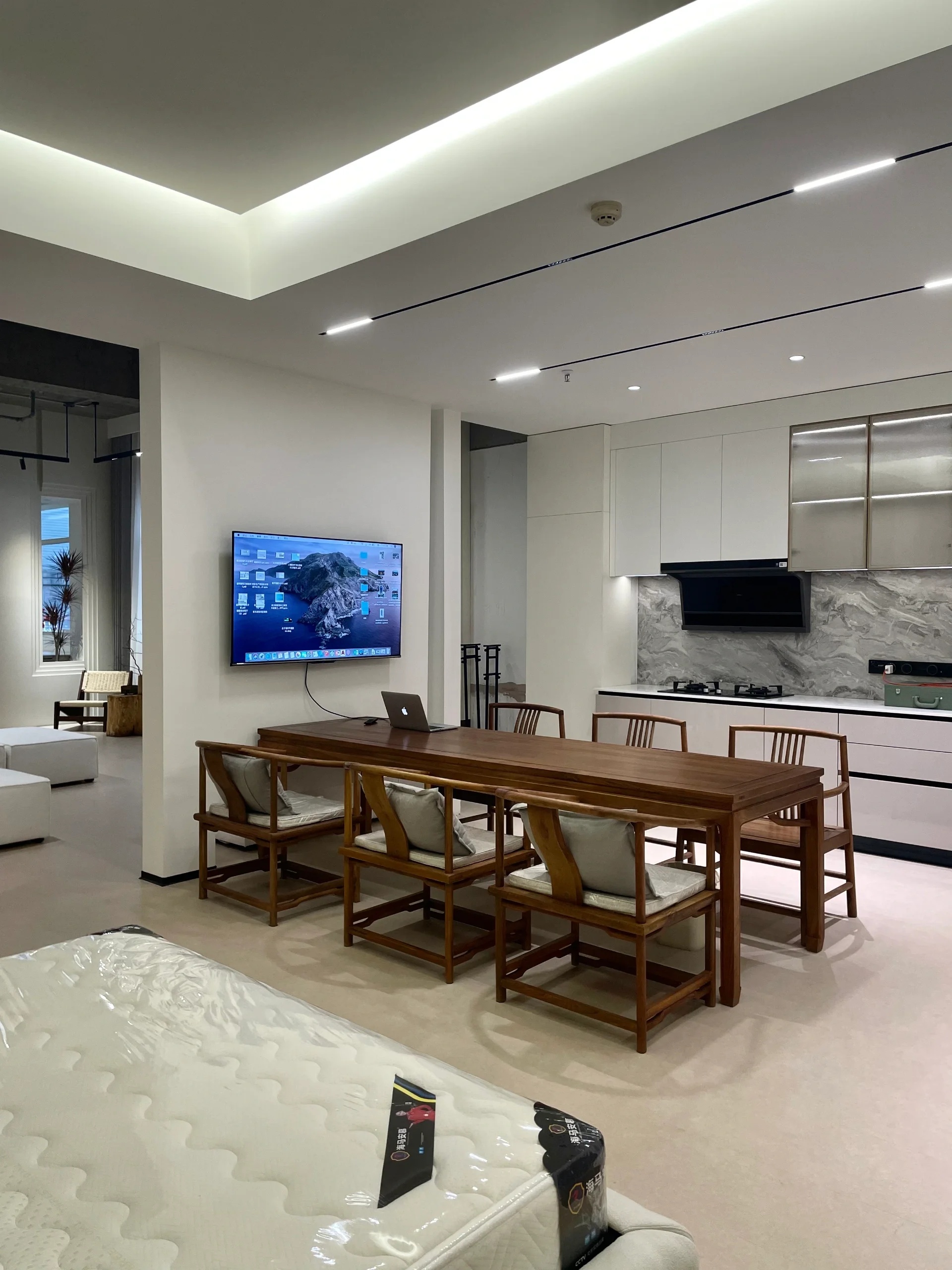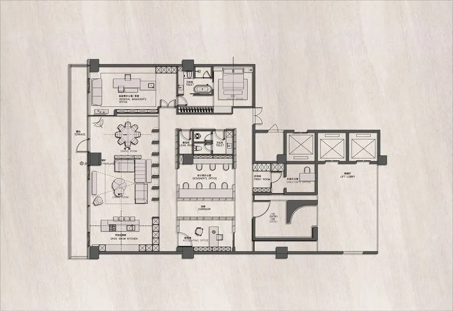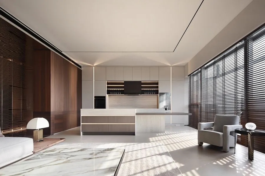 开放式厨房,将东方饮食礼仪纳入其中,厨房中岛可供吧台小酌或冷餐用餐的情境设定,满足不同的需求,展现空间的多元性。相聚其中,在这里得到良好的体验感,在这里感受到自己的价值,让工作不止为办公而来。