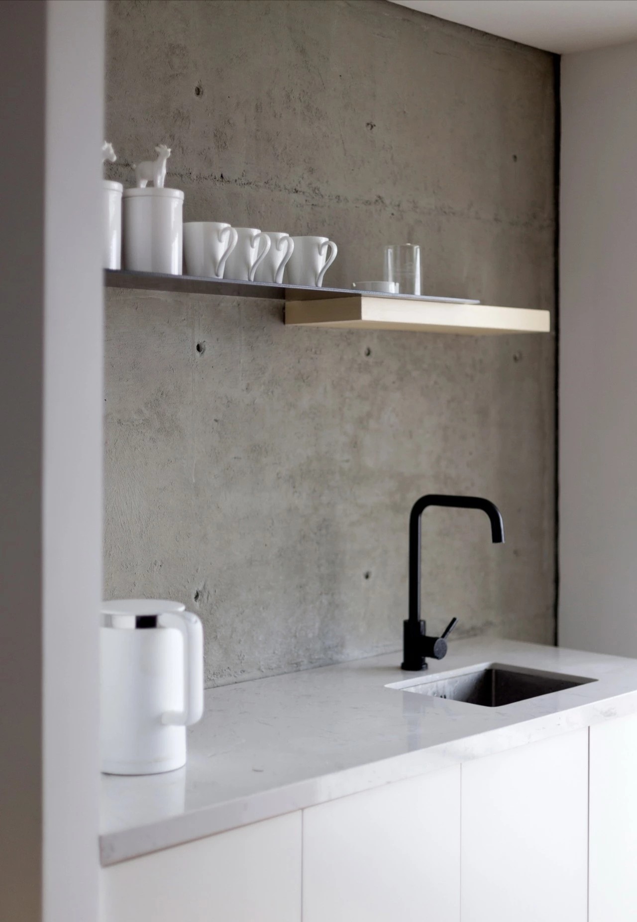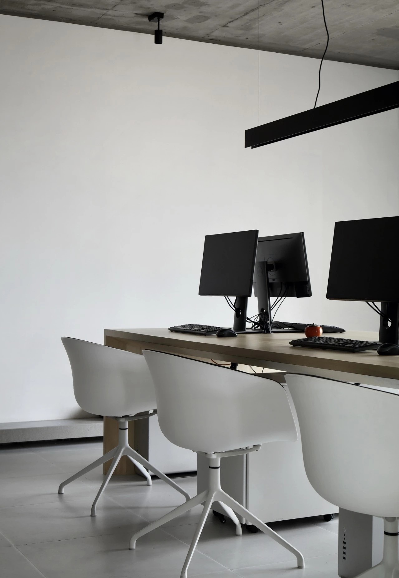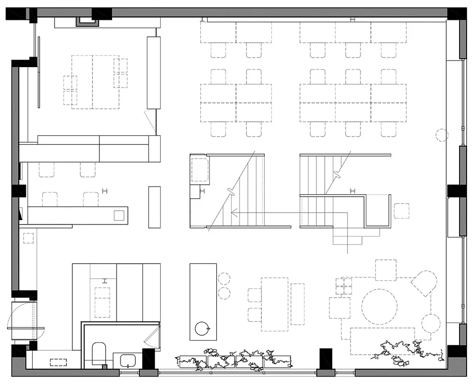工作区占用最开阔的范围,围绕工作区设置辅助功能。我们把整个室内天花原有的白色抹灰铲除,暴露出建筑的混凝土框架和顶板,而新介入的白色L形墙体,强调区域围合,我们在办公区搭建了一个3.6m的长桌贯穿至下个空间。