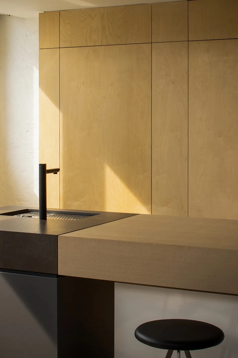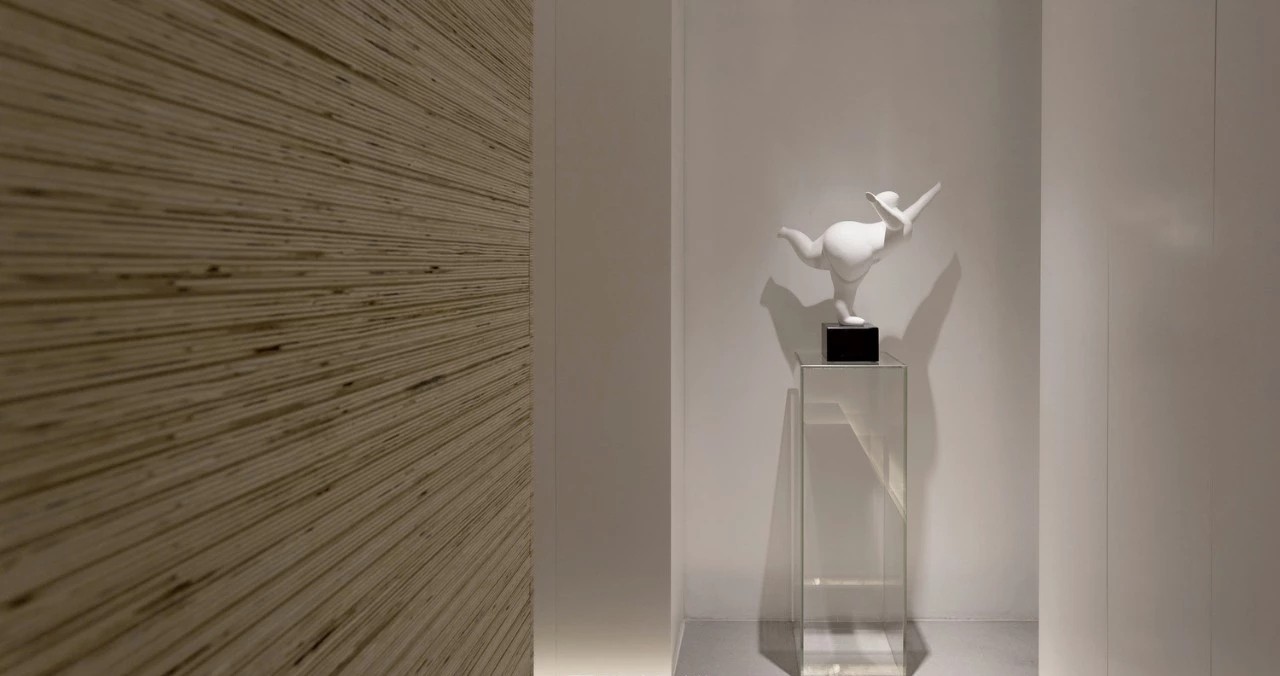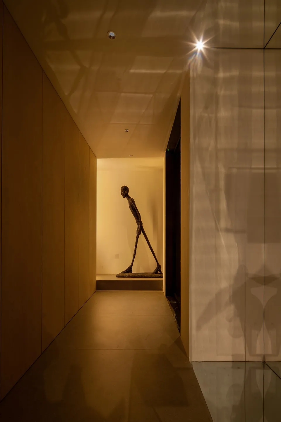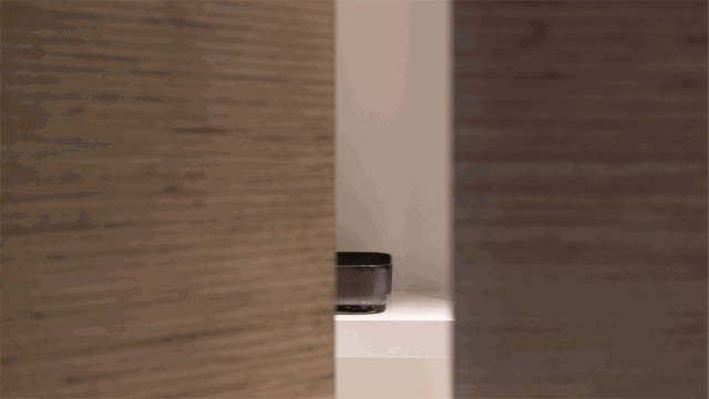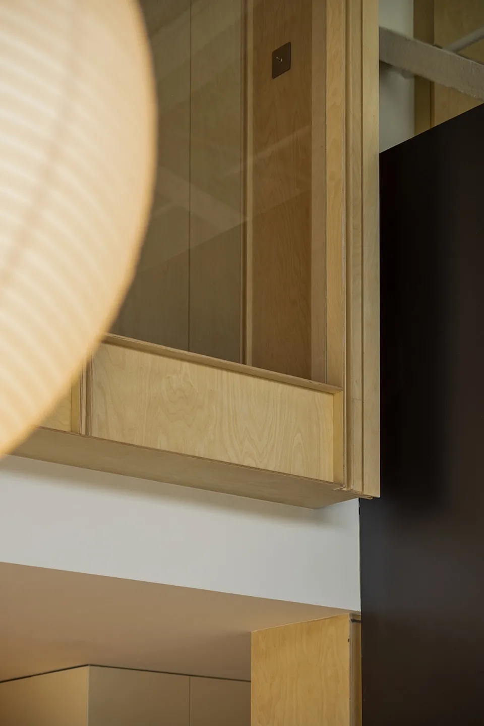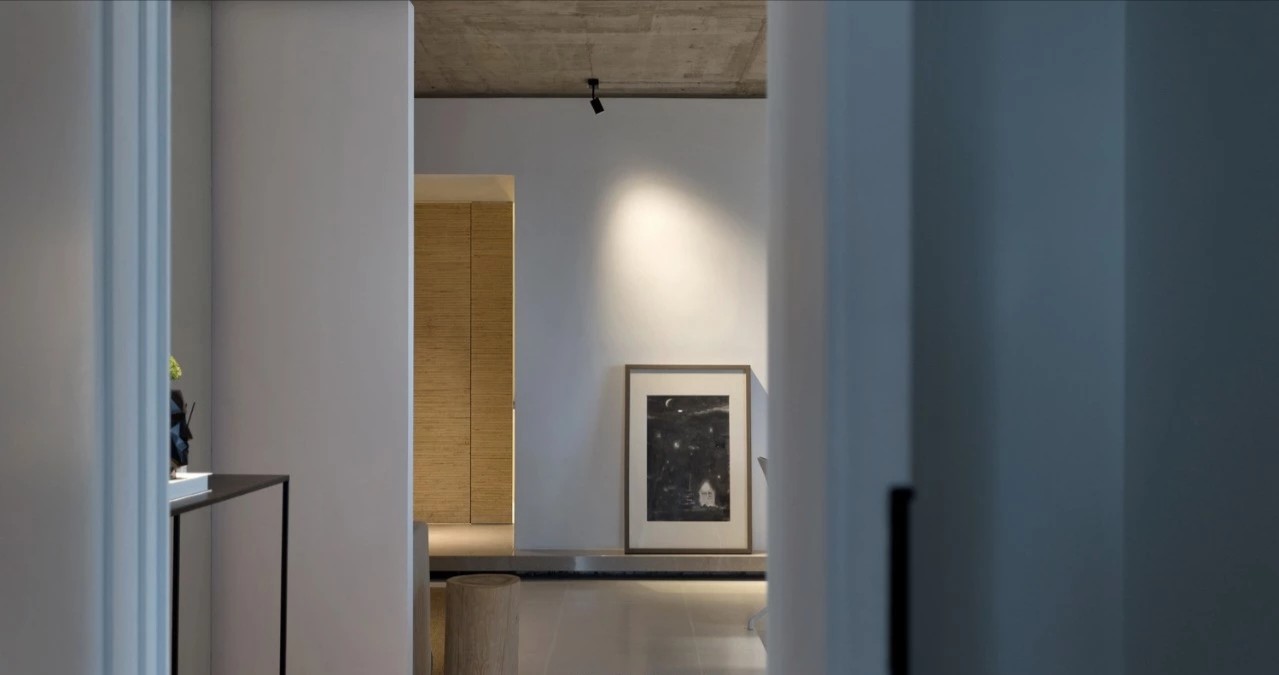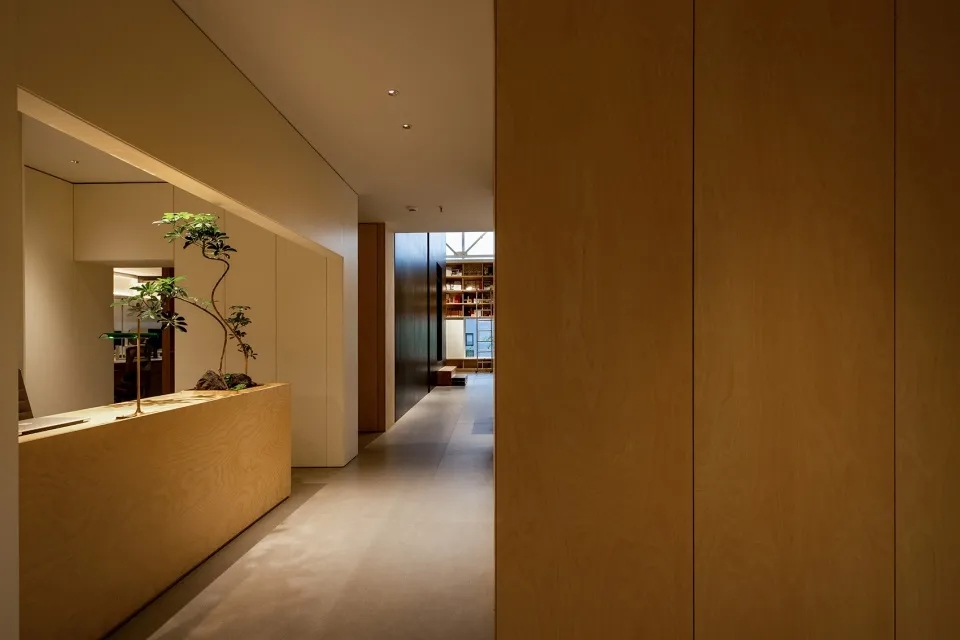 入口的戏剧感始于一个围绕木盒子的狭窄通道,需经过刻意曲折的廊道多次转折后进入内部空间,行进距离的时间过程中摆脱居住楼的固有环境印象并整理出新的空间情绪。